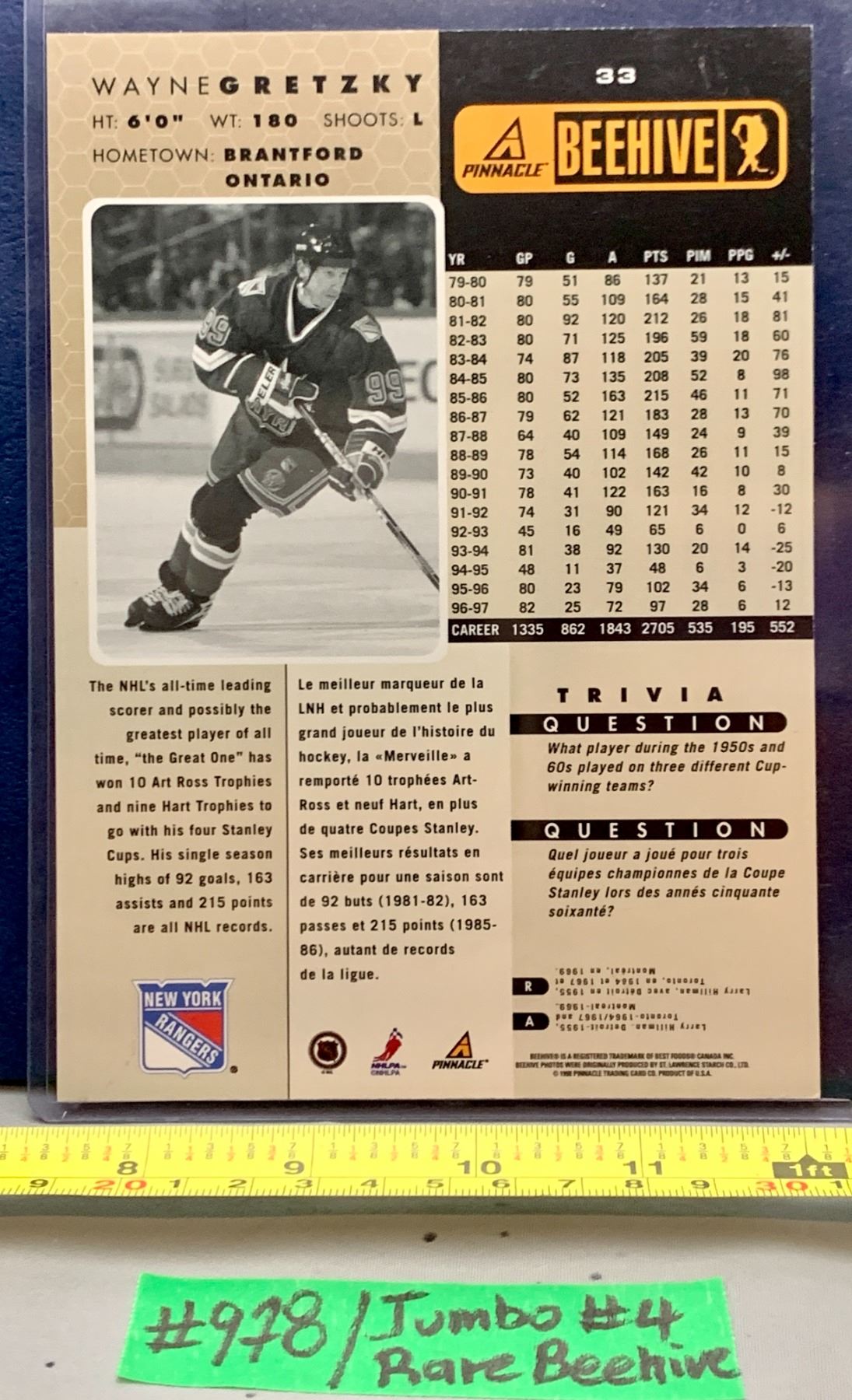 NHL HOCKEY - Wayne Gretzky Rare Pinnacle BeeHive Jumbo Card in Top Loader