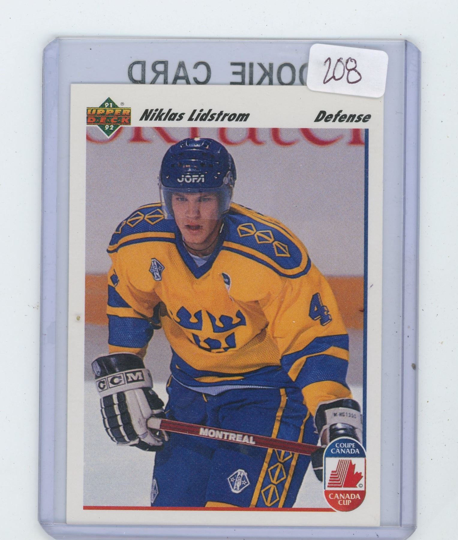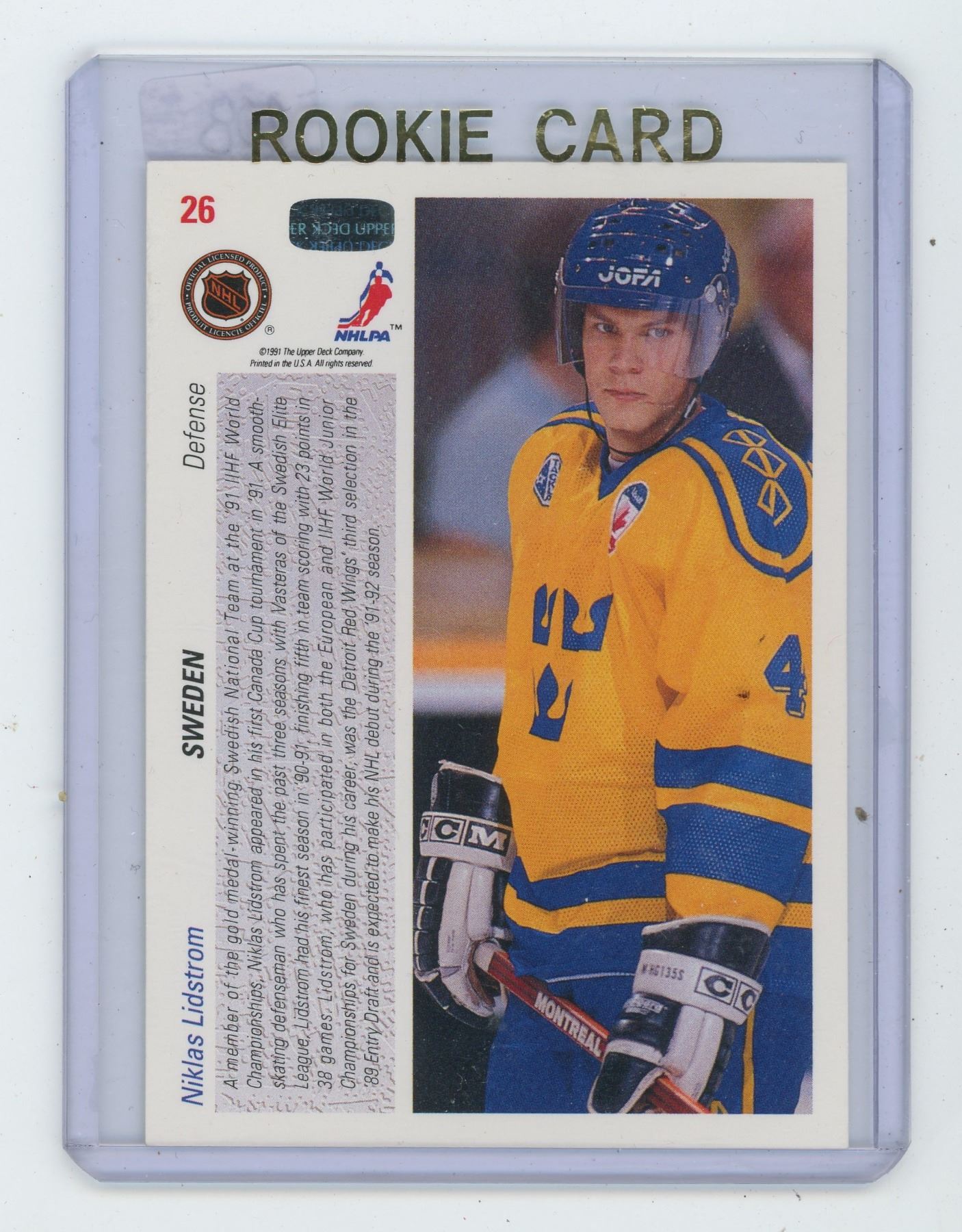 NIKLAS LIDSTRORM, SWEDISH NATIONAL TEAM, CANADA CUP GOLD MEDAL WINNER HOCKEY CARD. 1991 UPPER DECK. GEM UNC.