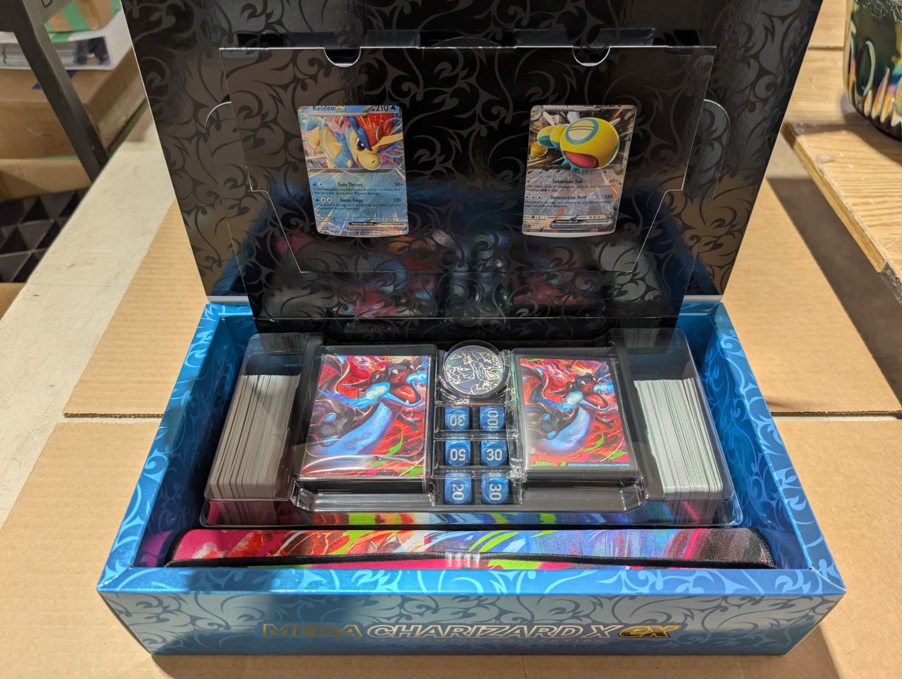 NOT SEALED/OPENED PACKS Pokemon TCG "Mega Charizard X EX" Ultra Premium Collection Box w/ Assortment of Pokemon Cards (2) Featured Cards, Dice and Mat (Never Used)