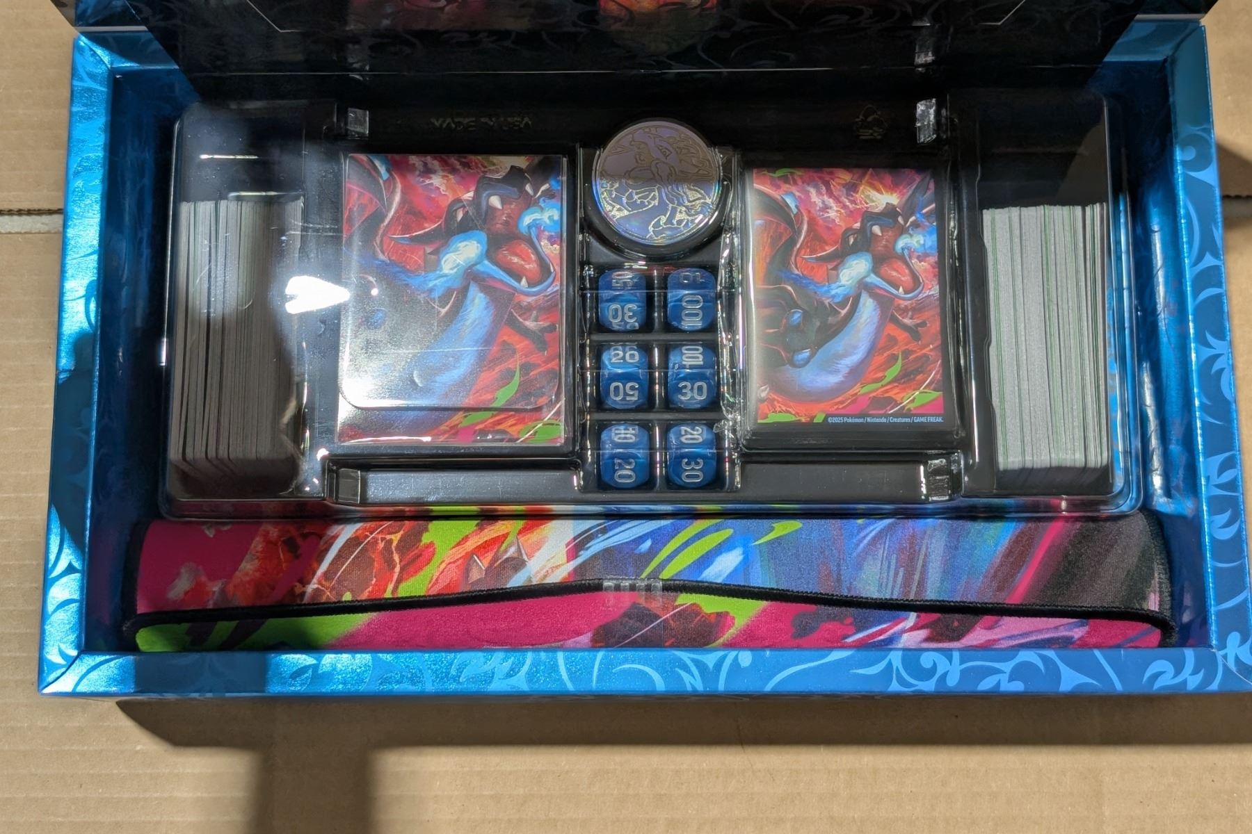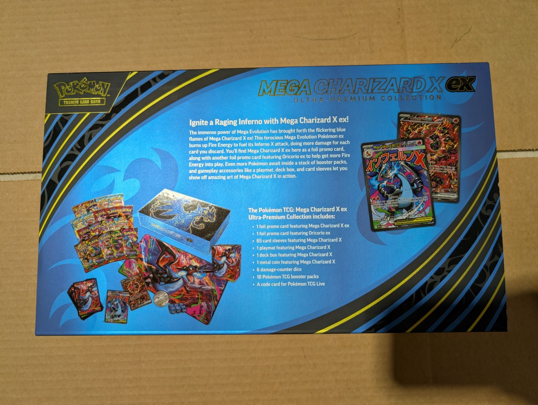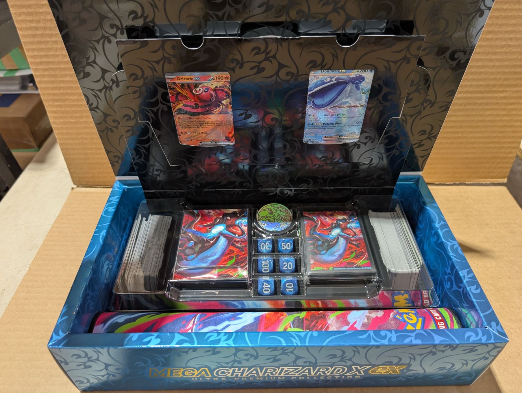 NOT SEALED/OPENED PACKS Pokemon TCG "Mega Charizard X EX" Ultra Premium Collection Box w/ Assortment of Pokemon Cards (2) Featured Cards, Dice and Mat (Never Used)