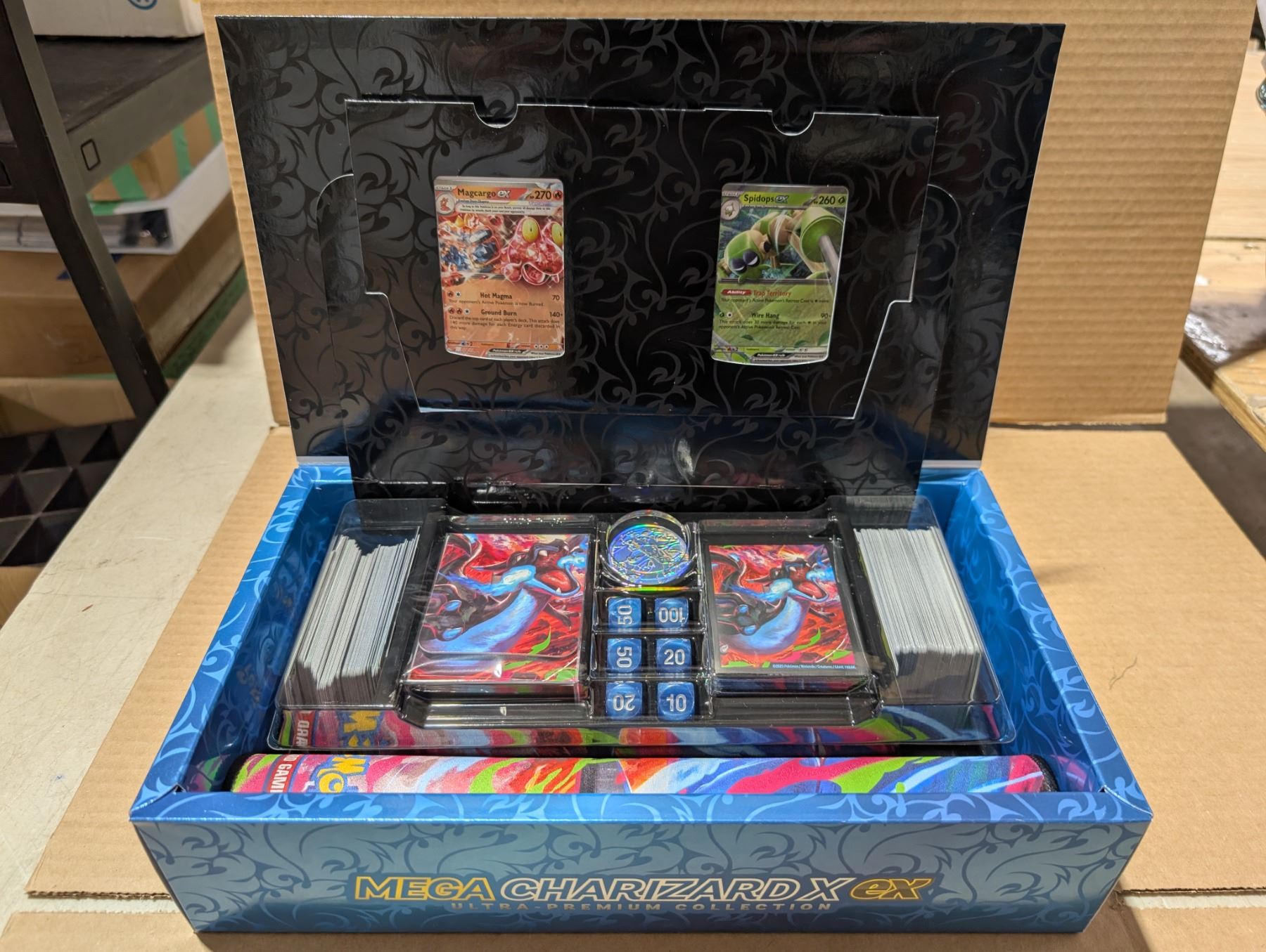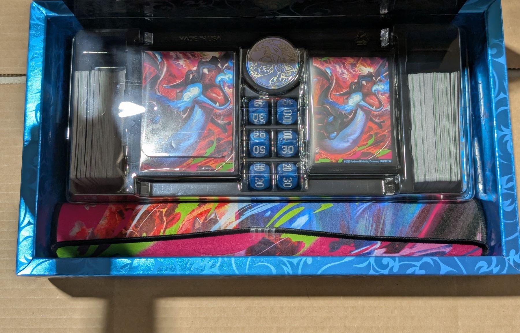 NOT SEALED/OPENED PACKS Pokemon TCG "Mega Charizard X EX" Ultra Premium Collection Box w/ Assortment of Pokemon Cards (2) Featured Cards, Dice and Mat (Never Used)
