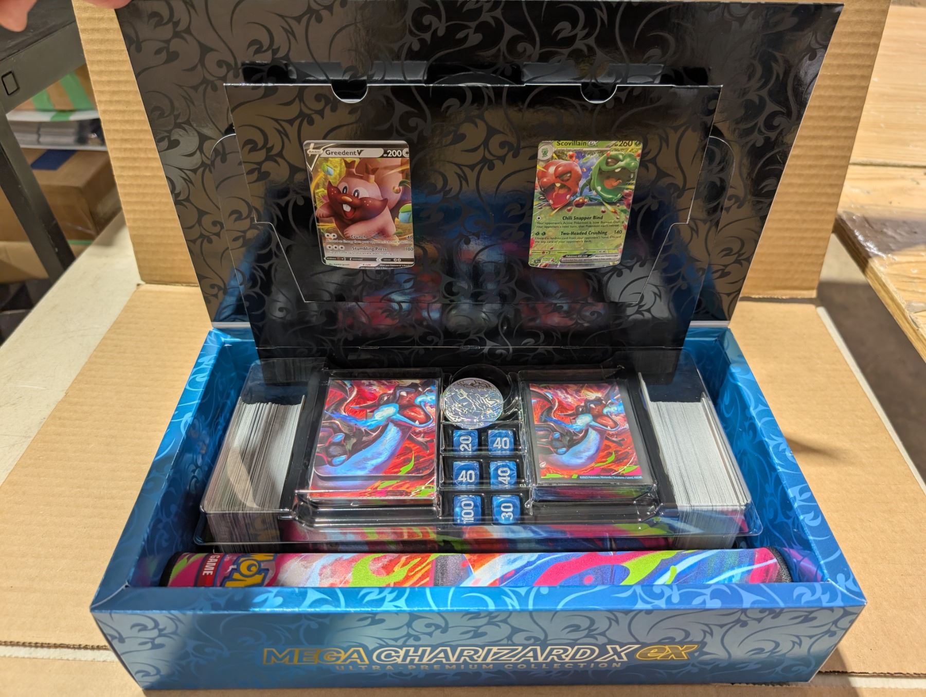 NOT SEALED/OPENED PACKS Pokemon TCG "Mega Charizard X EX" Ultra Premium Collection Box w/ Assortment of Pokemon Cards (2) Featured Cards, Dice and Mat (Never Used)