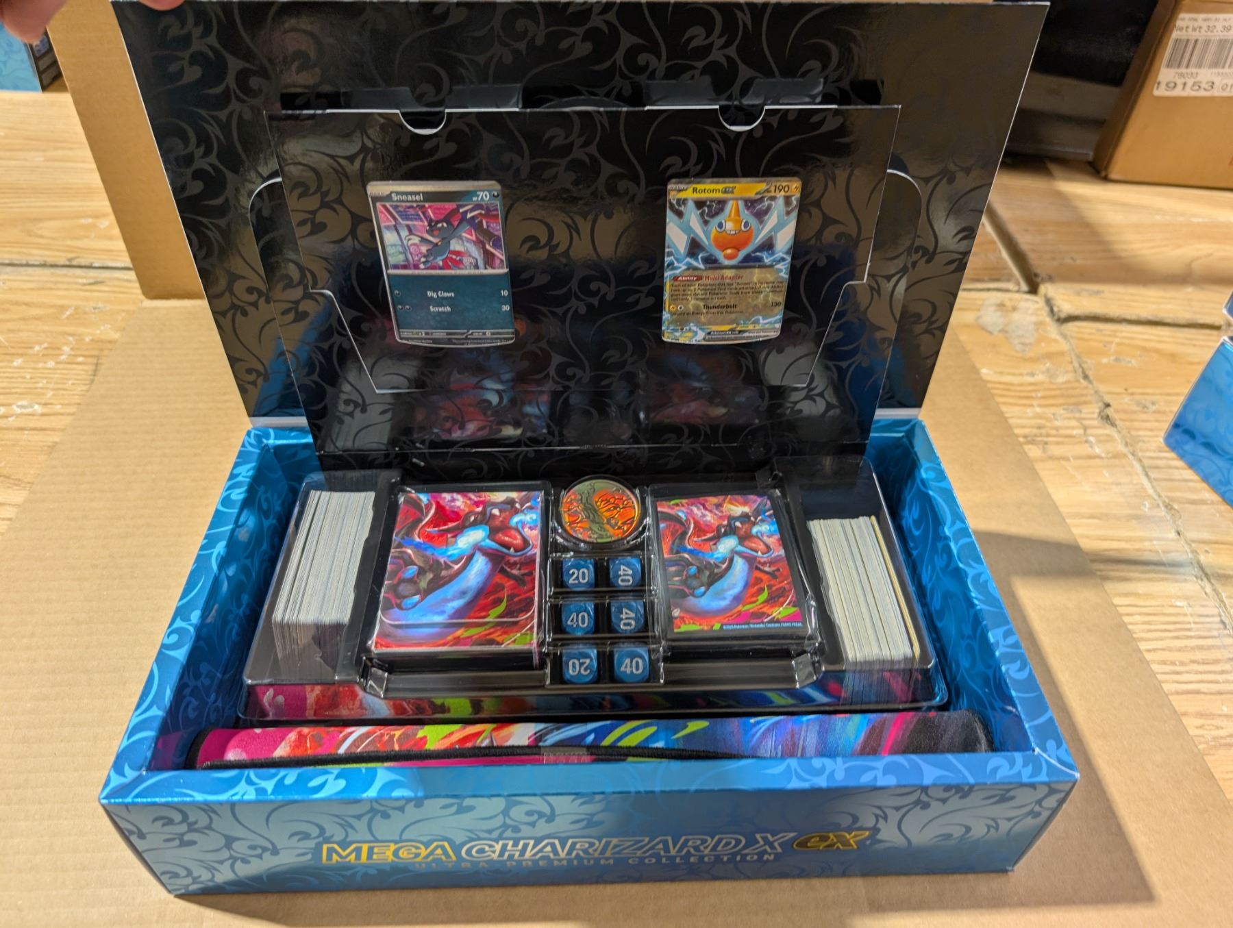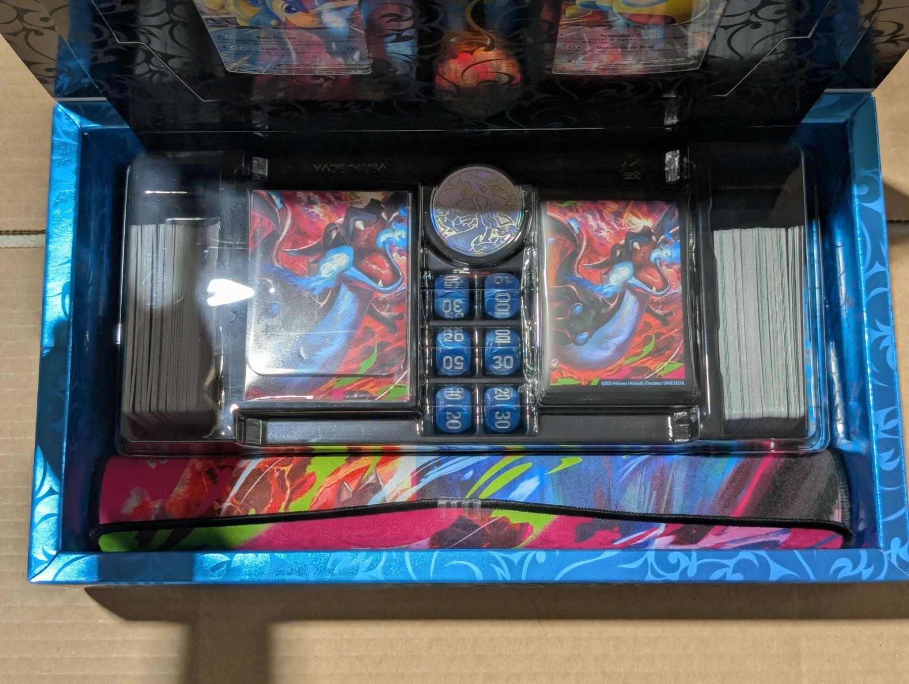 NOT SEALED/OPENED PACKS Pokemon TCG "Mega Charizard X EX" Ultra Premium Collection Box w/ Assortment of Pokemon Cards (2) Featured Cards, Dice and Mat (Never Used)