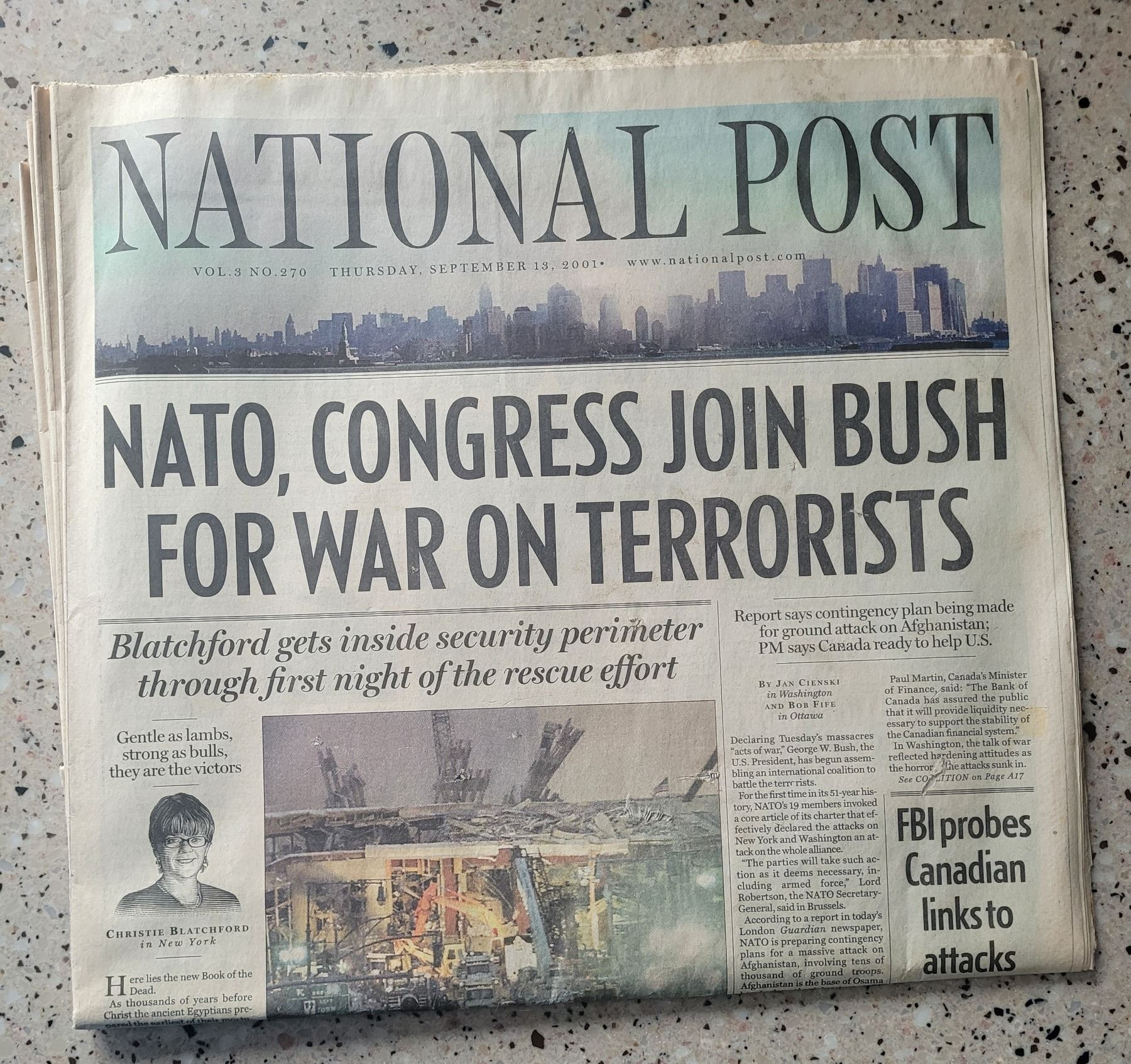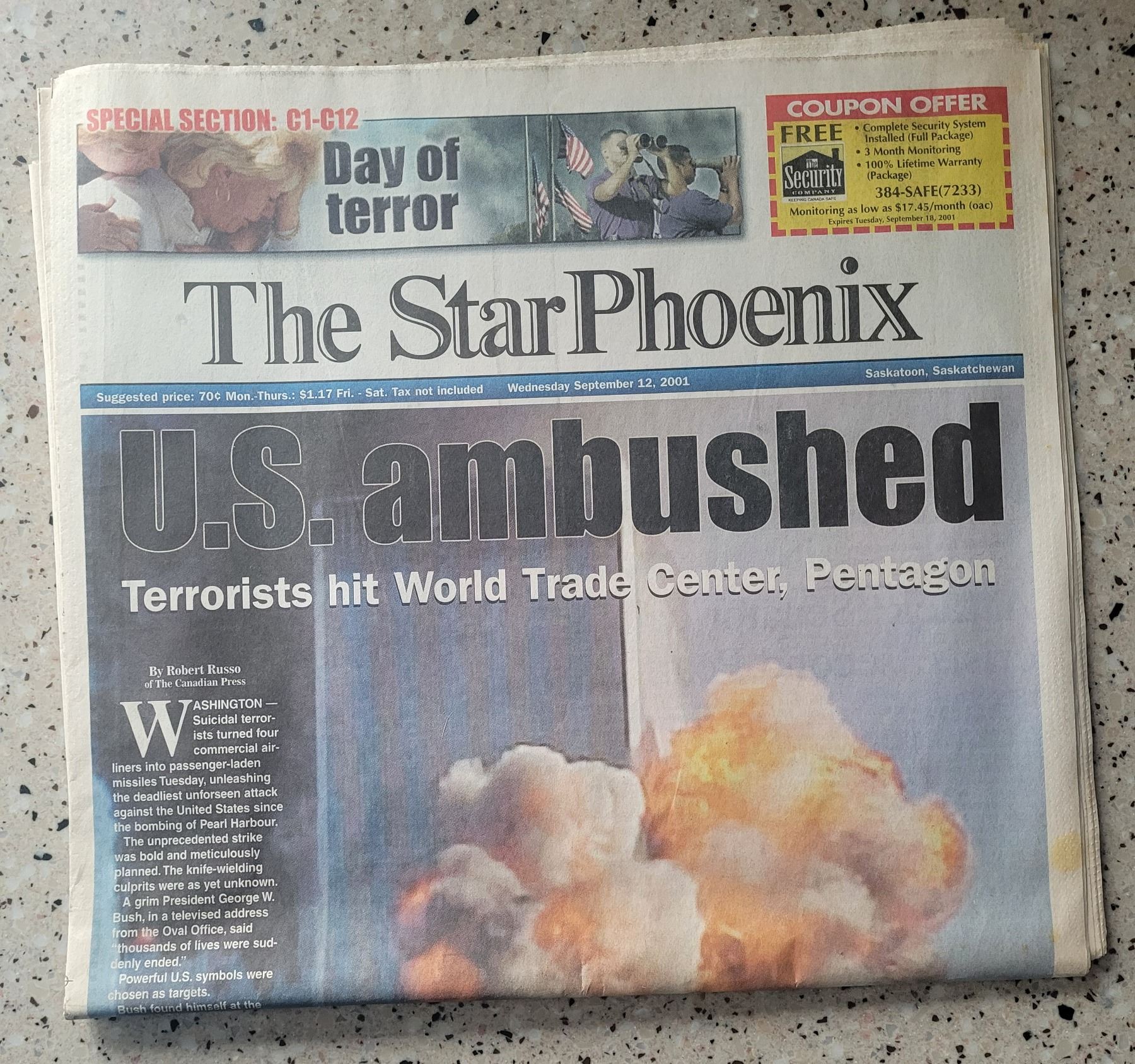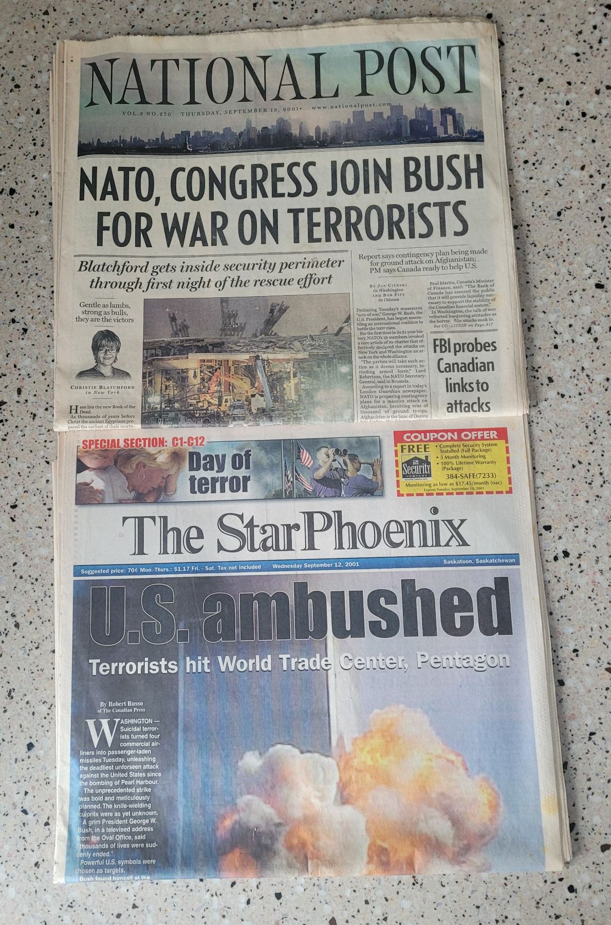 National Post newspaper September 13, 2001and StarPhoenix newspaper September 12 2001. Both complete with full coverage of 9/11 attacks in U.S.. Perfect condition
