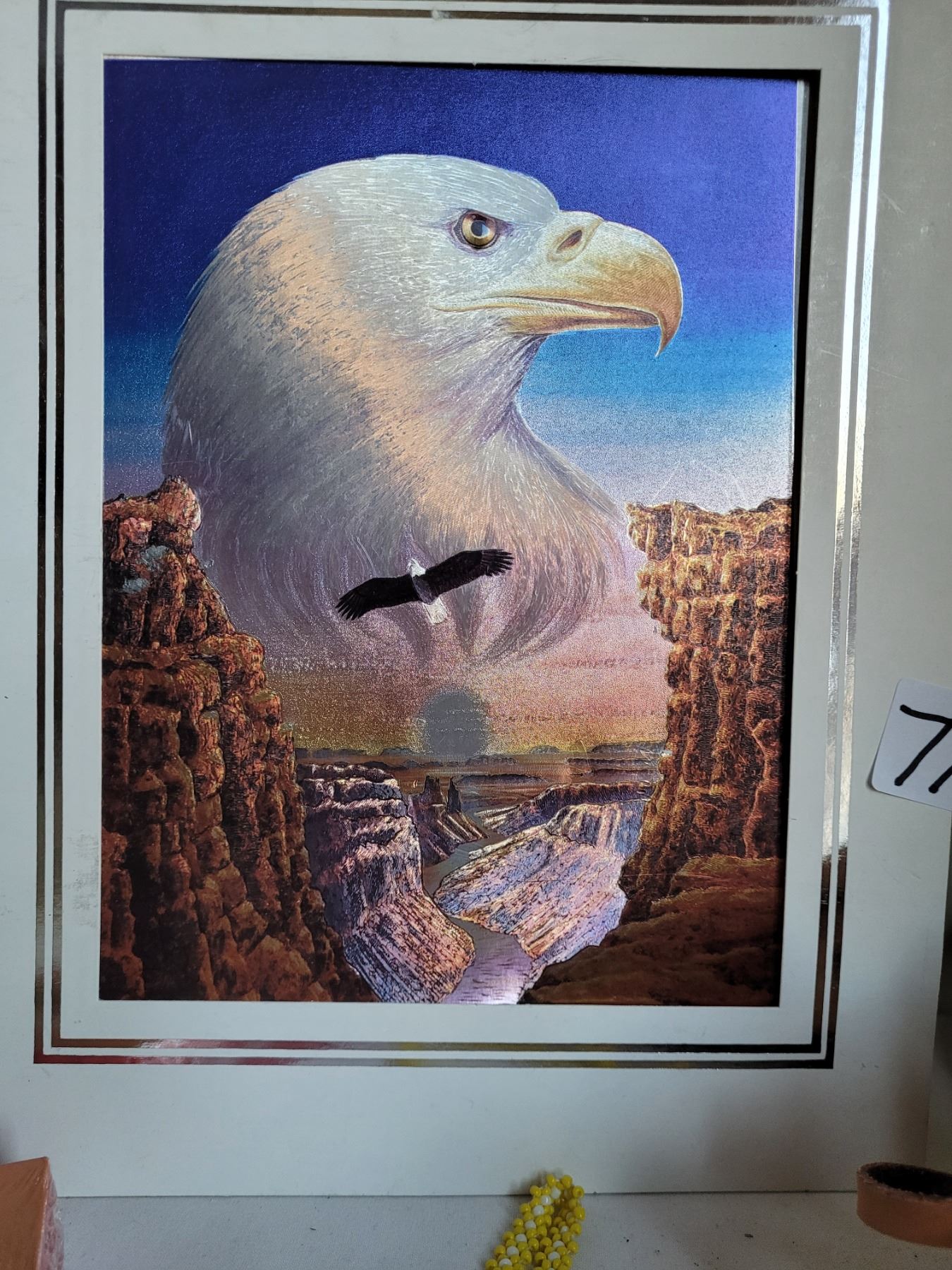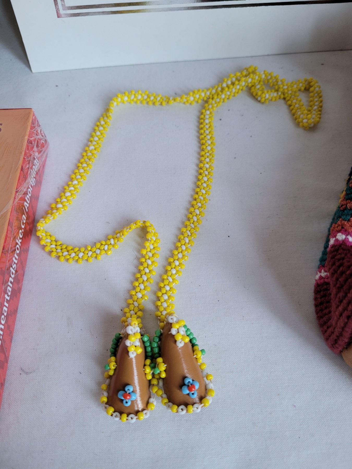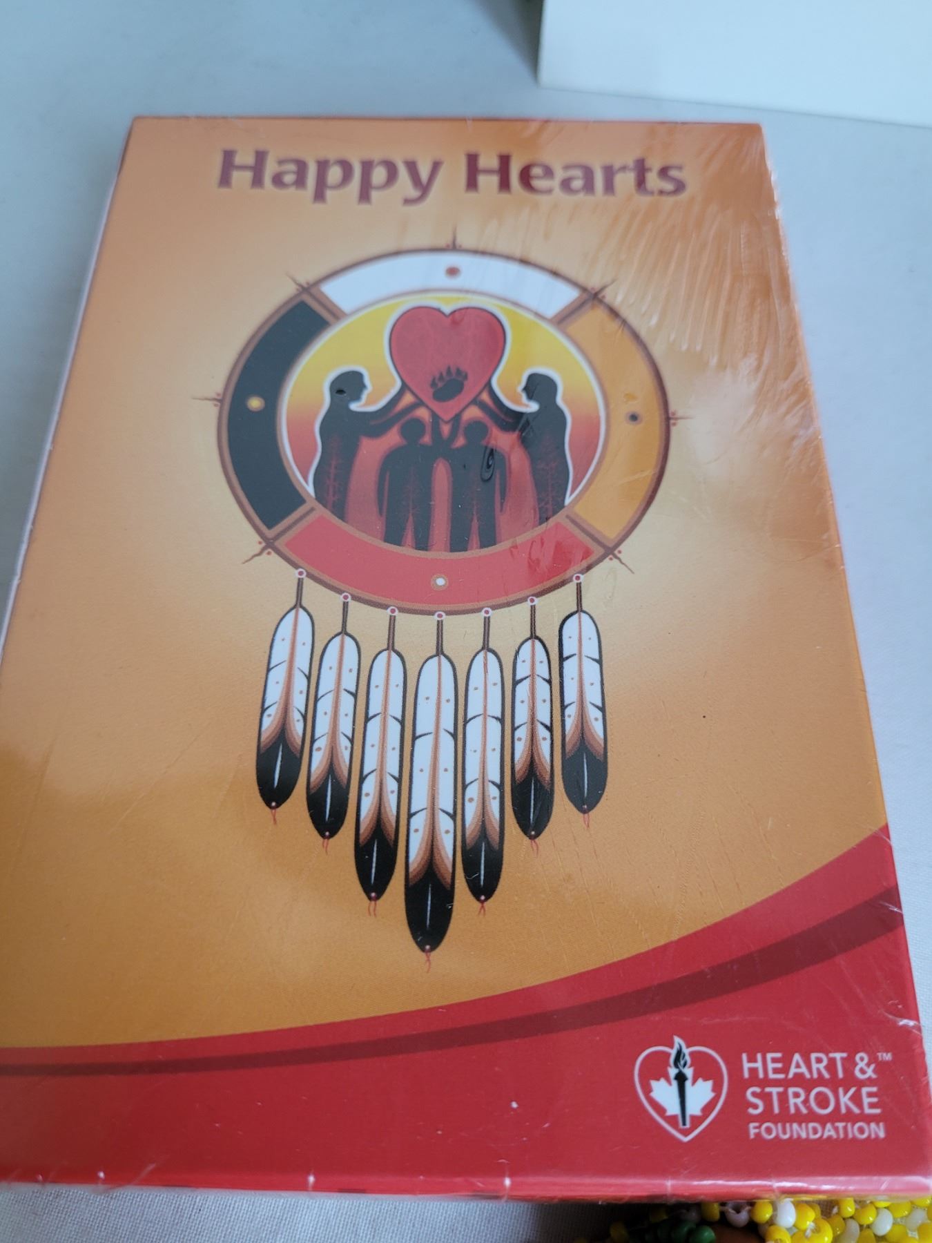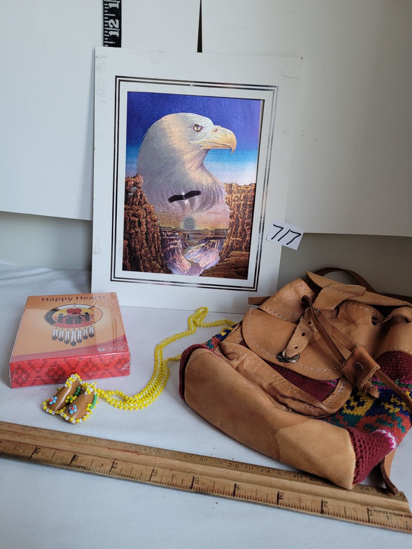 Native foil eagle,Happy Hearts card game, small leather backpack & beaded moccasin neck ware.