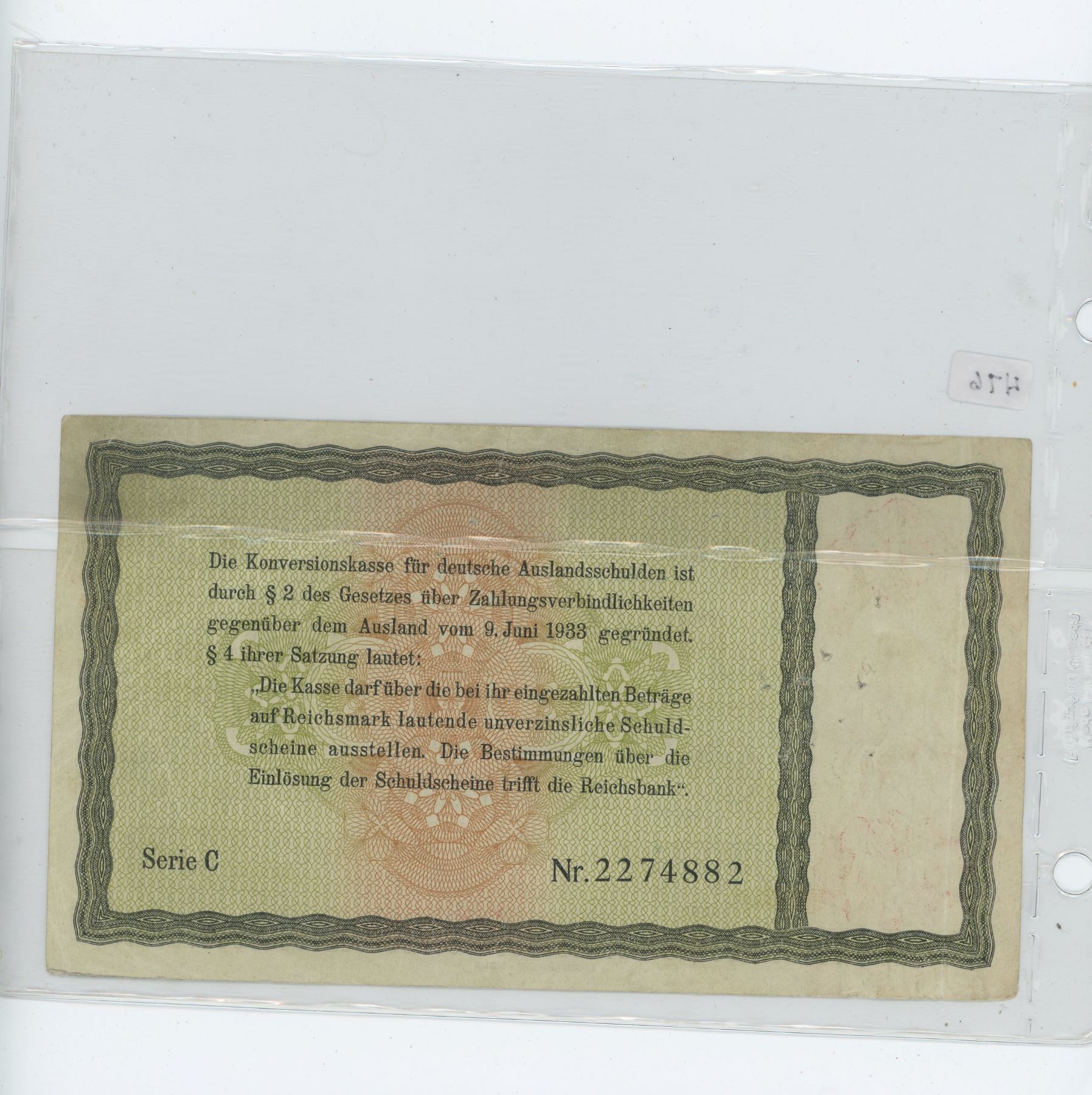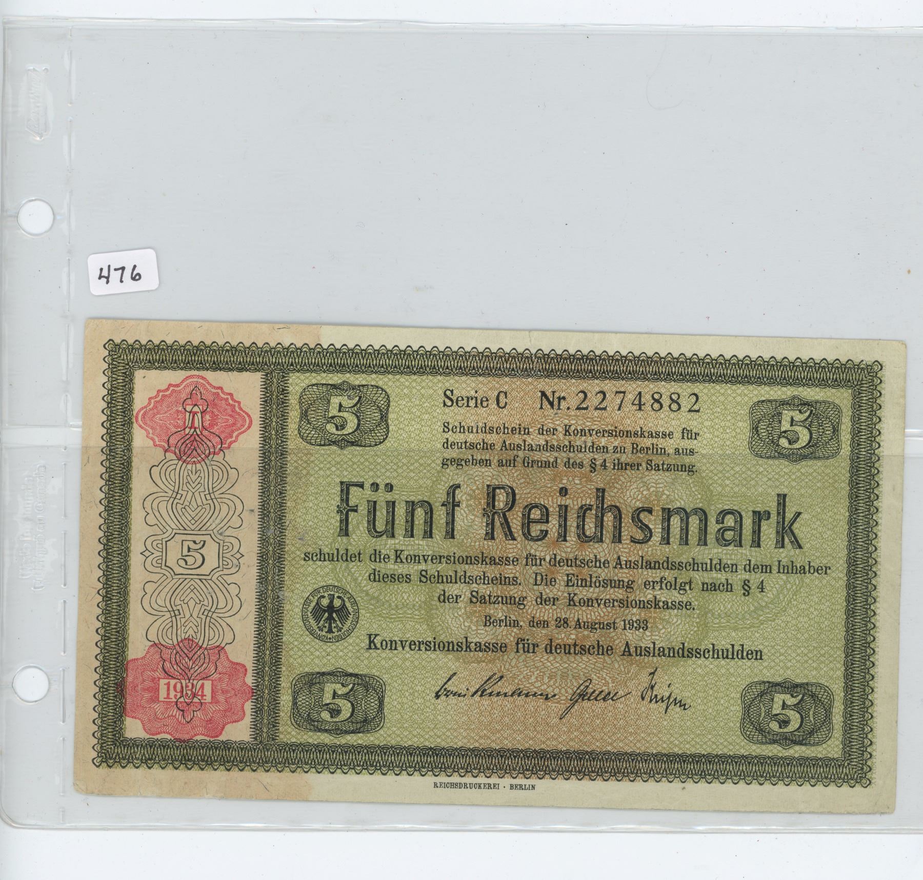 Nazi Germany 1933/1934 5 Reichsmark Conversion note. VF-20.