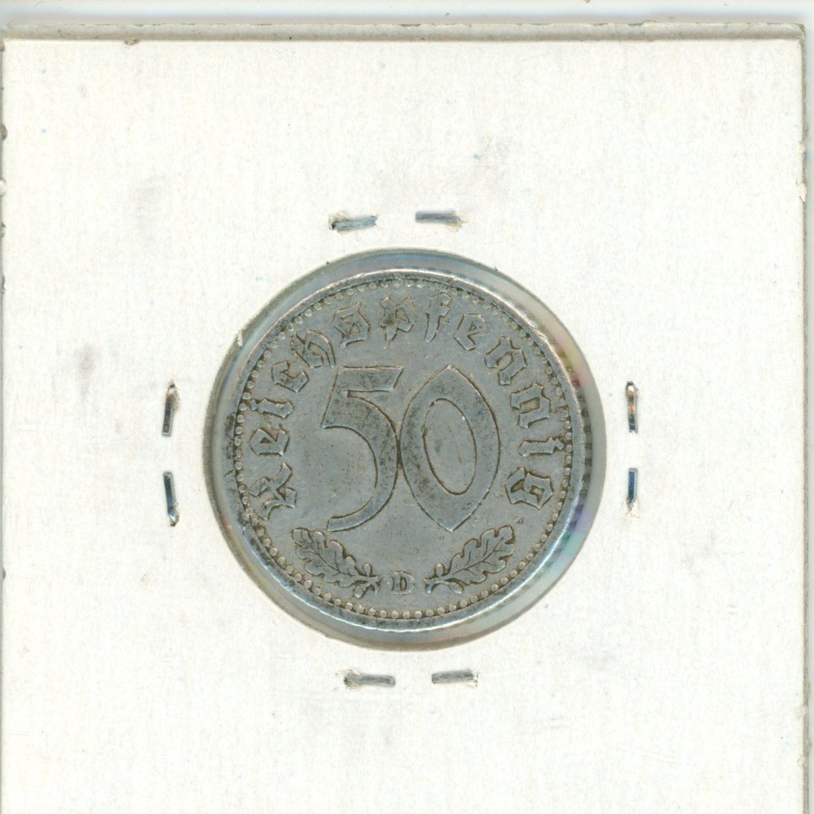 Nazi Germany – Third Reich. 1940D 50 Reichspfennig. Eagle with Swastika. Munich Mint. VF.