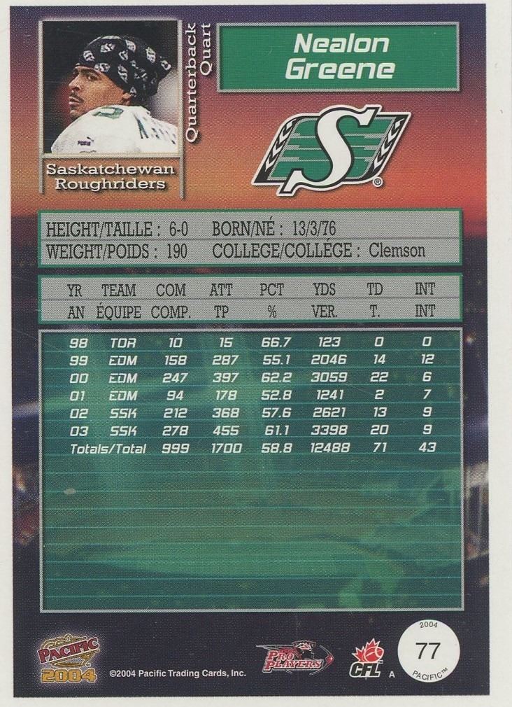 Nealon Green, QB, Saskatchewan Roughriders. CFL Football card. 2004 Pacific Trading Cards. Gem Unc.