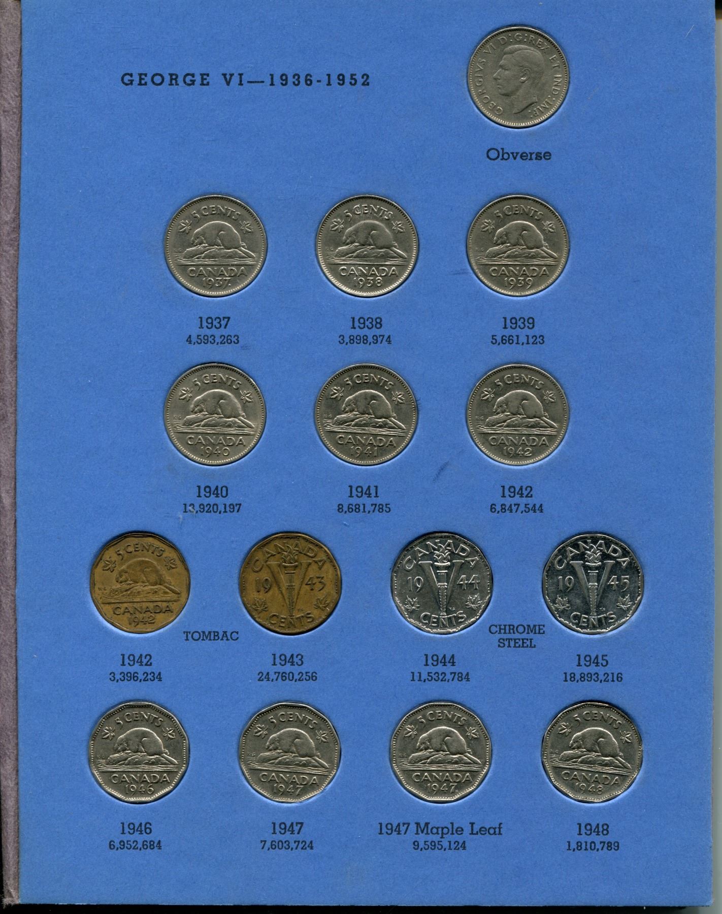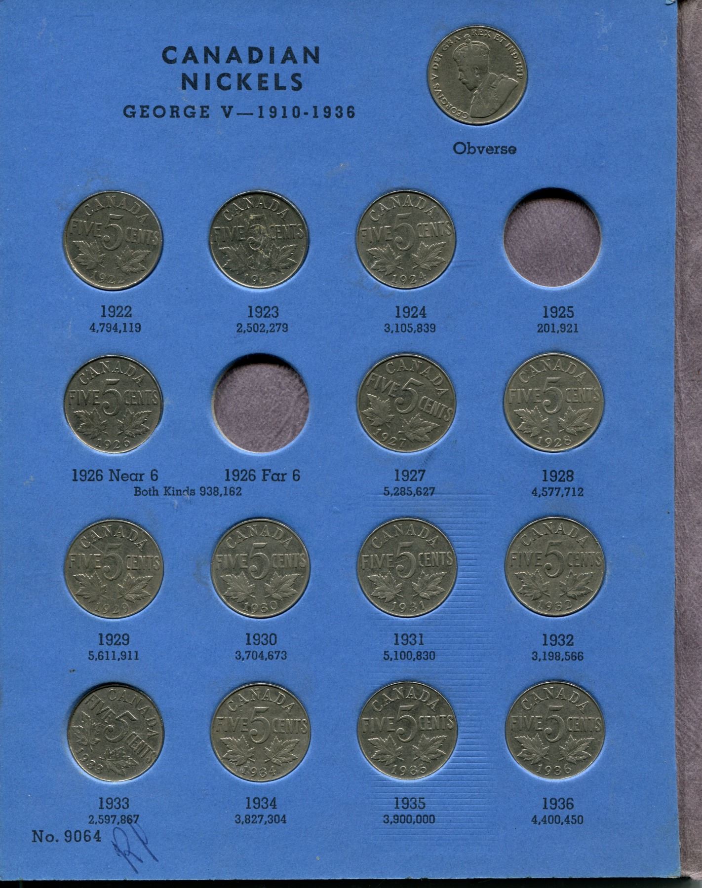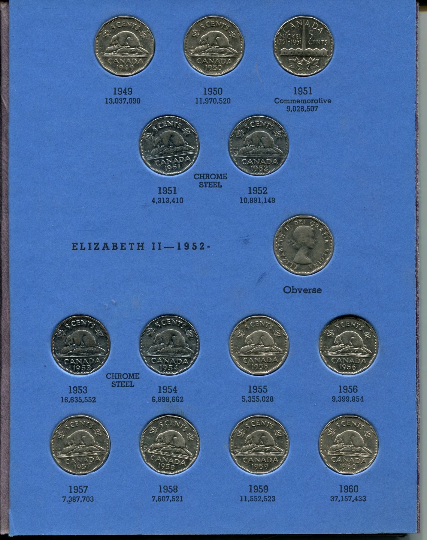 Near complete set of Canadian Nickel 5 Cents 1922 – 1960. Missing only 1925 & 1926 Far 6. Coins grad