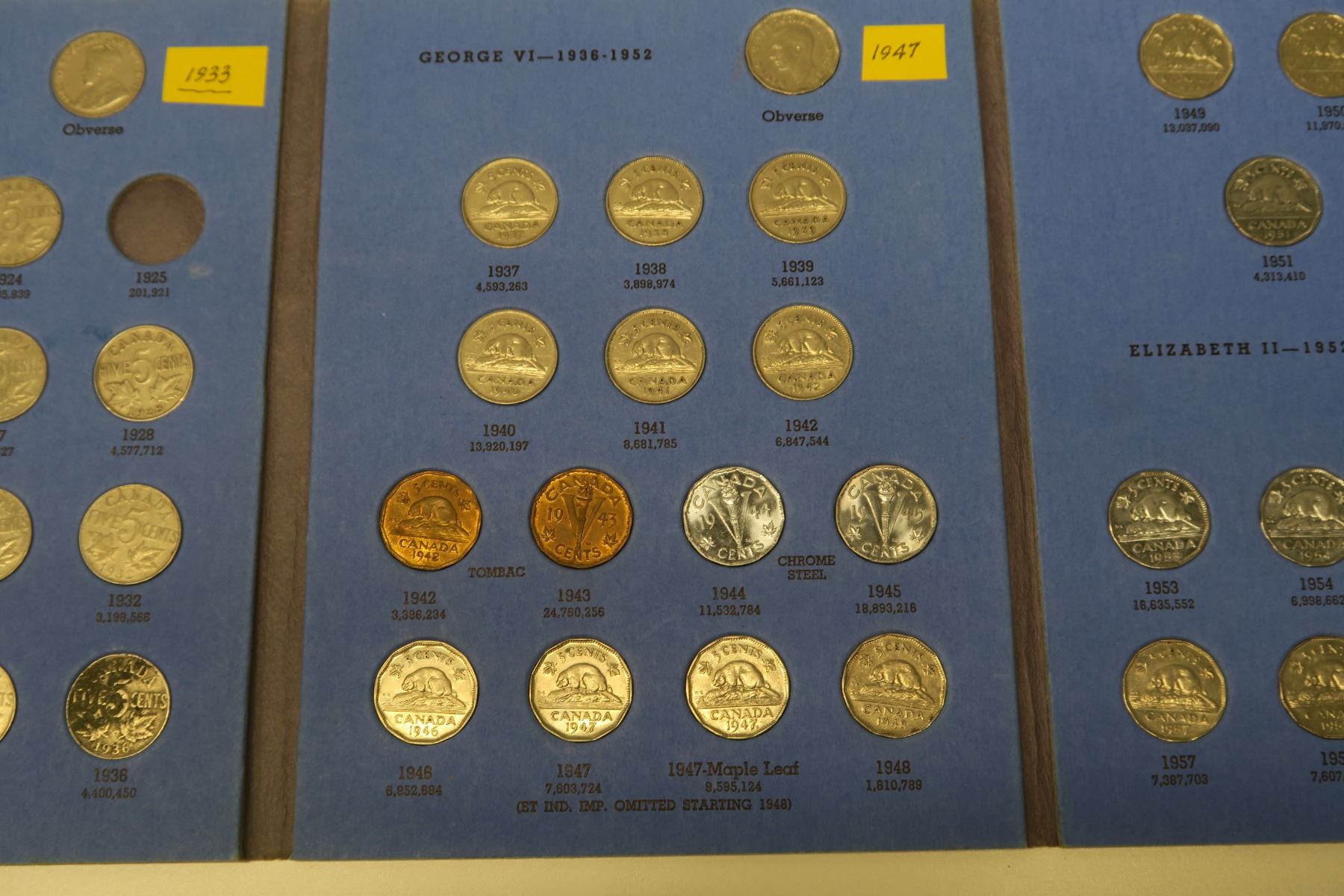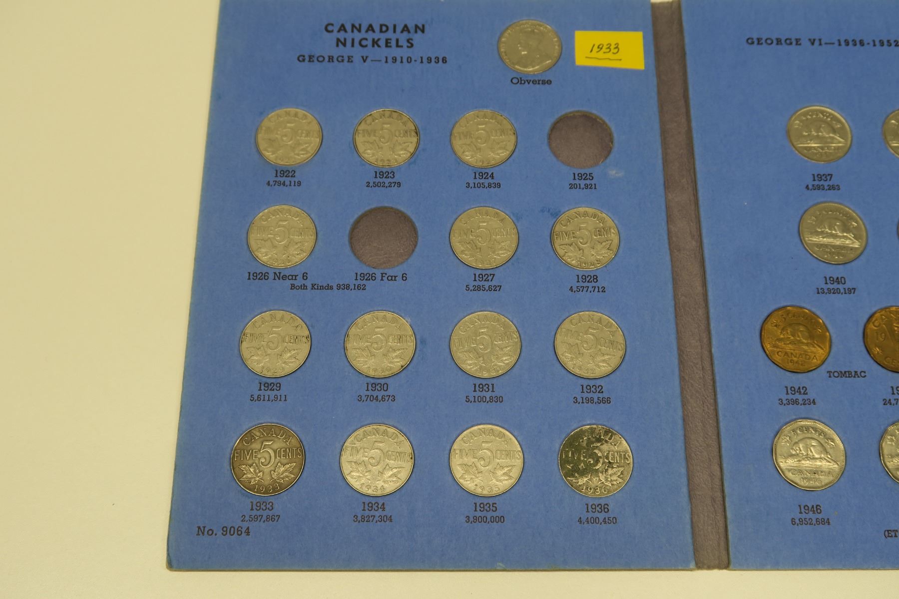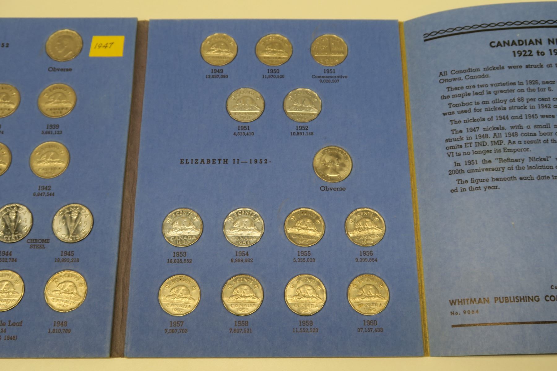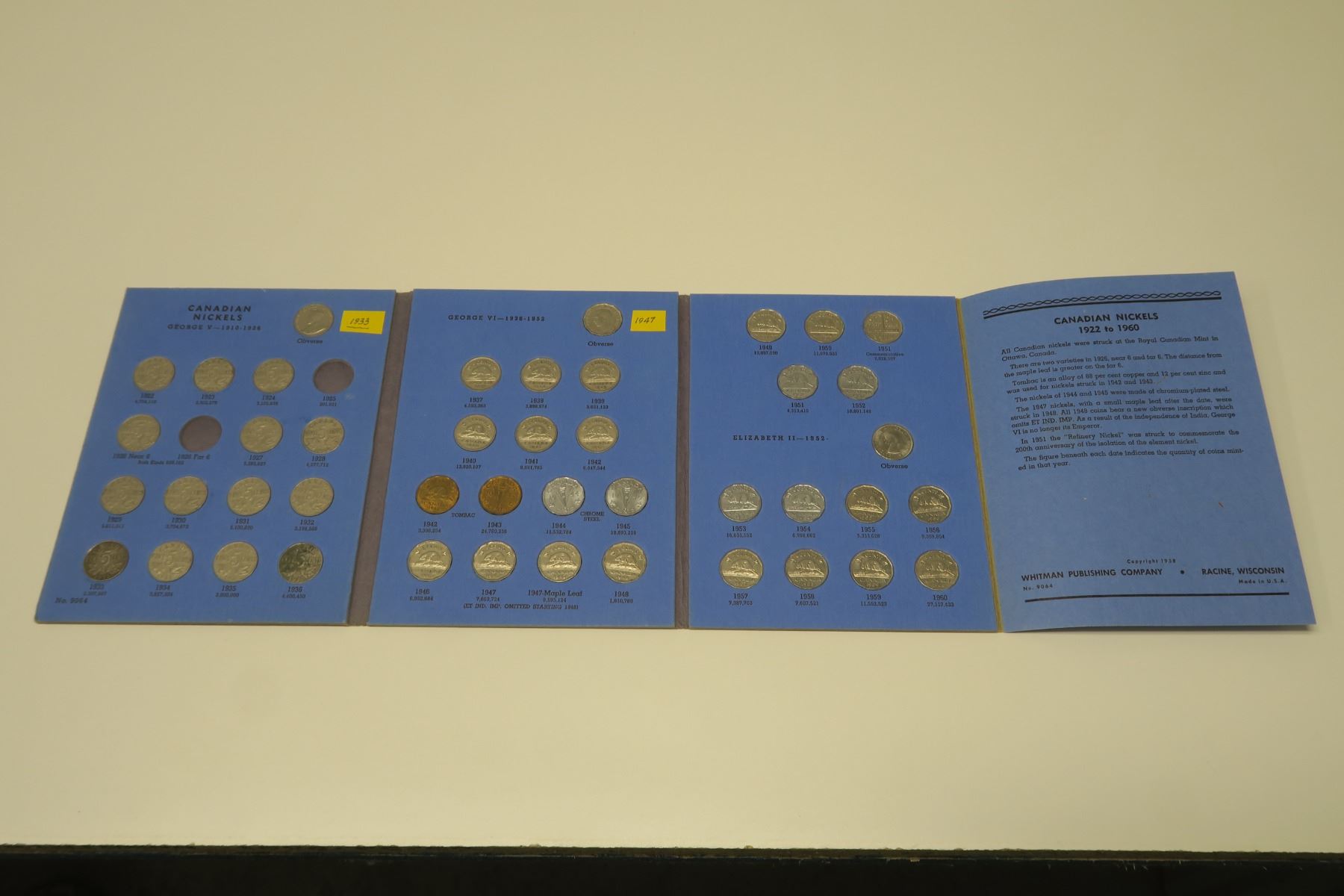 Near complete set of Canadian Nickel 5 Cents 1922 – 1960. Missing only Scarce 1925 & 1926 Far 6. Coins grade Fine to Uncirculated. Housed in a blue Whitman folder.
