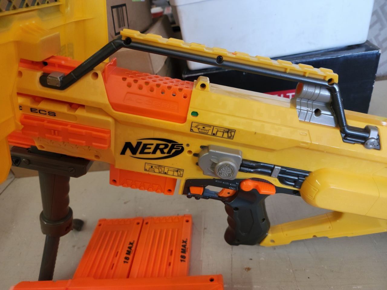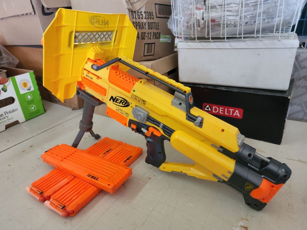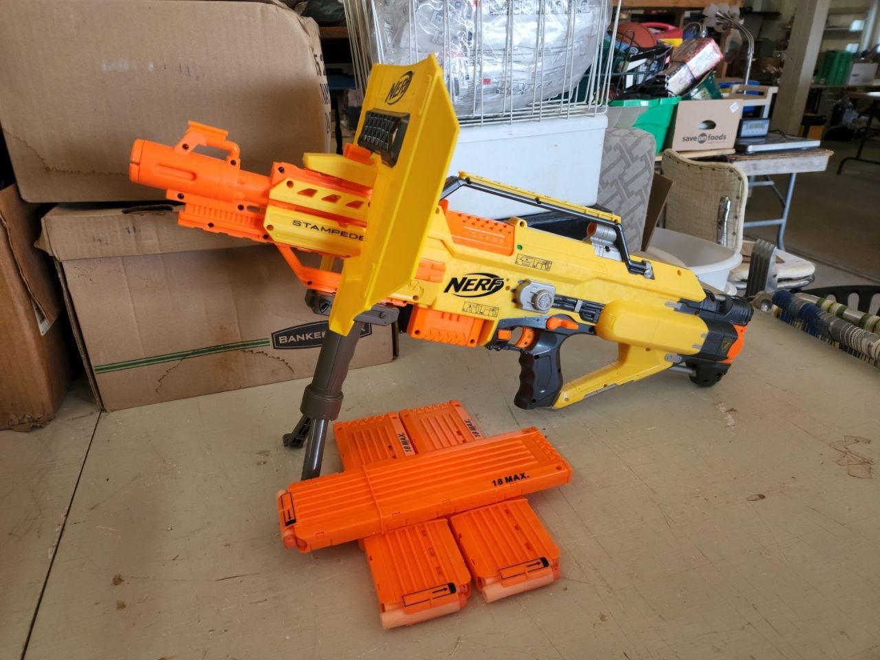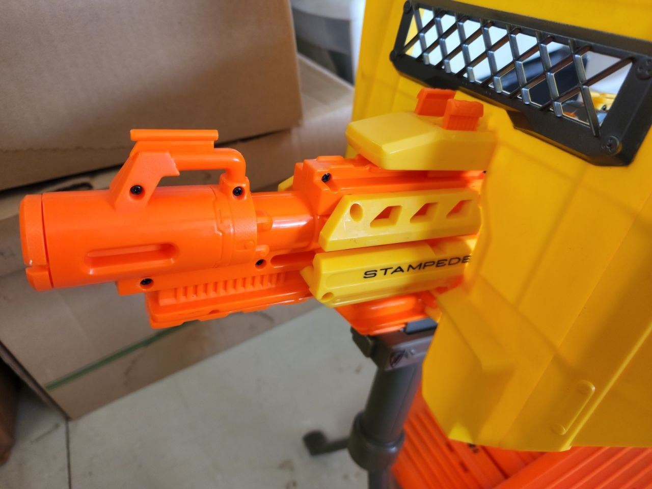 "Nerf Stampede" Batt Powered dart gun, plus 3 18 dart cartridges and shield