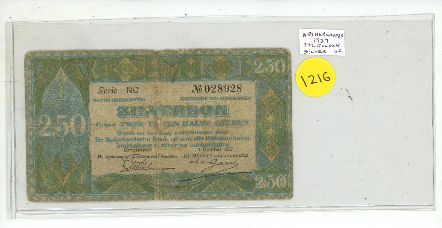 Netherlands. 1927 2 ½ Gulden Zilverbon. At the time, you could go to a Belgian bank and demand a silver coin in exchange. VG.