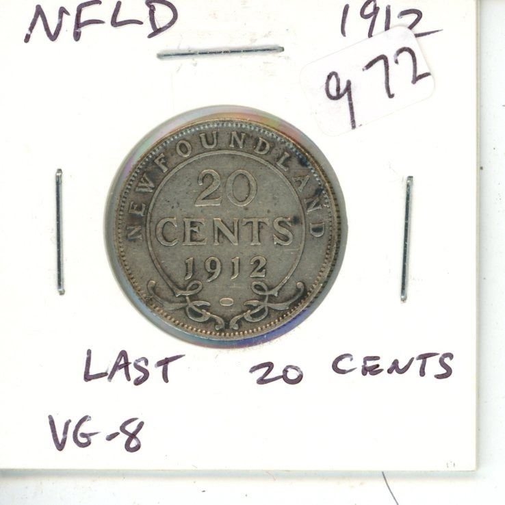 Newfoundland. 1912 Silver 20 Cents. The last and only Silver 20 Cents issued for King George V. Mintage of 350,000. VG-8.