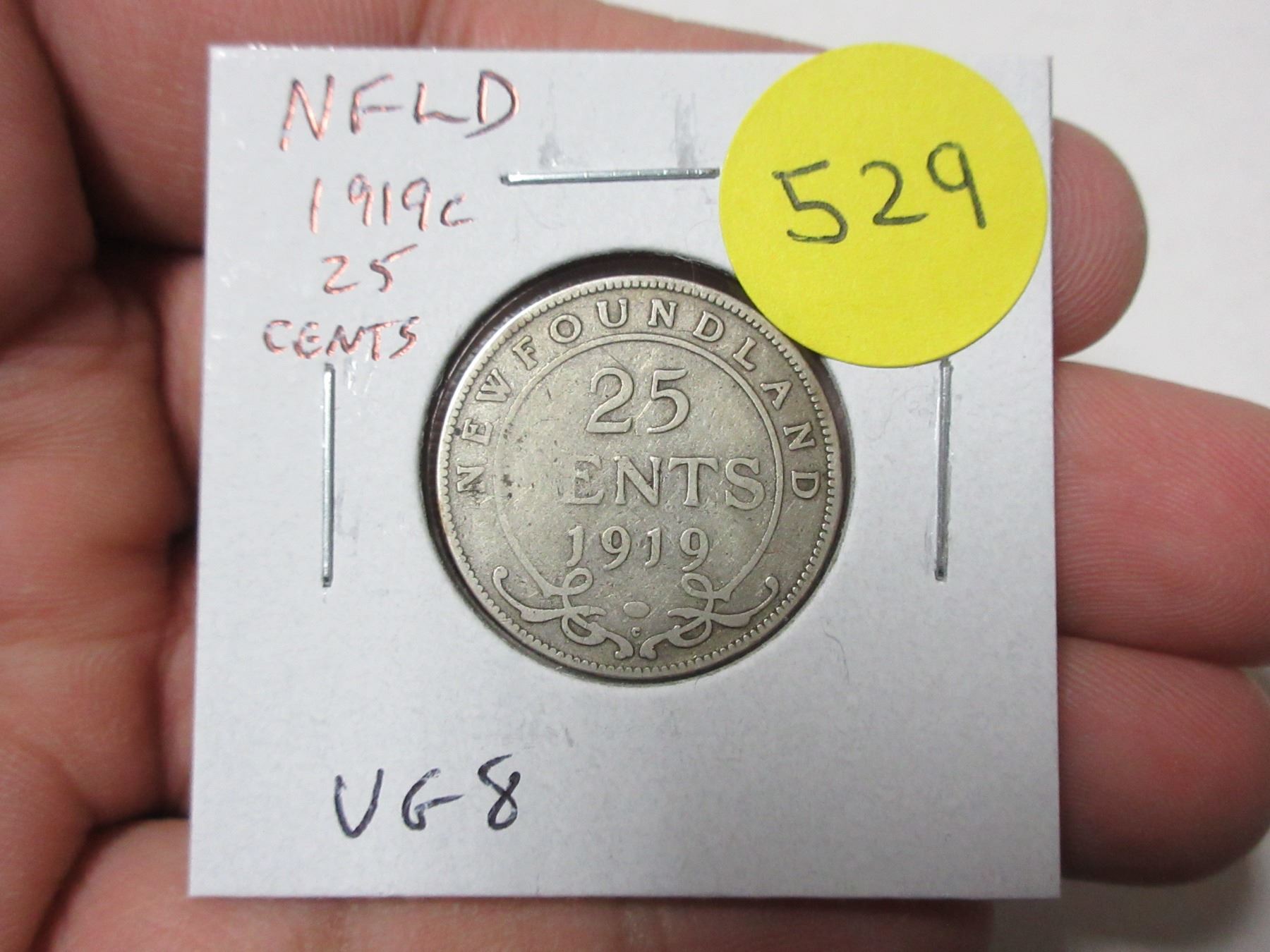 Newfoundland. 1919c Silver 25 Cents. The last Newfoundland 25 Cents issued. VG8.