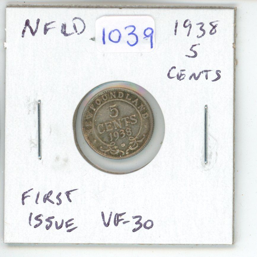 Newfoundland. 1938 Silver 5 Cents. First issue of King George VI. VF-30.