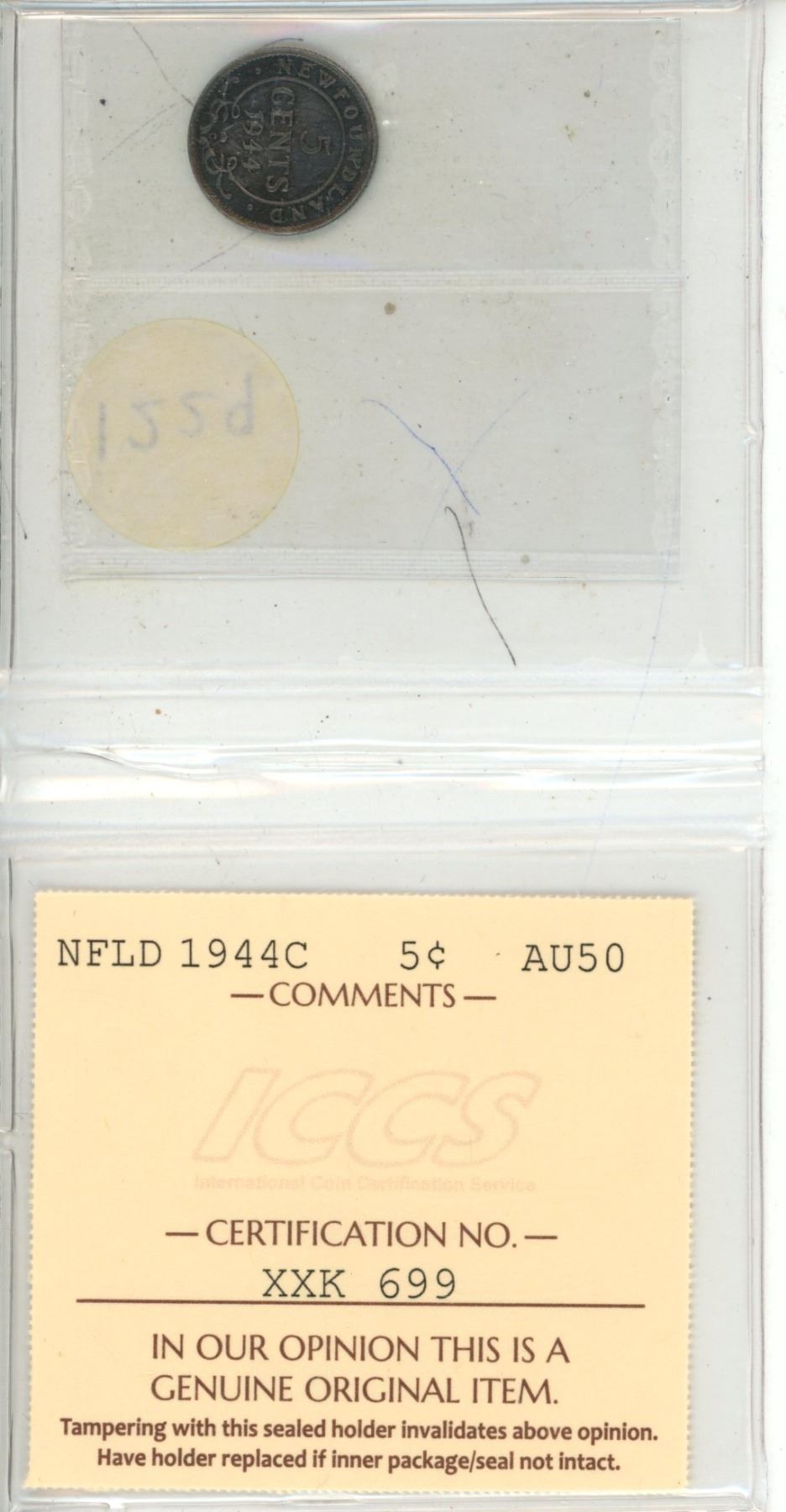 Newfoundland. 1944c Silver 5 Cents. ICCS certified and graded AU-50.