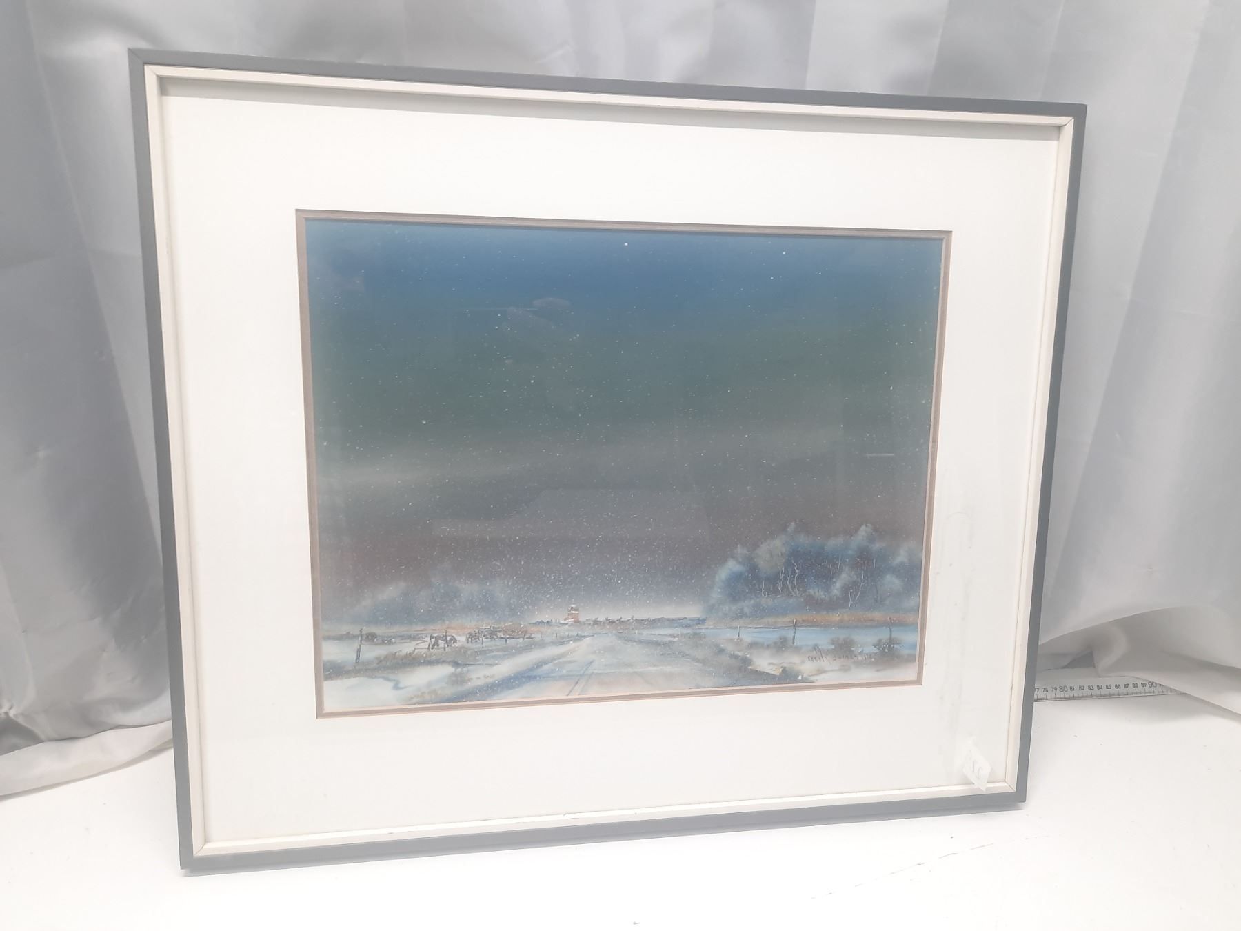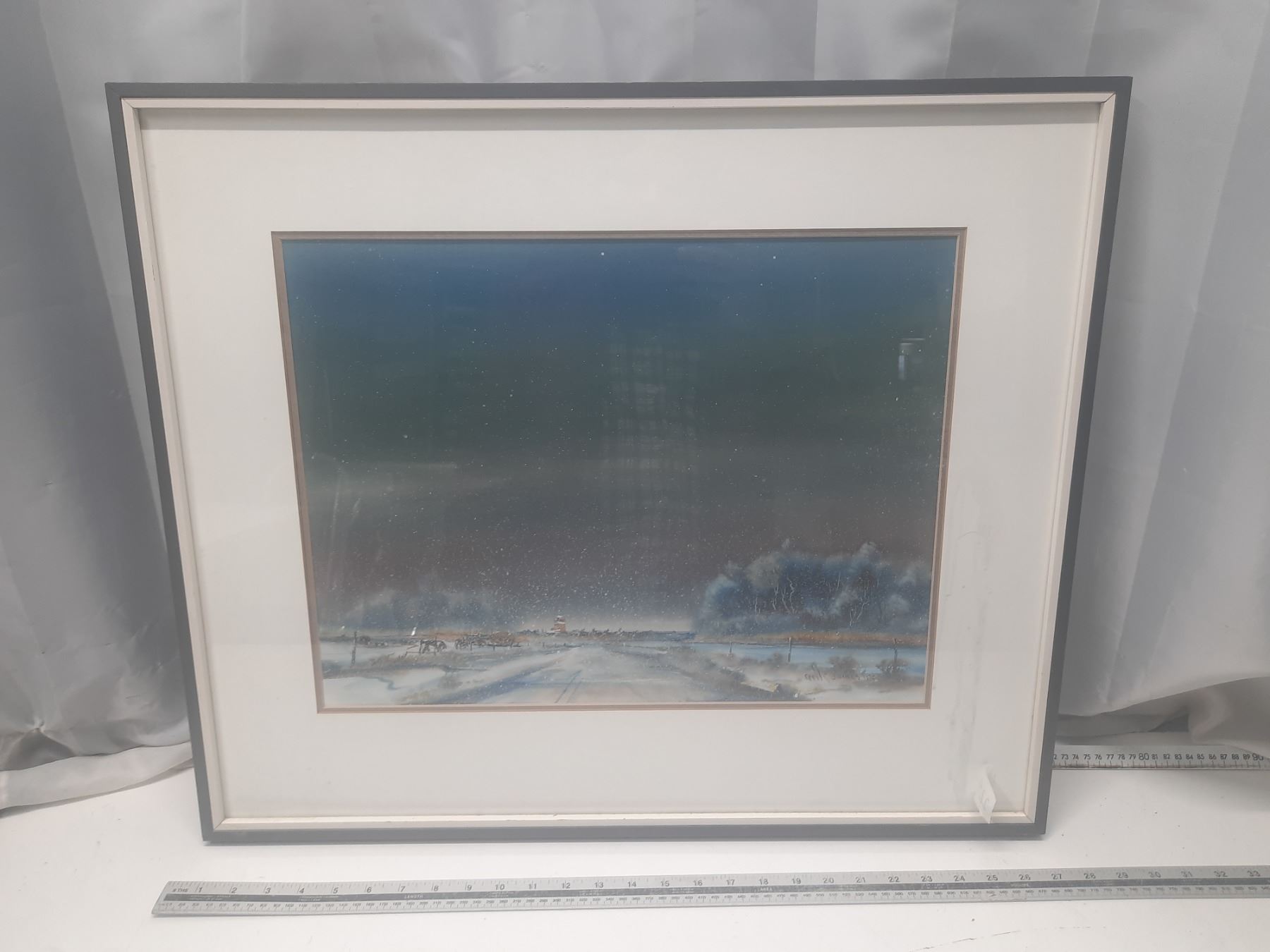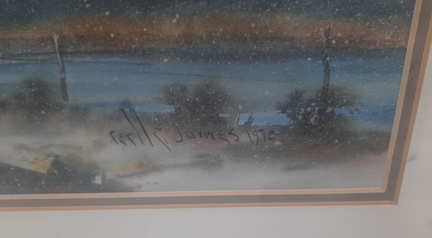 Night scene print by Cecil E. James. Information on artist attached to back of picture.