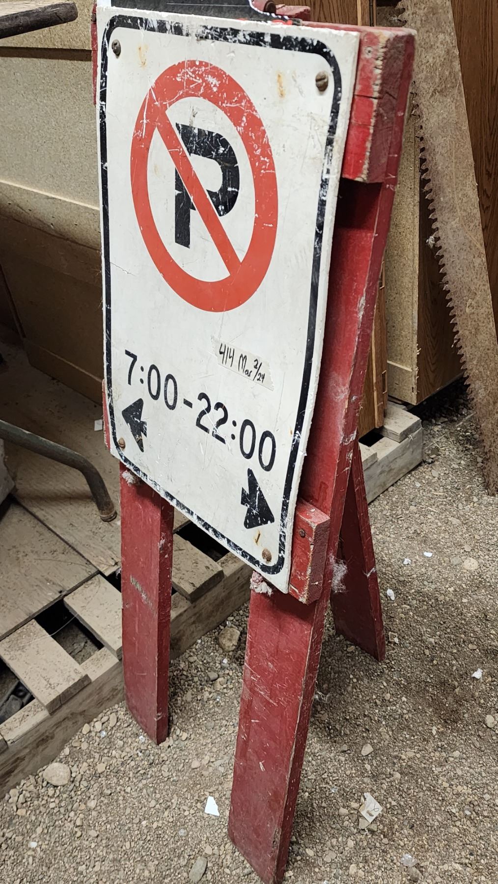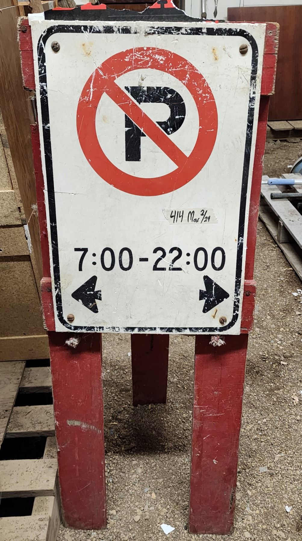 "No Parking" road sign, on folding wood stand - 35"H x 13"W