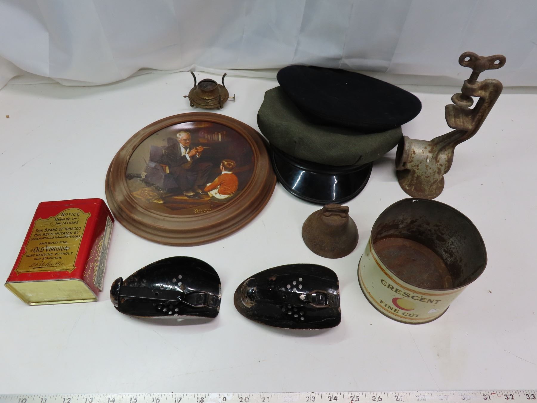Norman rockwell wall art and assorted virginia tobacco tins saint lavine antique hat