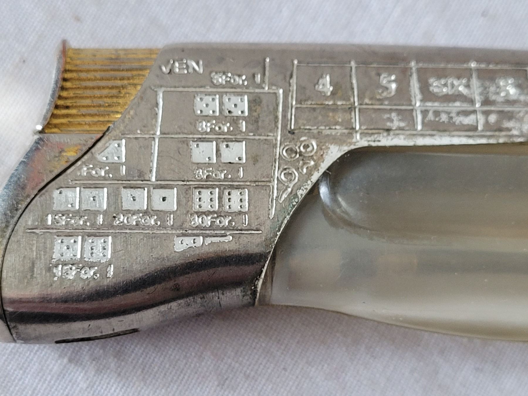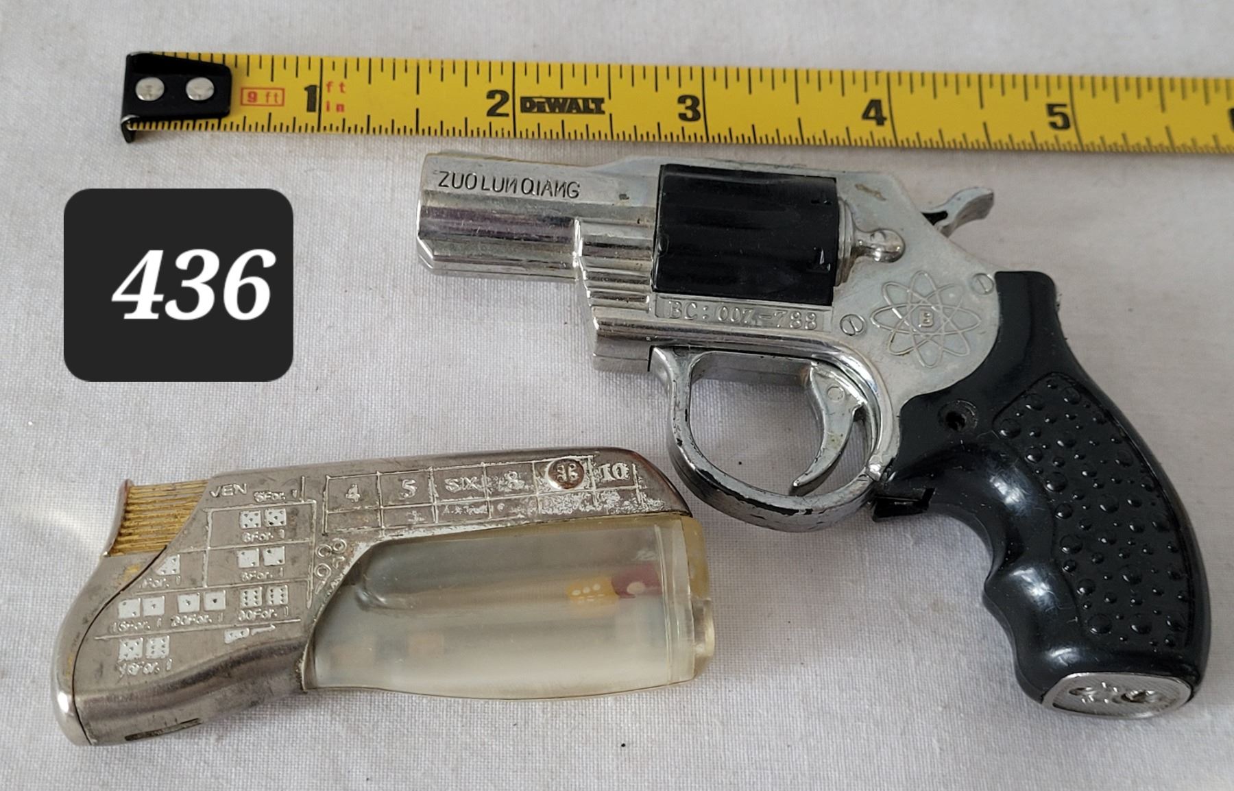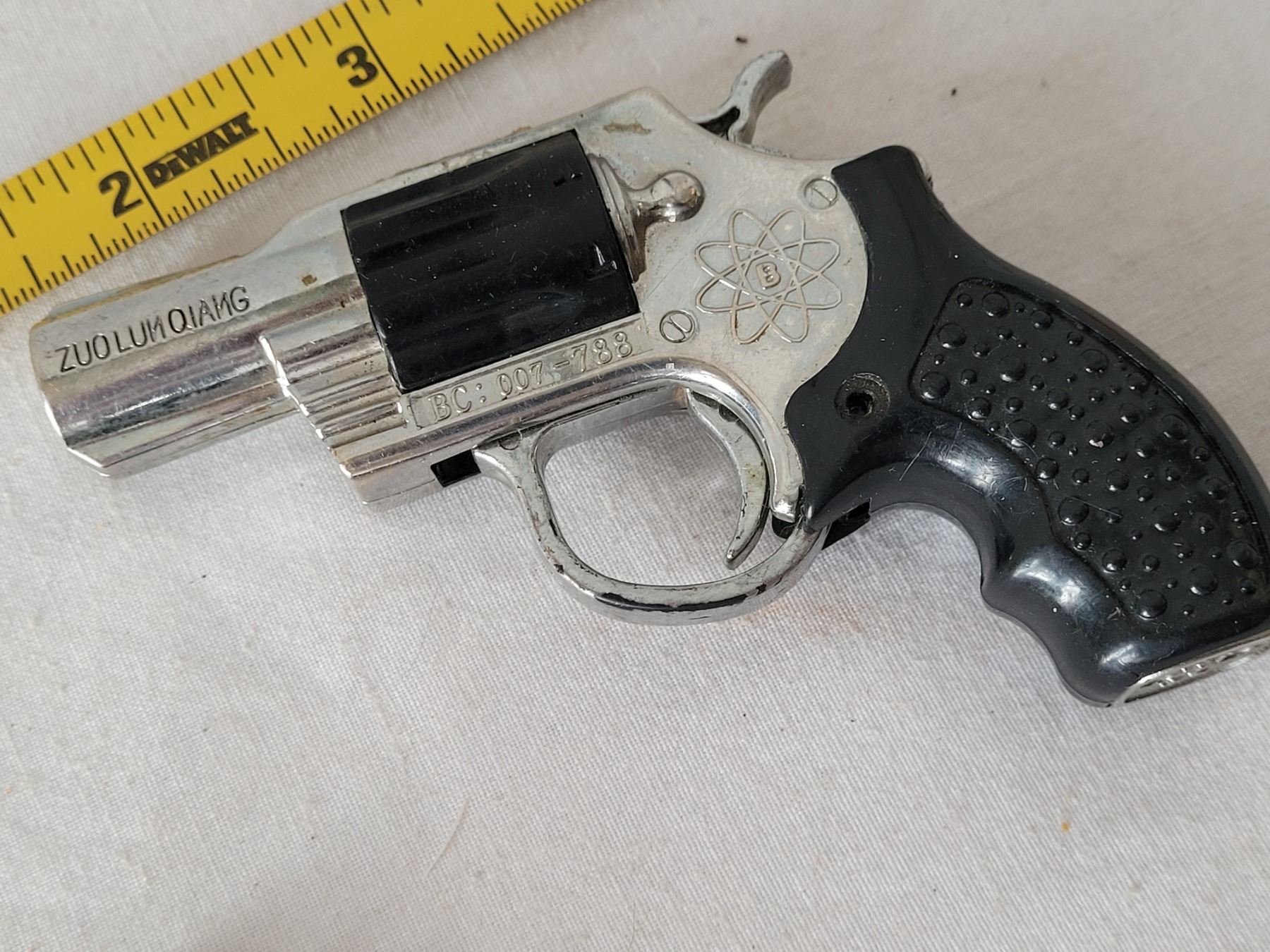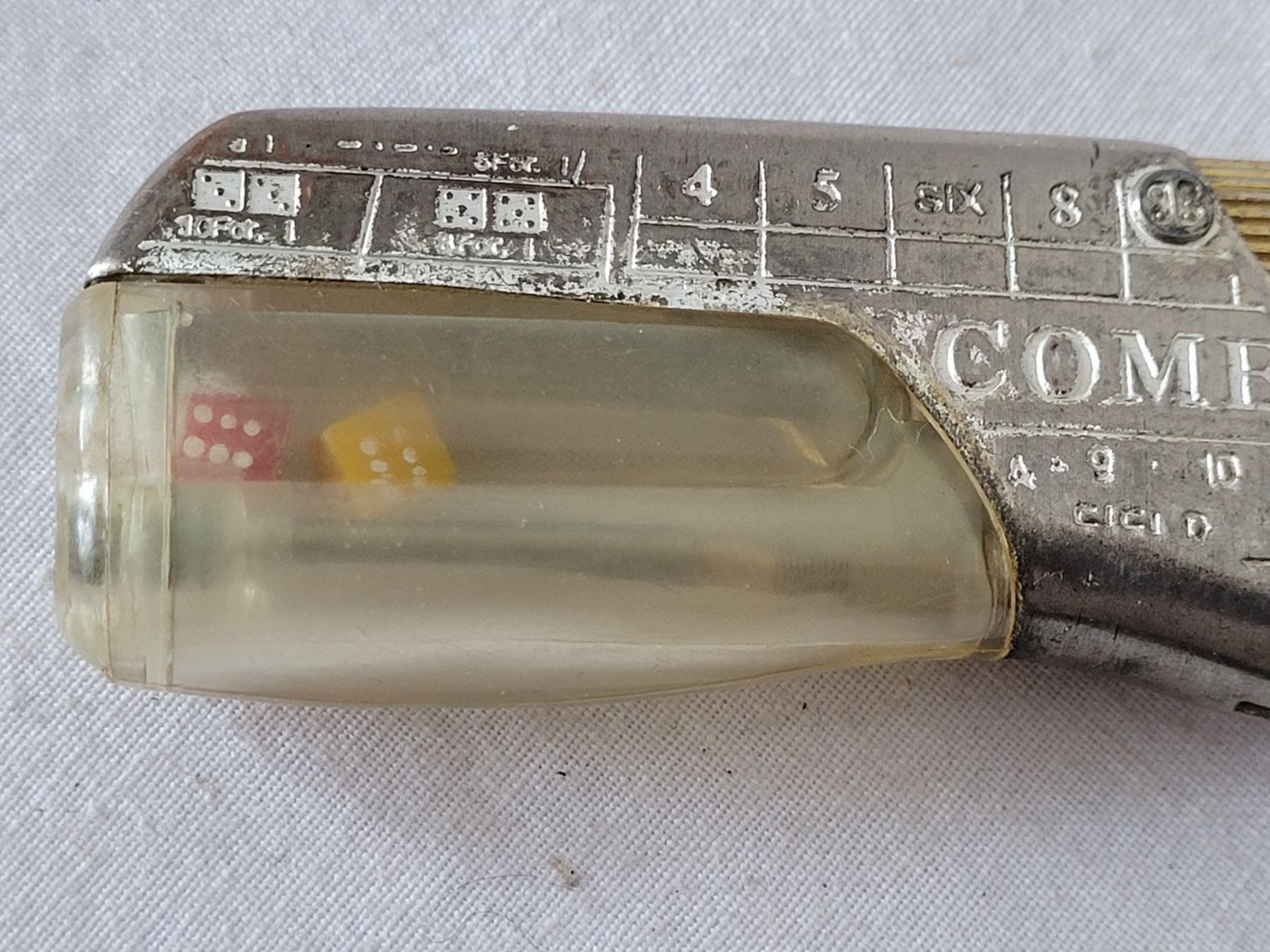 Novelty butane cigarette lighters. Vegas floating dice & hand gun.