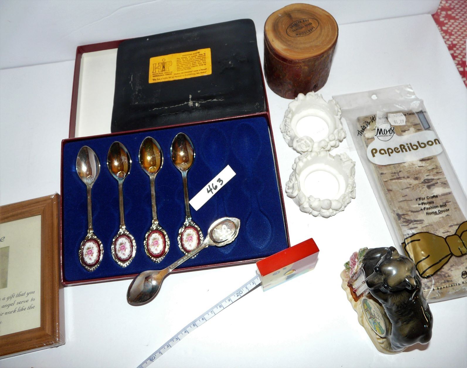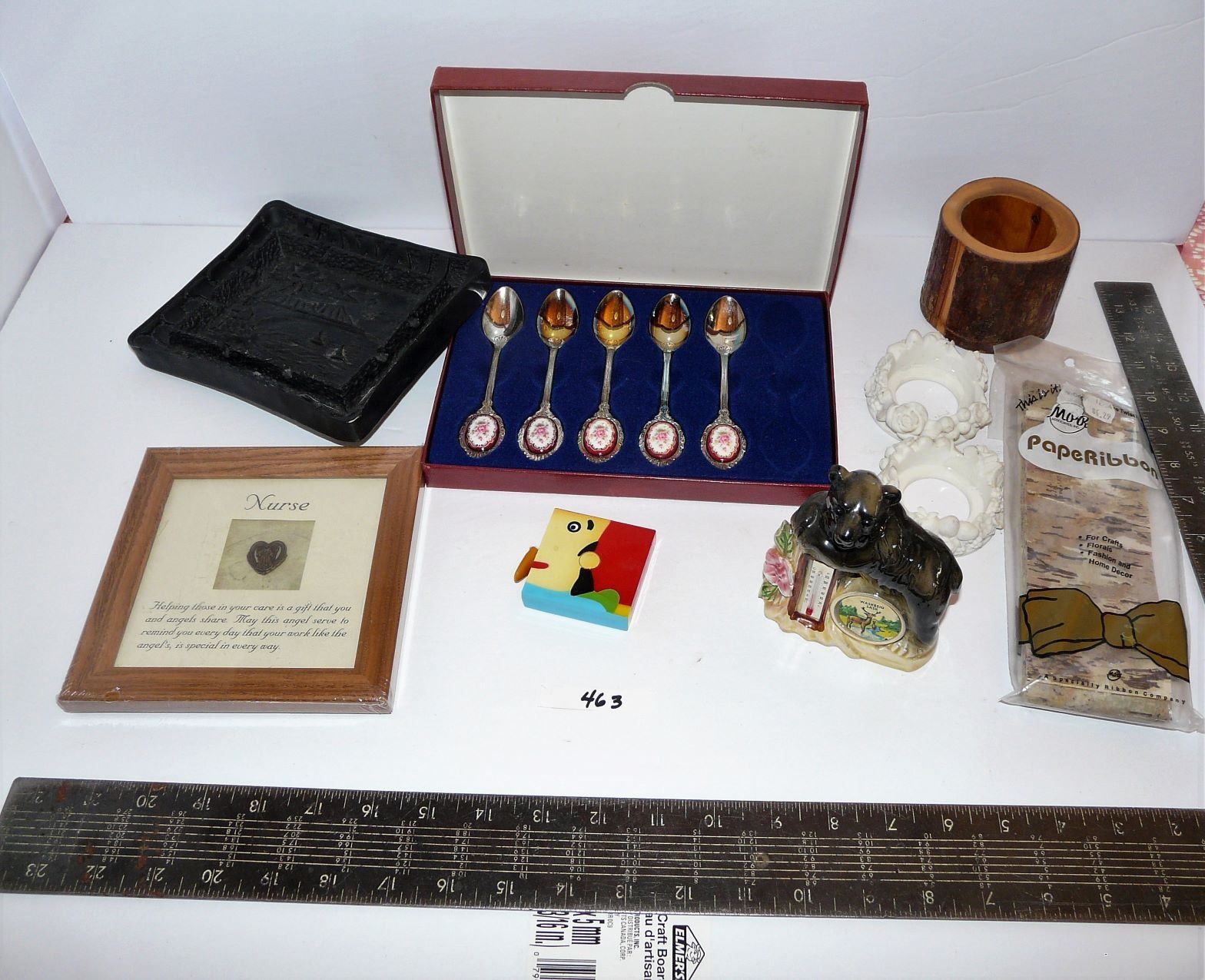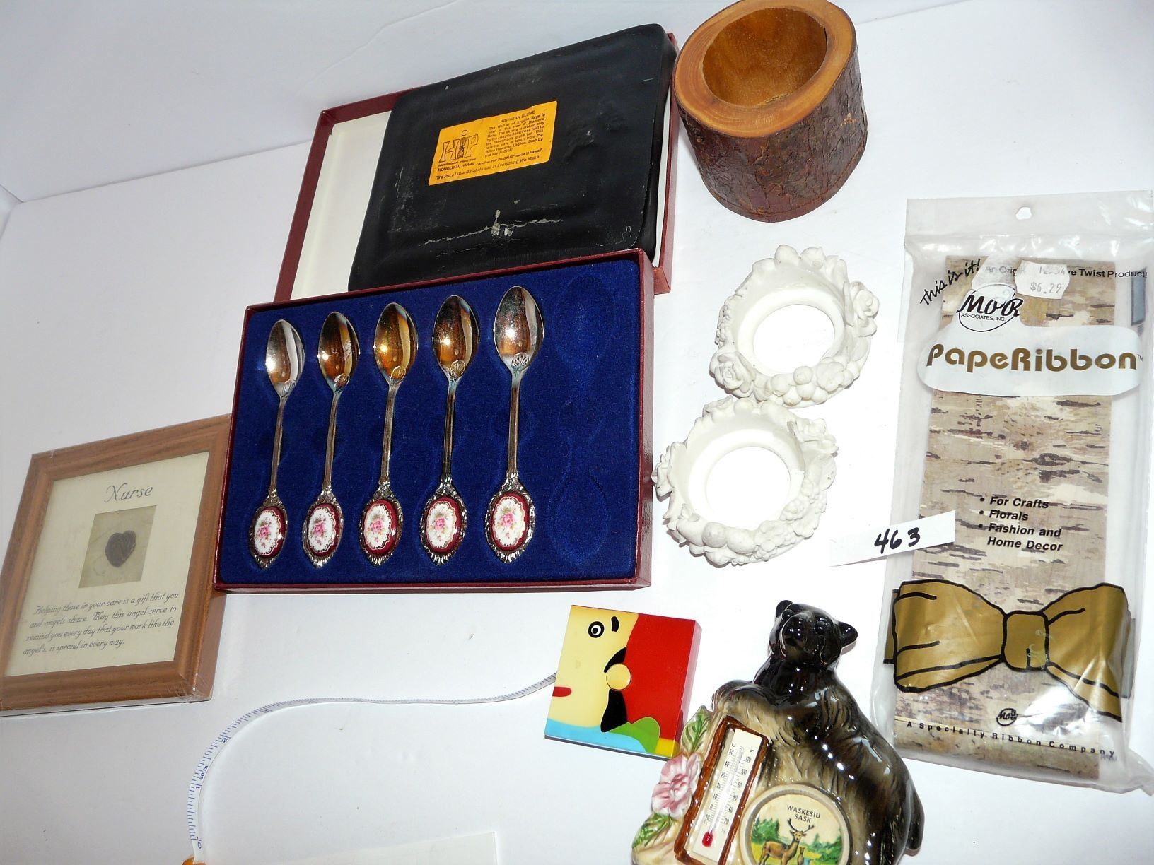 Nurses Angel Plaque, Waskesiu Bear Thermometer, Hawaiian Pic, Spoons (missing 1), etc.