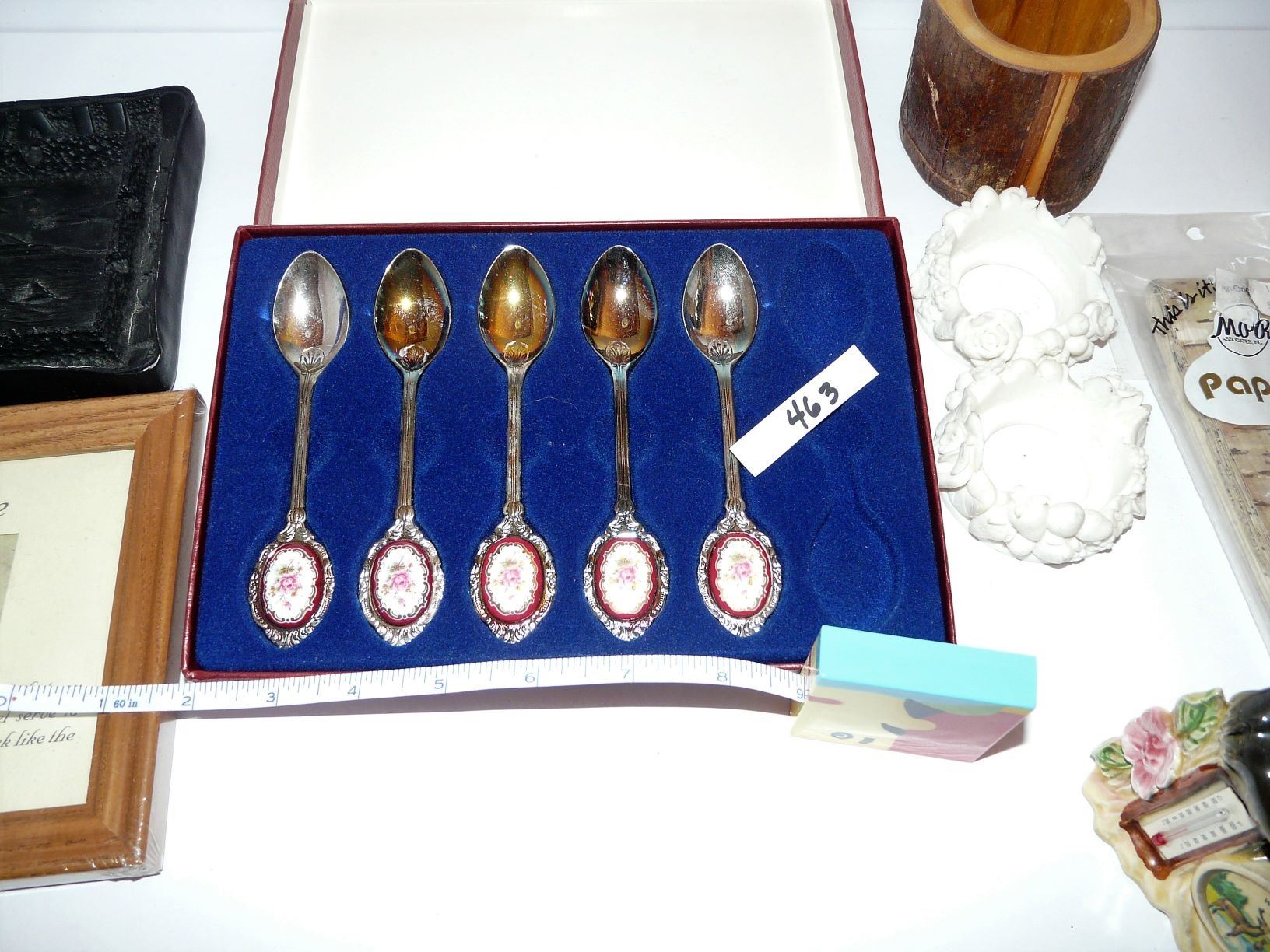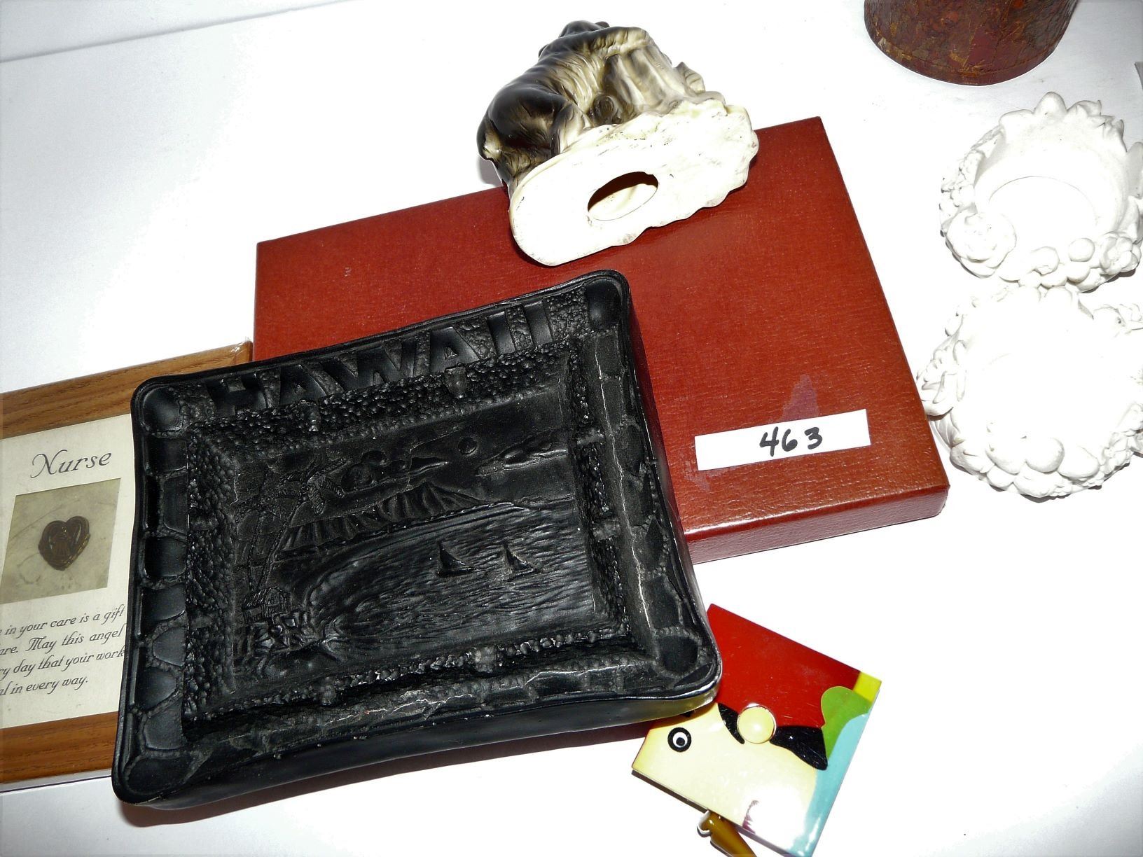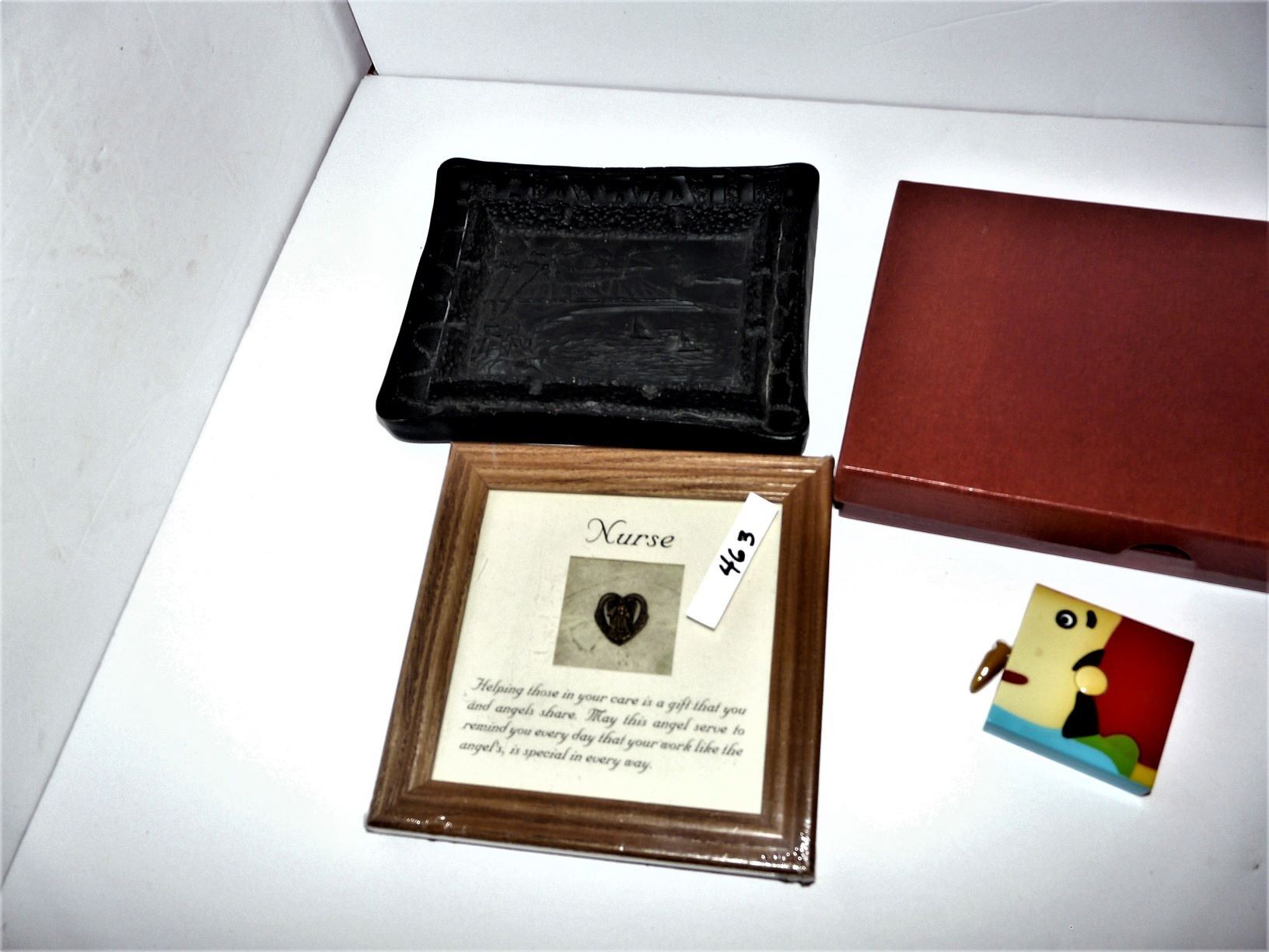 Nurses Angel Plaque, Waskesiu Bear Thermometer, Hawaiian Pic, Spoons (missing 1), etc.