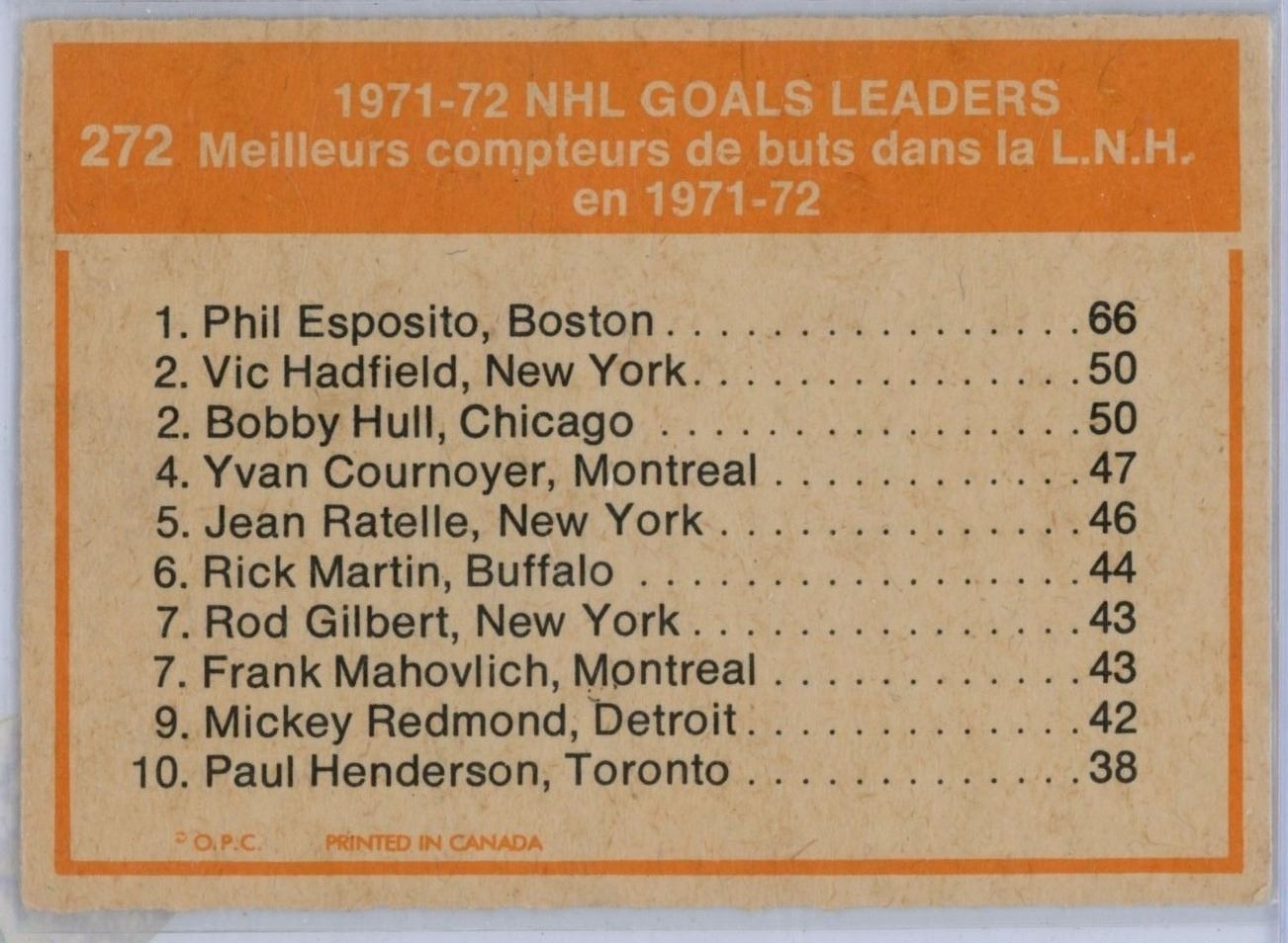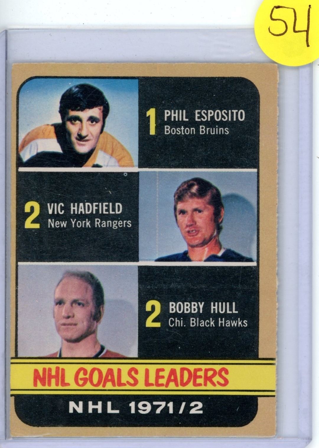 O.P.C. 1971-72 Goal leaders Esposito, Hadfield, Hull card V.F. Condition