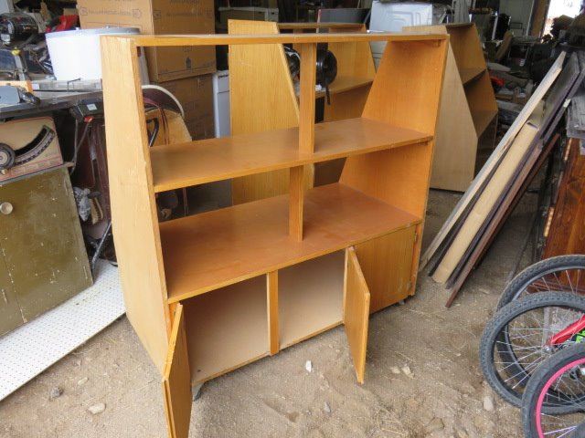 OAK SHELF ON CASTERS 53HX26DX50W, 3 SHELVES, 3 DOORS AT BACK