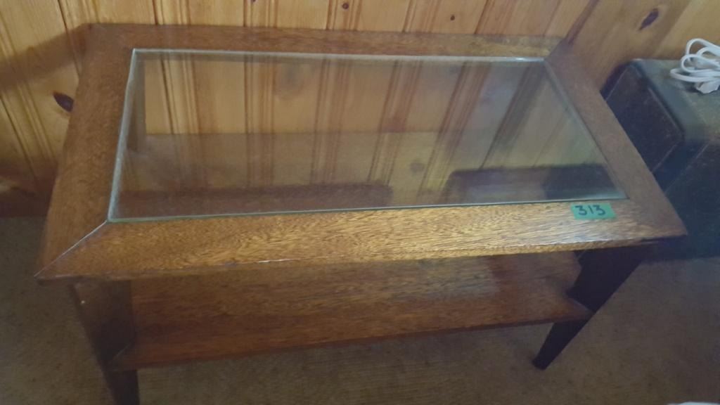 OAK W/ GLASS COFFE TABLE, CASTORS