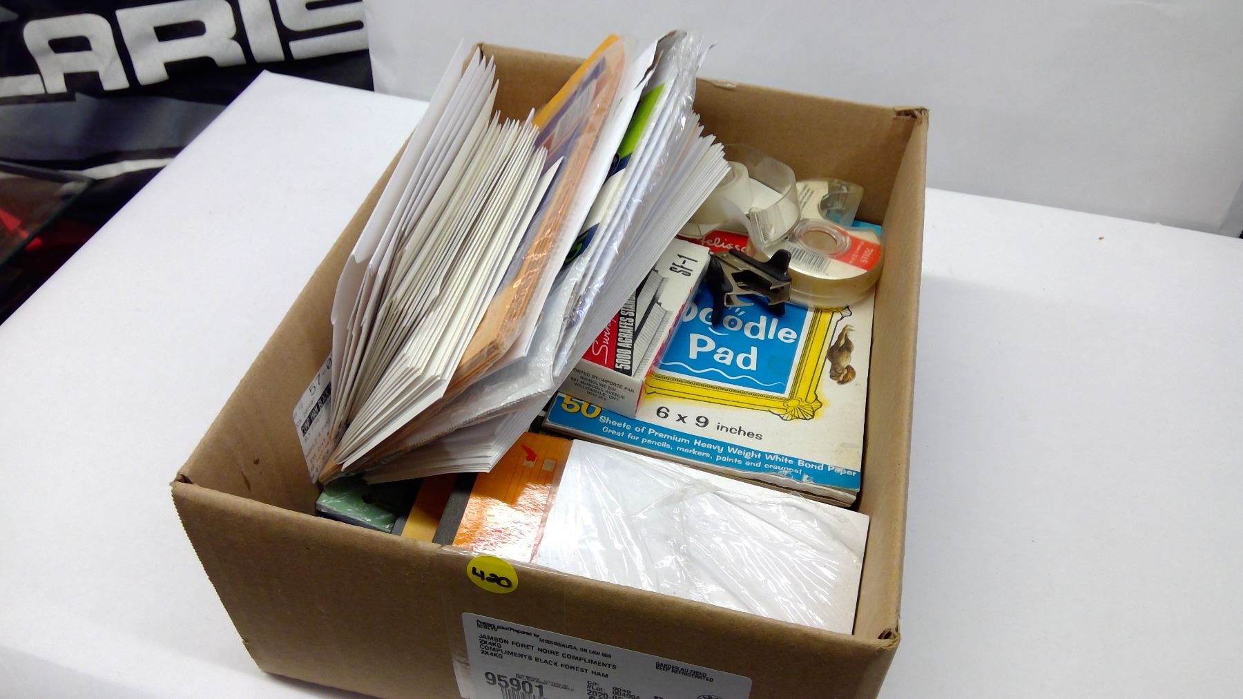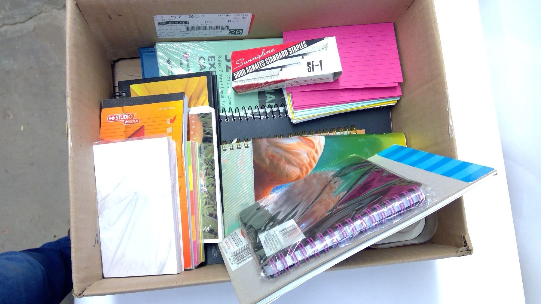 note pads, exercise books, doodle pads, envelopes, staples, staple puller and scotch tape