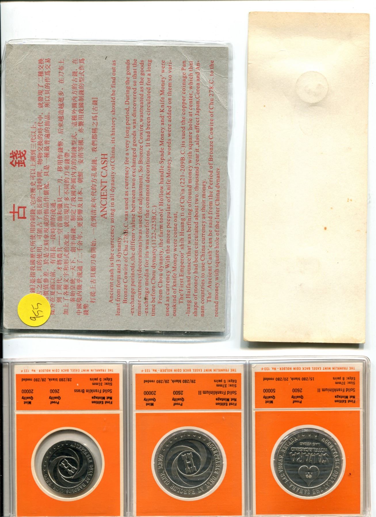 Old Chinese Coin Collection Set, Three Las Vegas Franklin Mint Tokens, Lincoln-Kennedy Penny