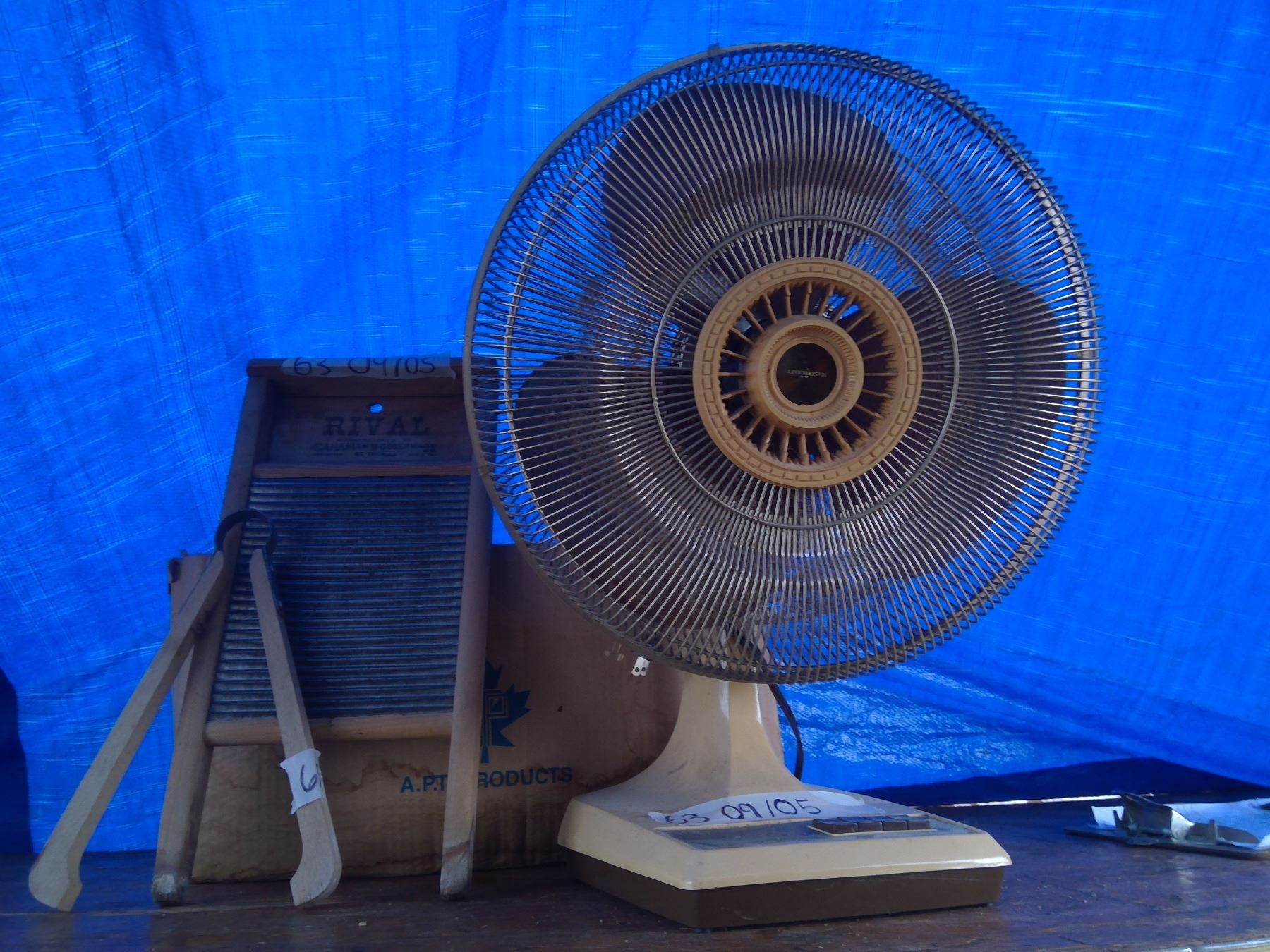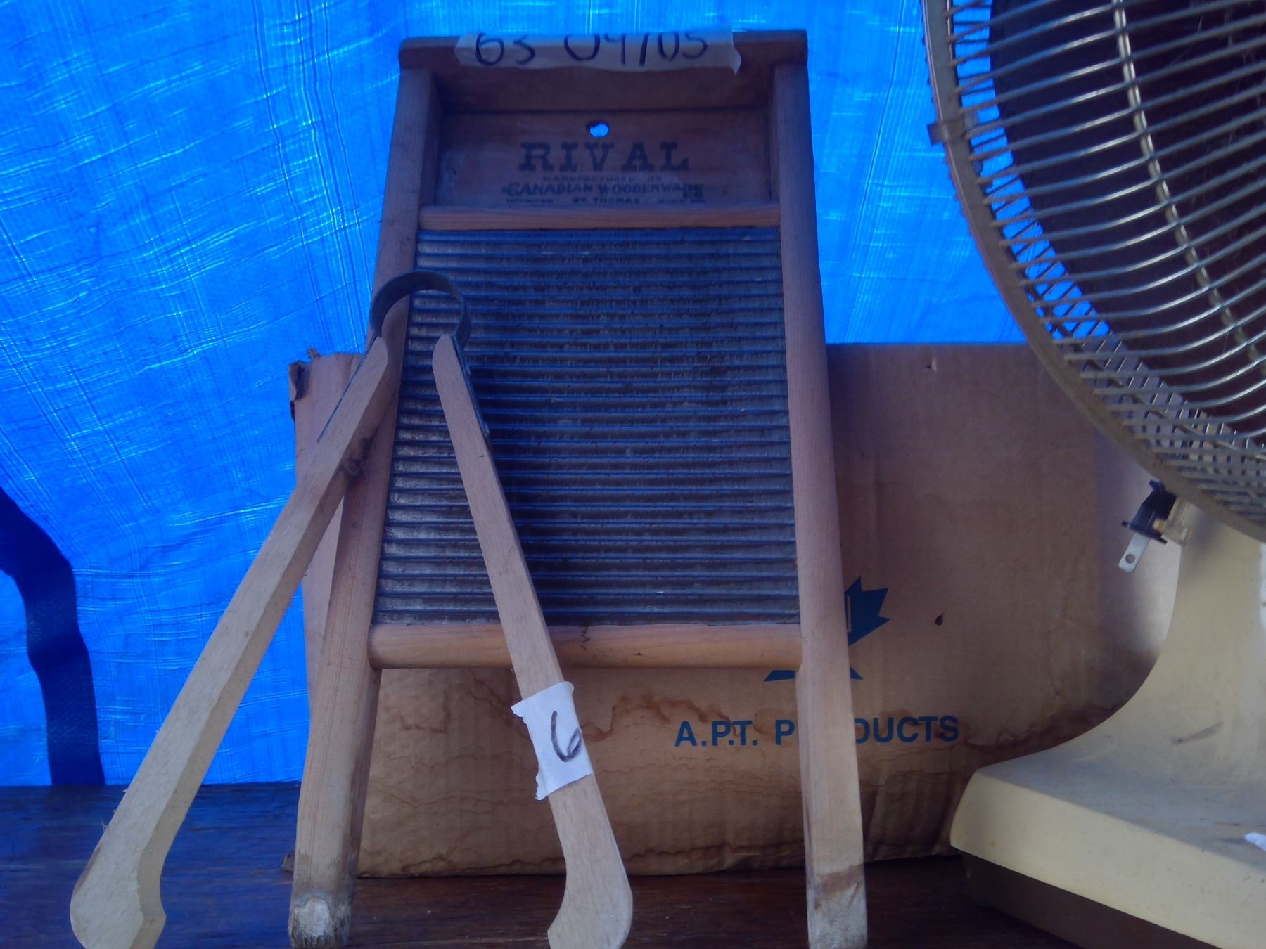 OLD FAN + VINTAGE WASH BOARD + WOODEN TONGS