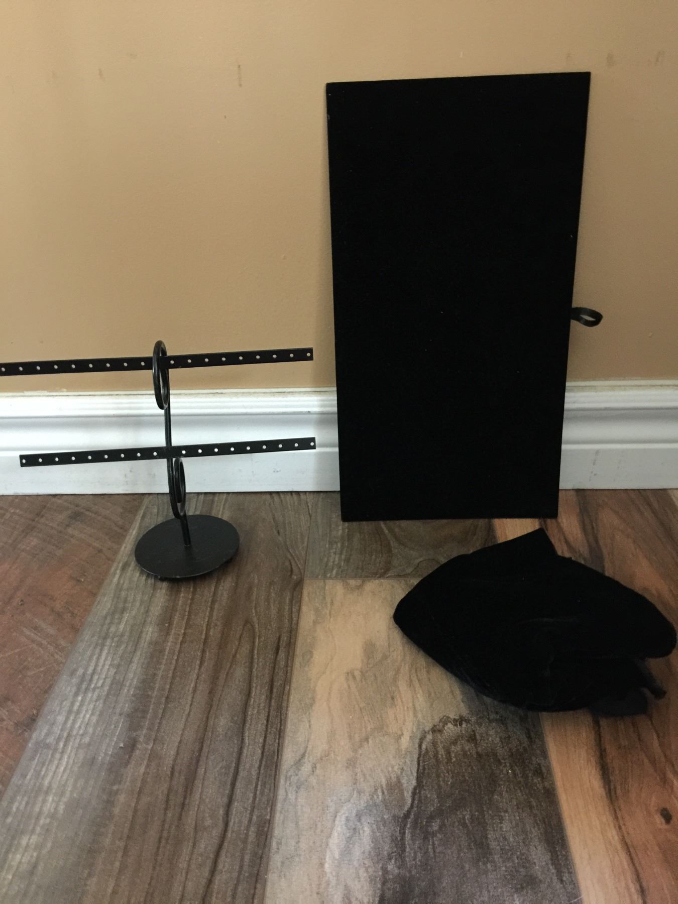 ONE FLAT BLACK VELVET JEWELERY DISPLAY/ONE BLACK METAL EARRING DISPLAY /BLACK VELVET CLOTH
