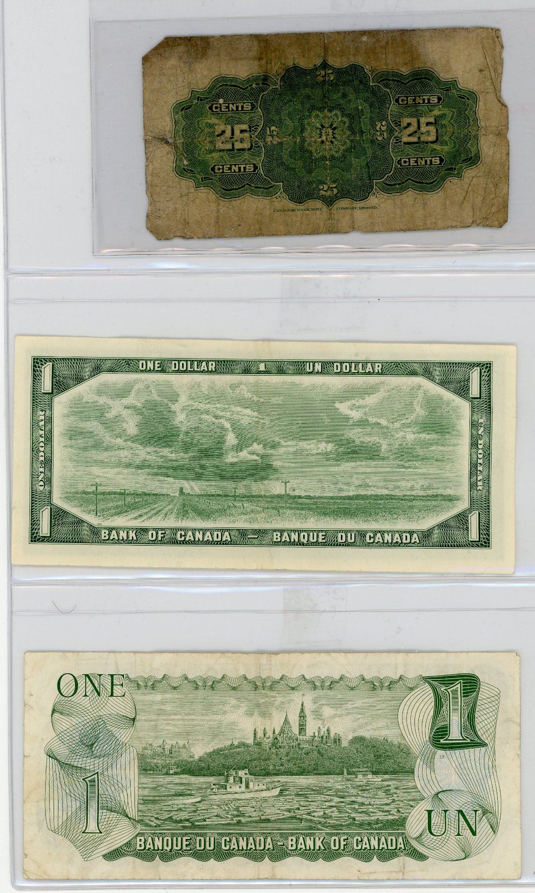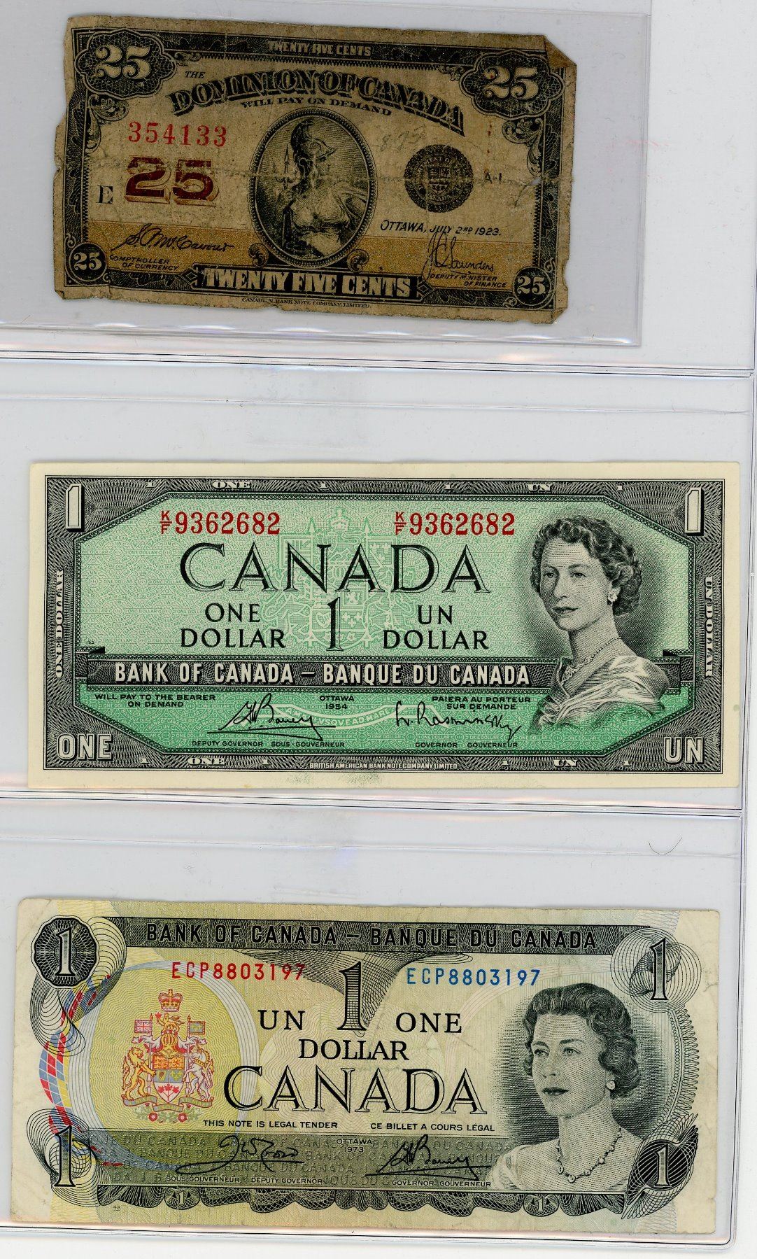 ONE SHINPLASTER AND 2 ONE DOLLAR BILLS (CANADA) *SHINPLASTER=1923--$1=1954, 1973*