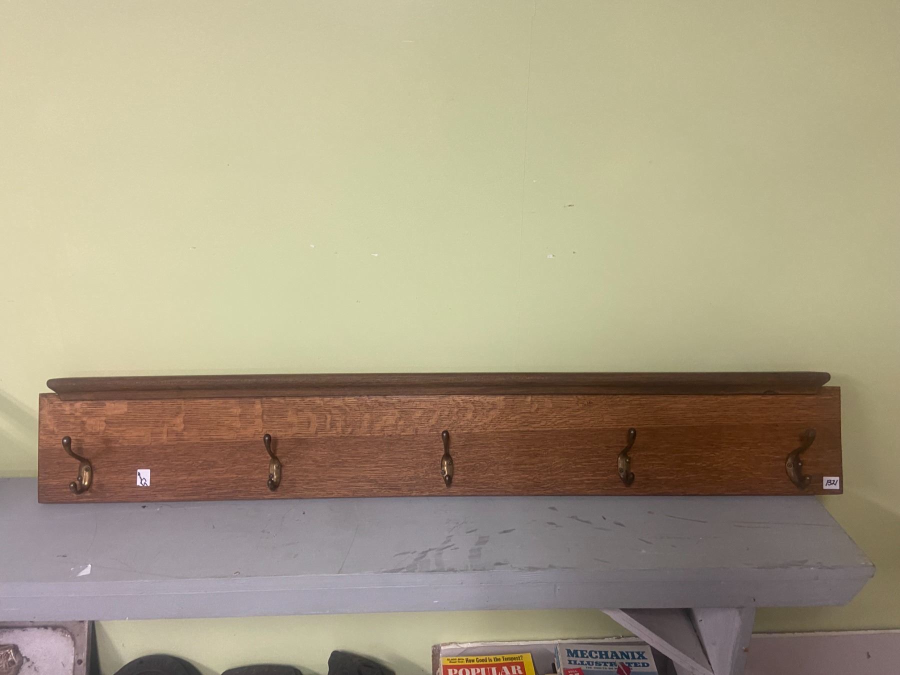 Oak Coat Rack 48" Wide, 5 Brass Hooks