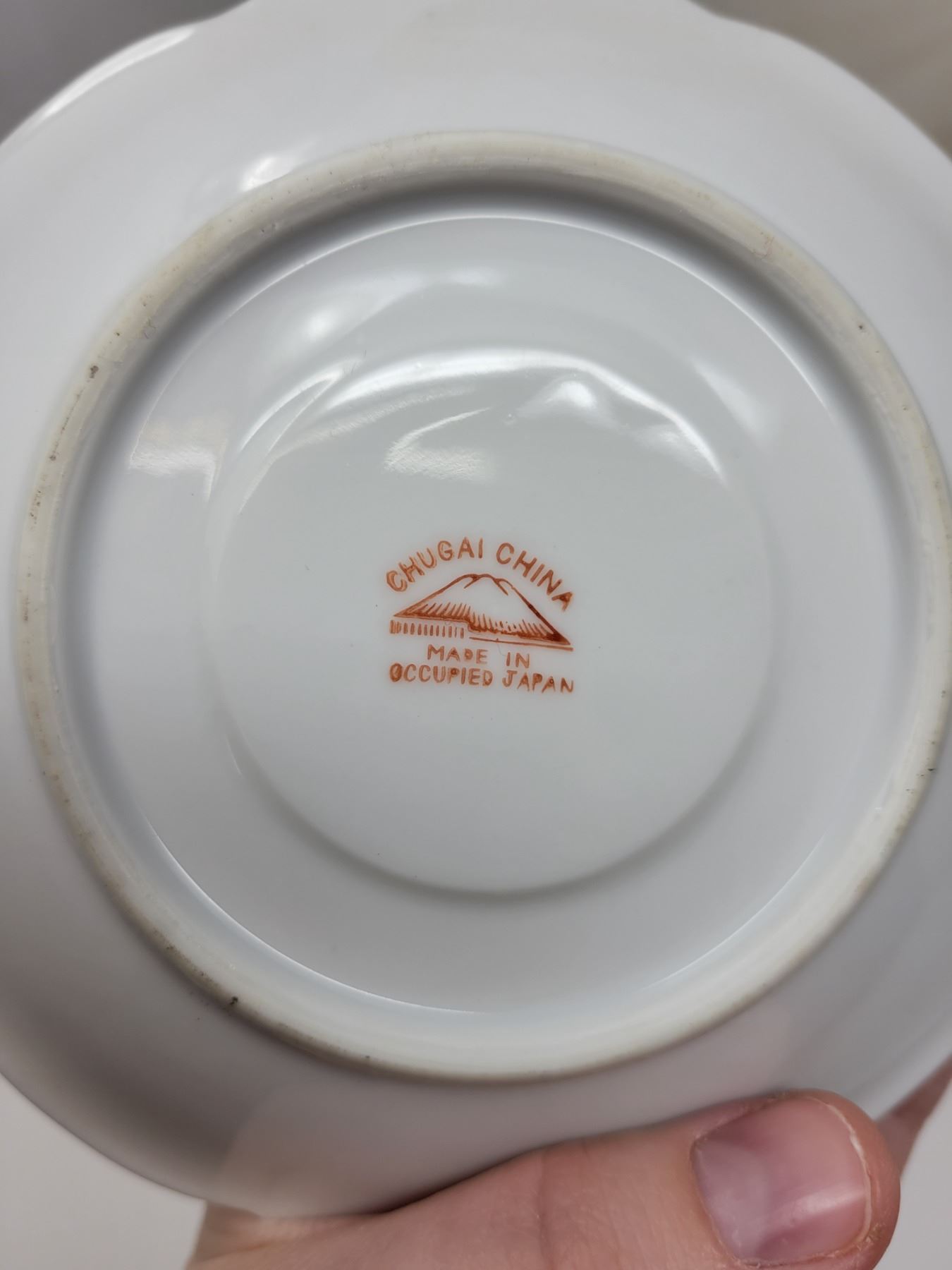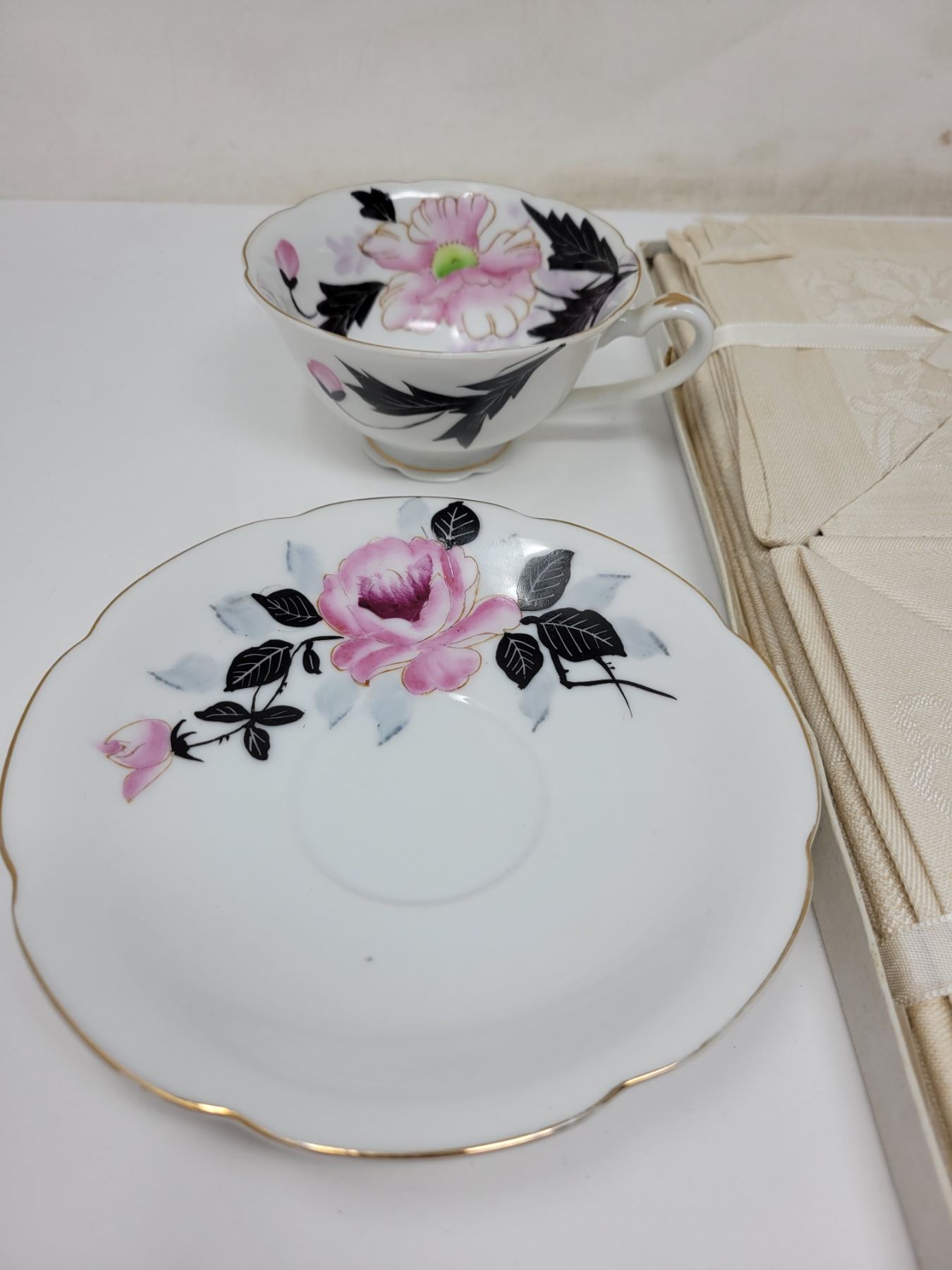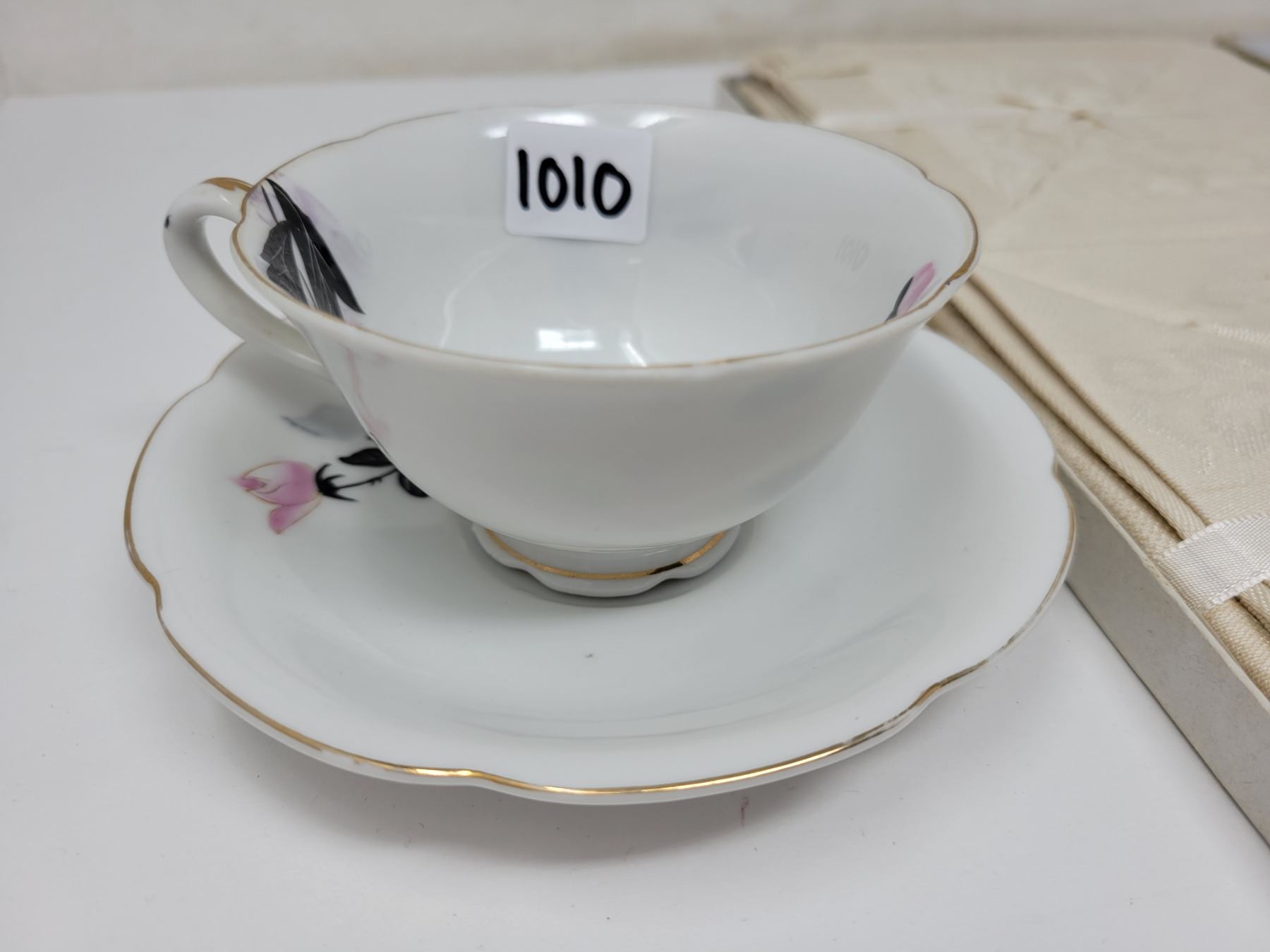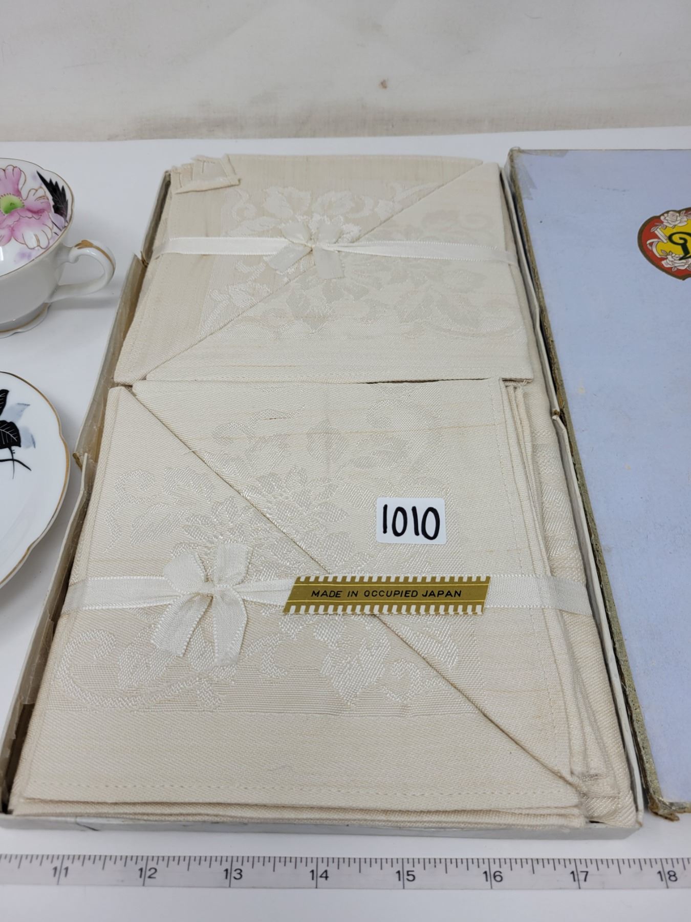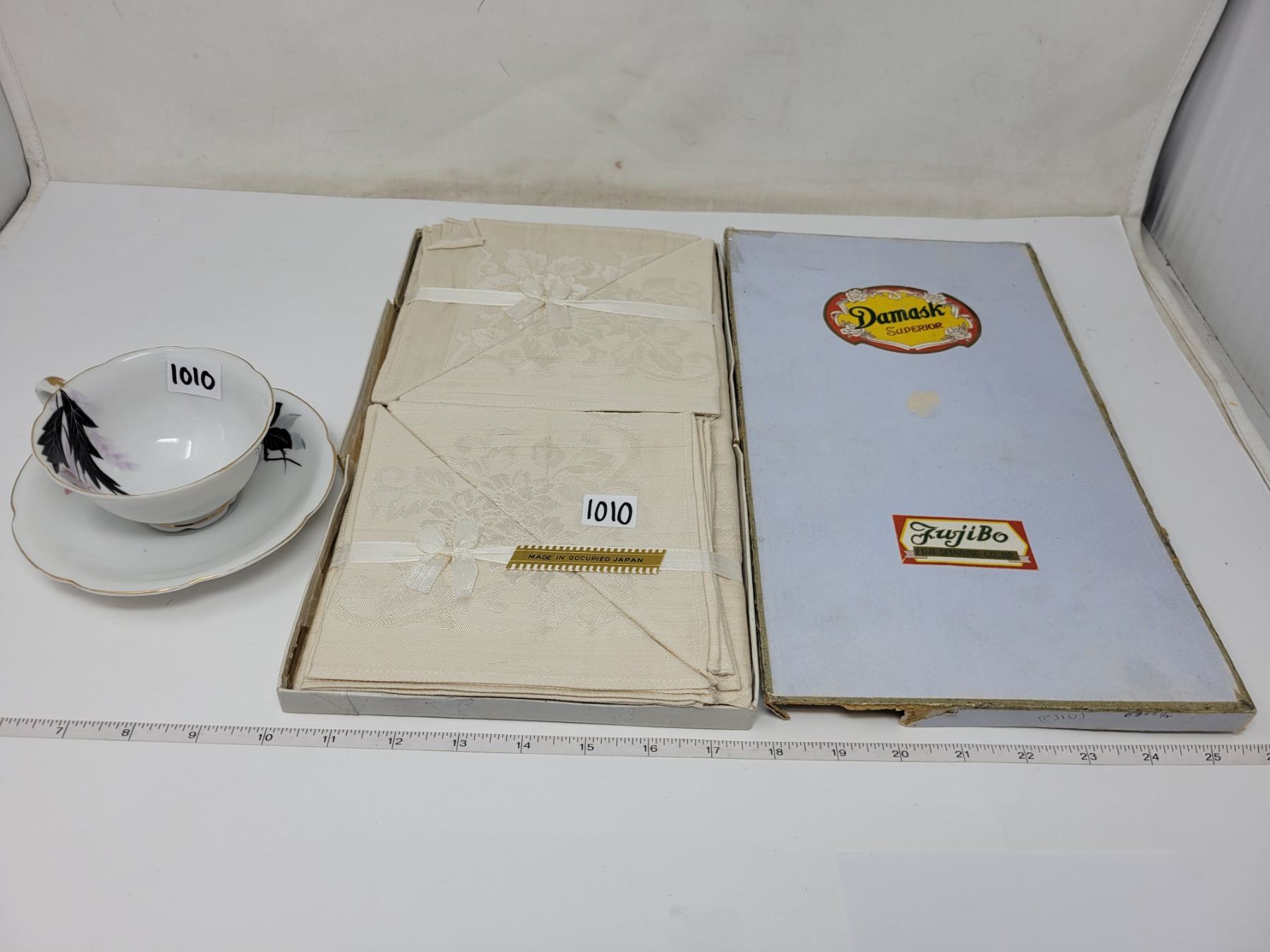 Occupied Japan cup & saucer, linen table cloth & napkins