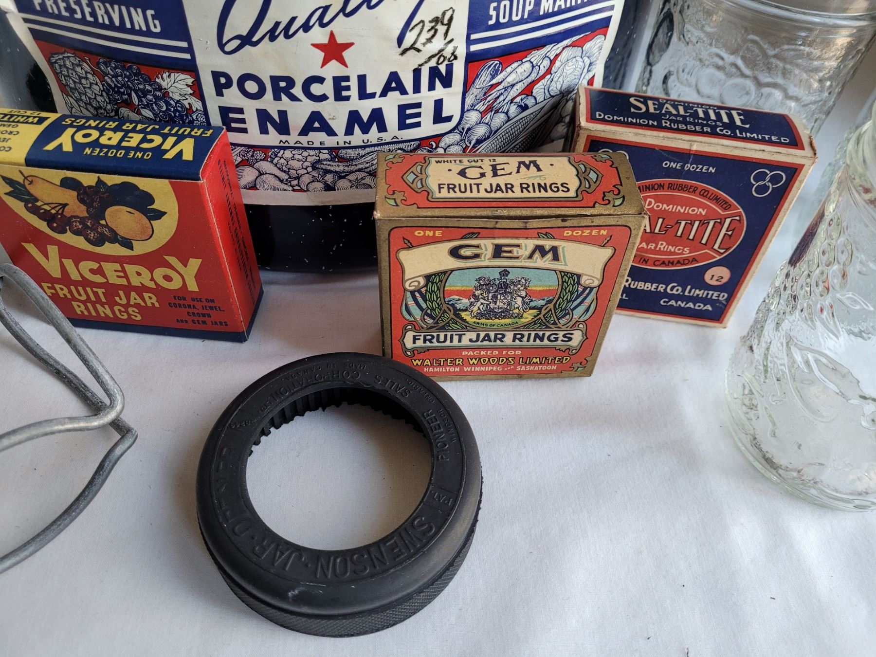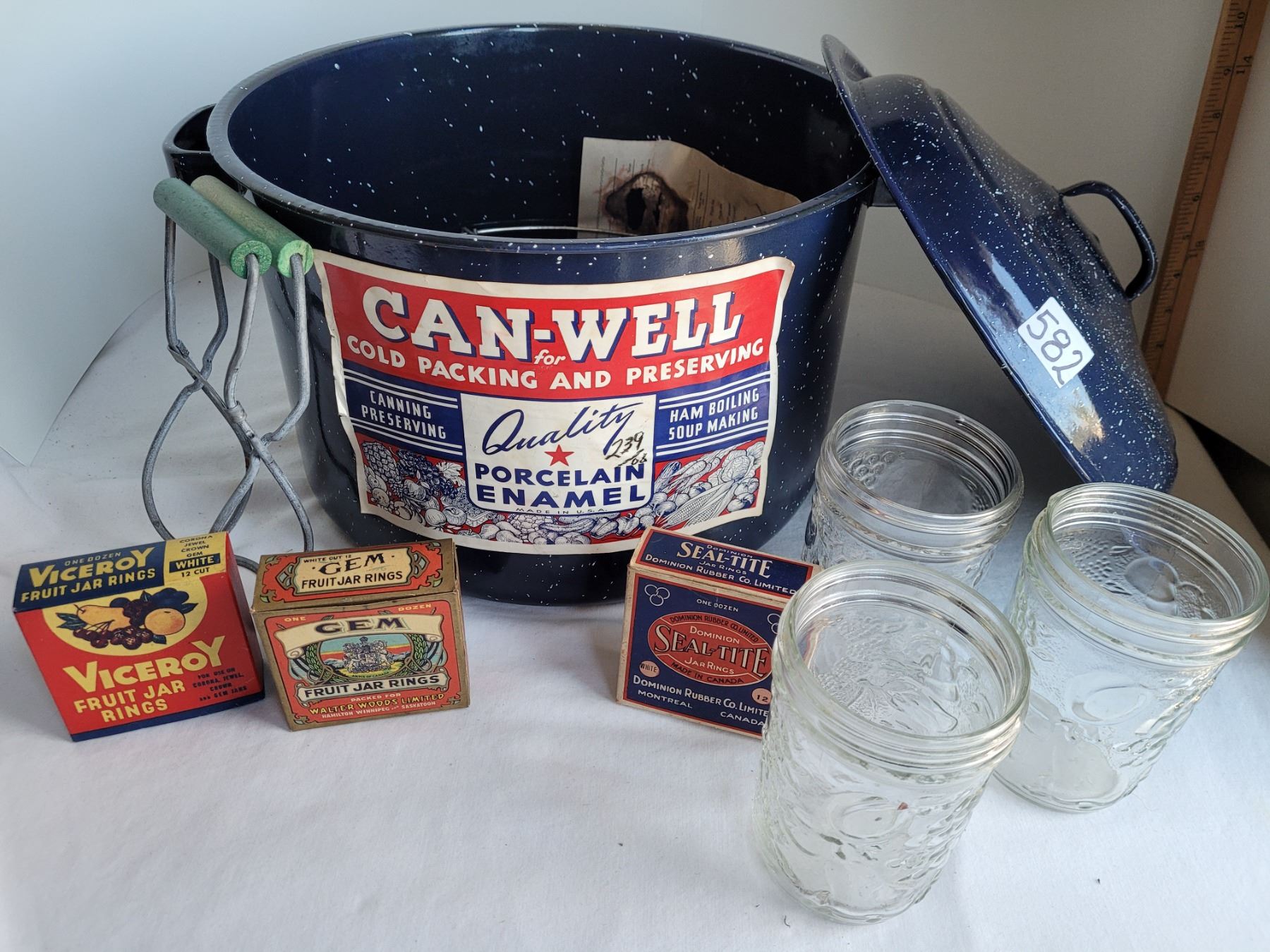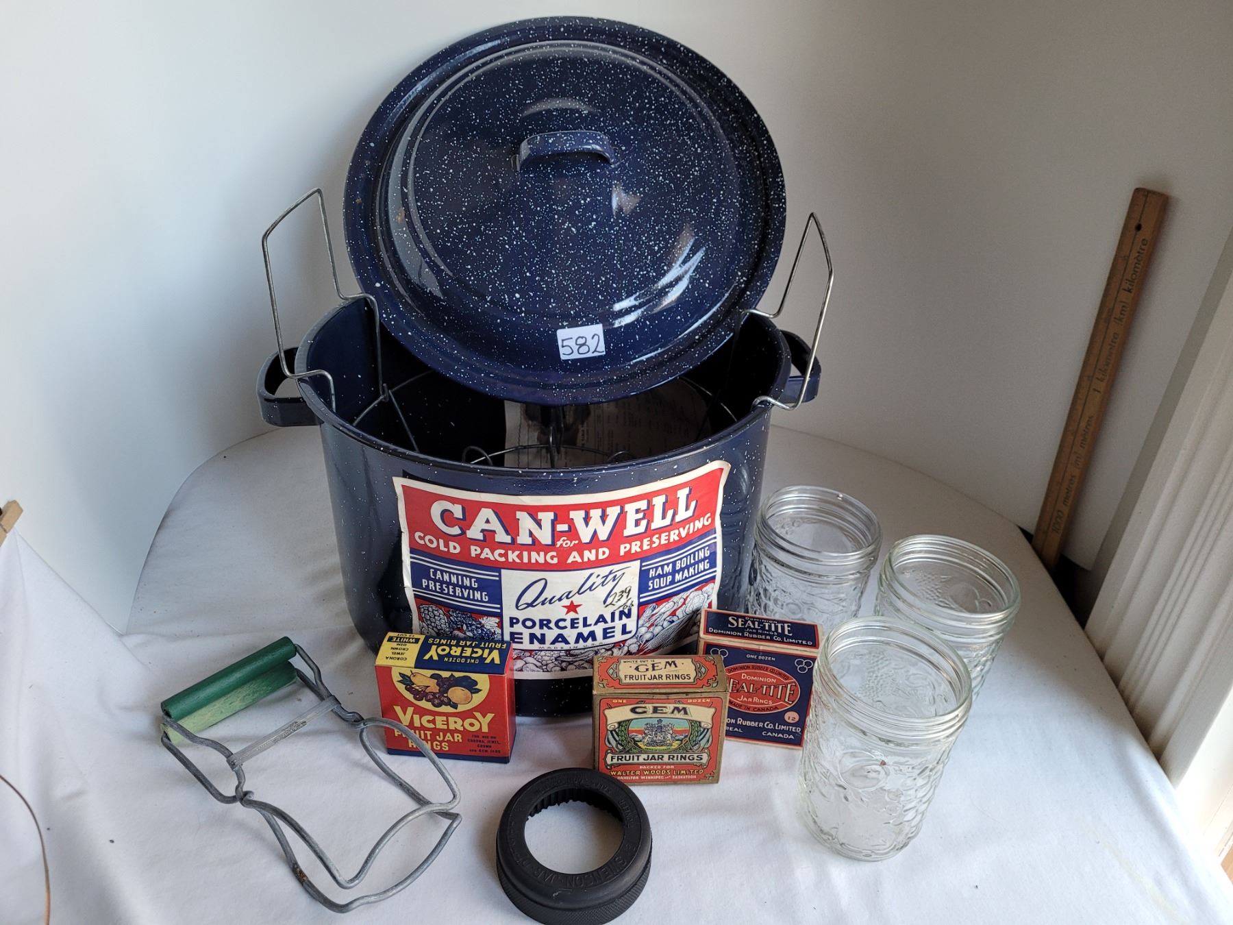 Old Canwell canner (never used). With jam jars, jar lifter, Jar opener & vintage rubber ring boxes.