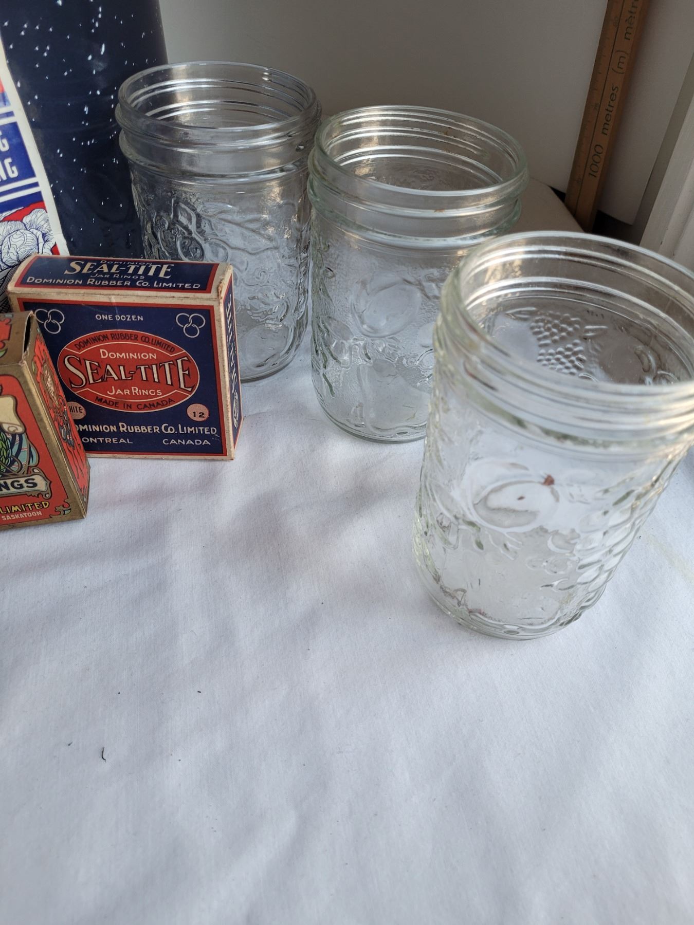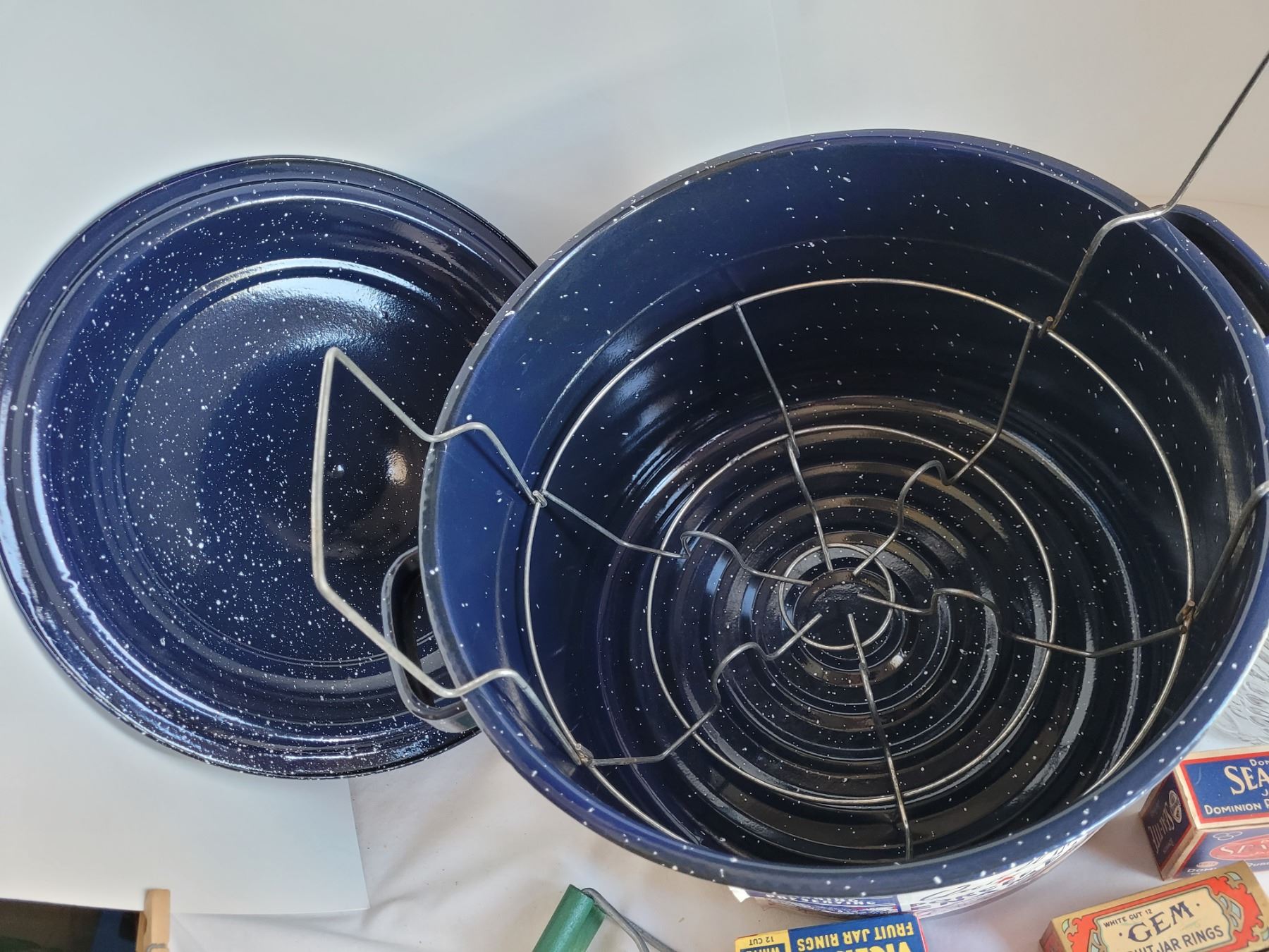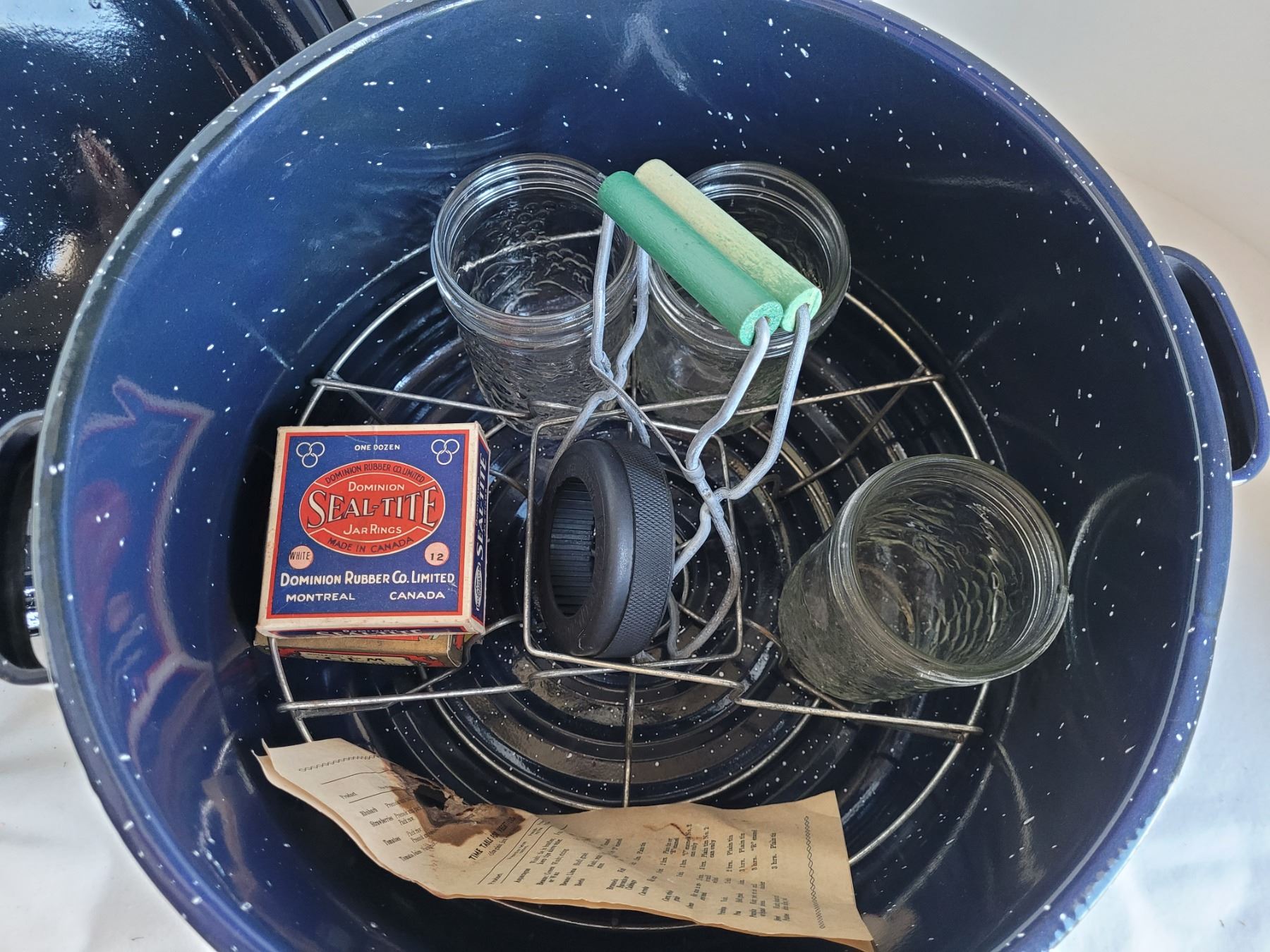 Old Canwell canner (never used). With jam jars, jar lifter, Jar opener & vintage rubber ring boxes.