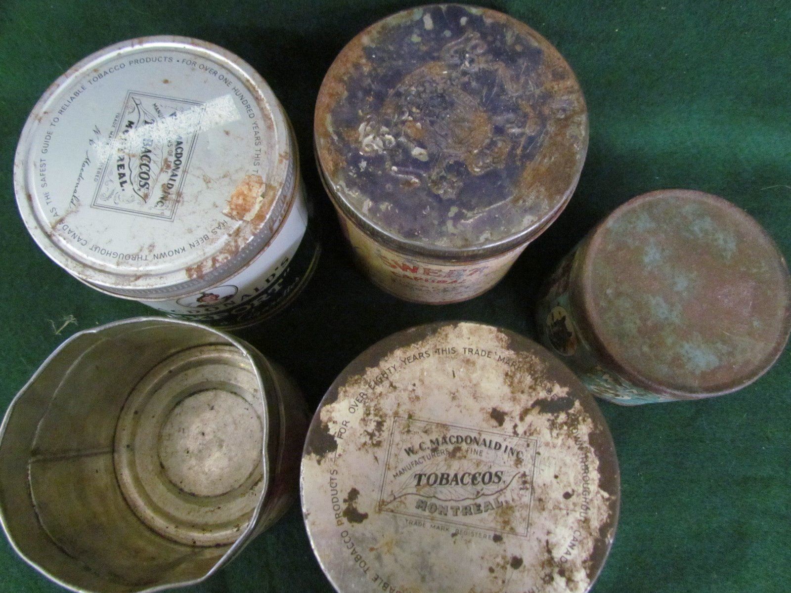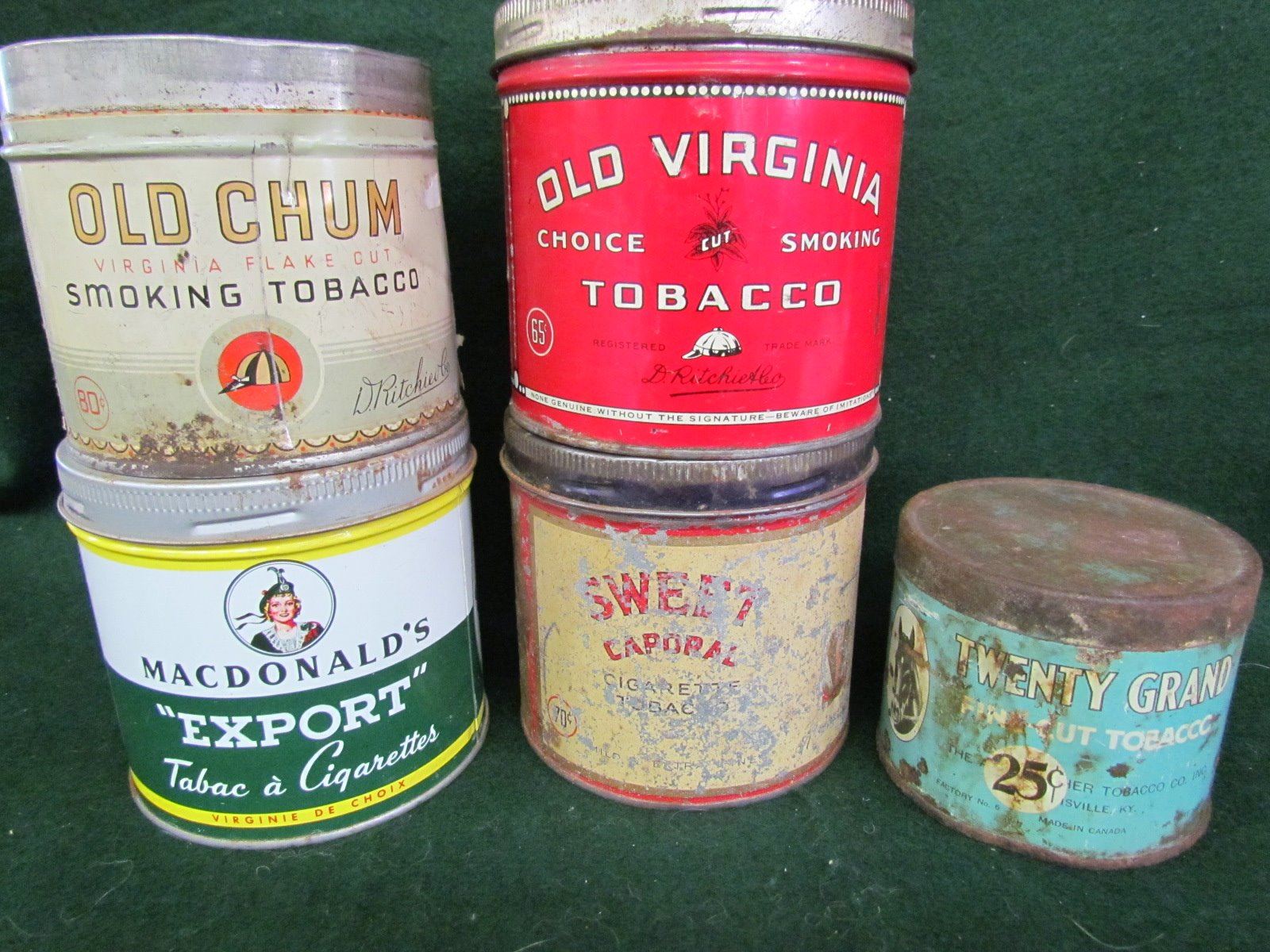 Old Chum, Macdonald's, Twenty Grand, Sweet Carporal, Old Virginia tobacco tins