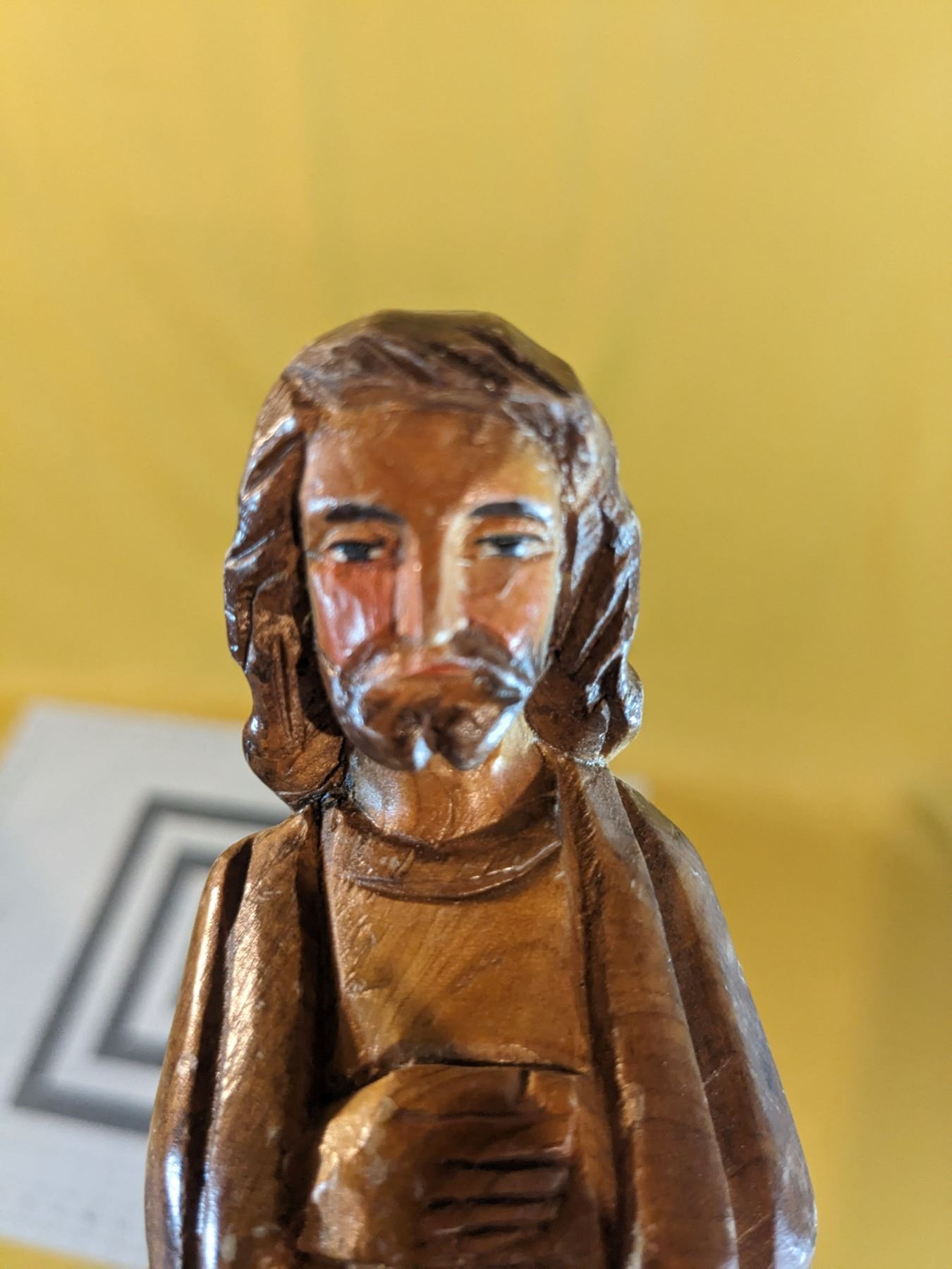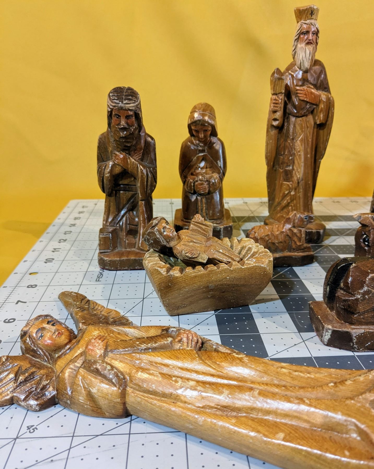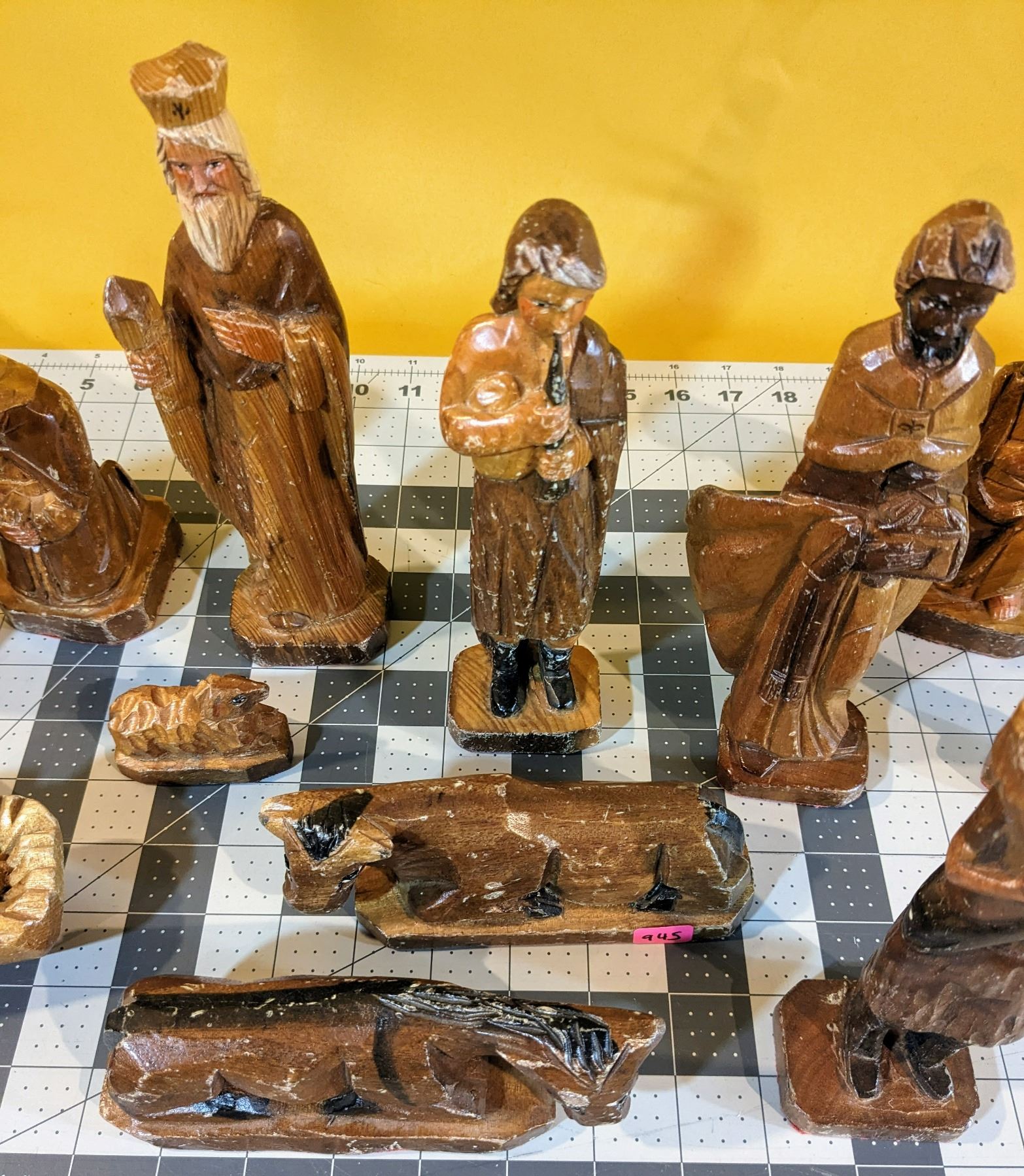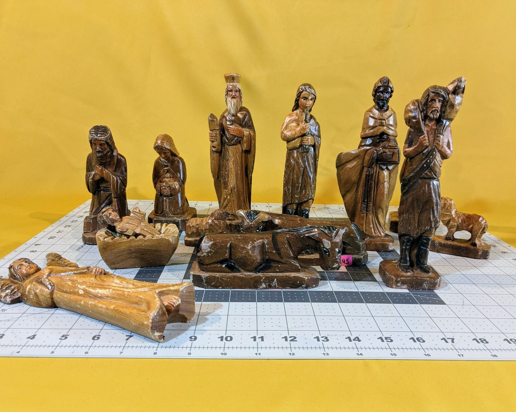 Old, hand-crafted and hand-painted, 14-piece nativity scene wood figurines.