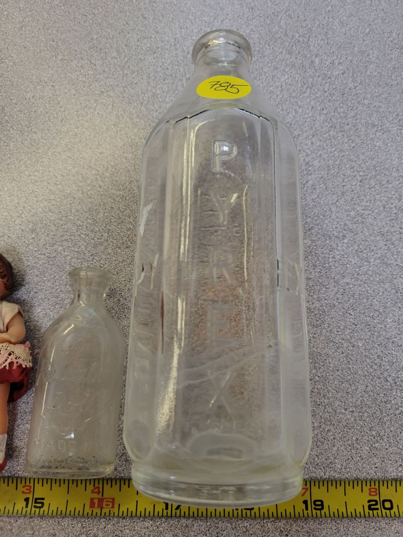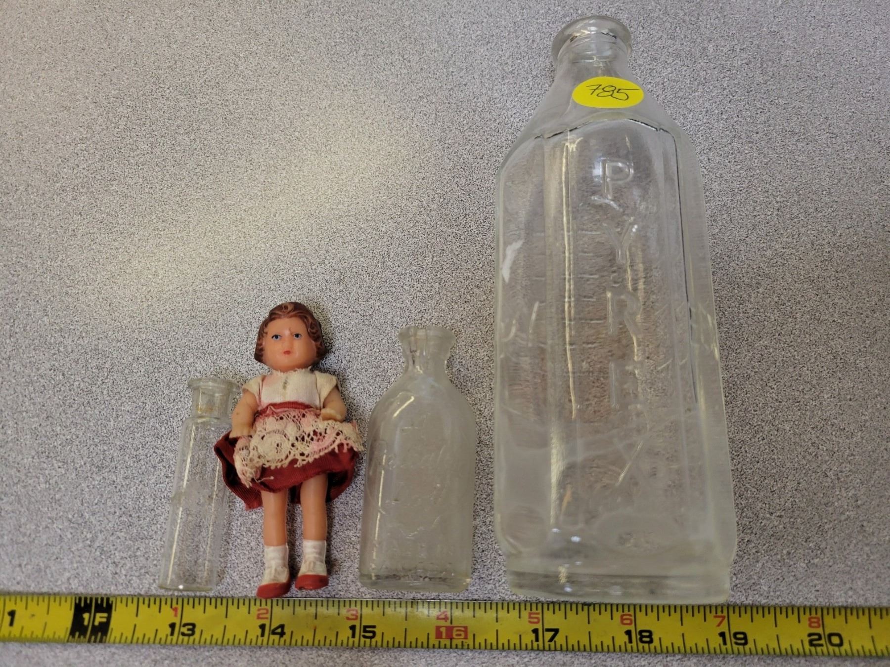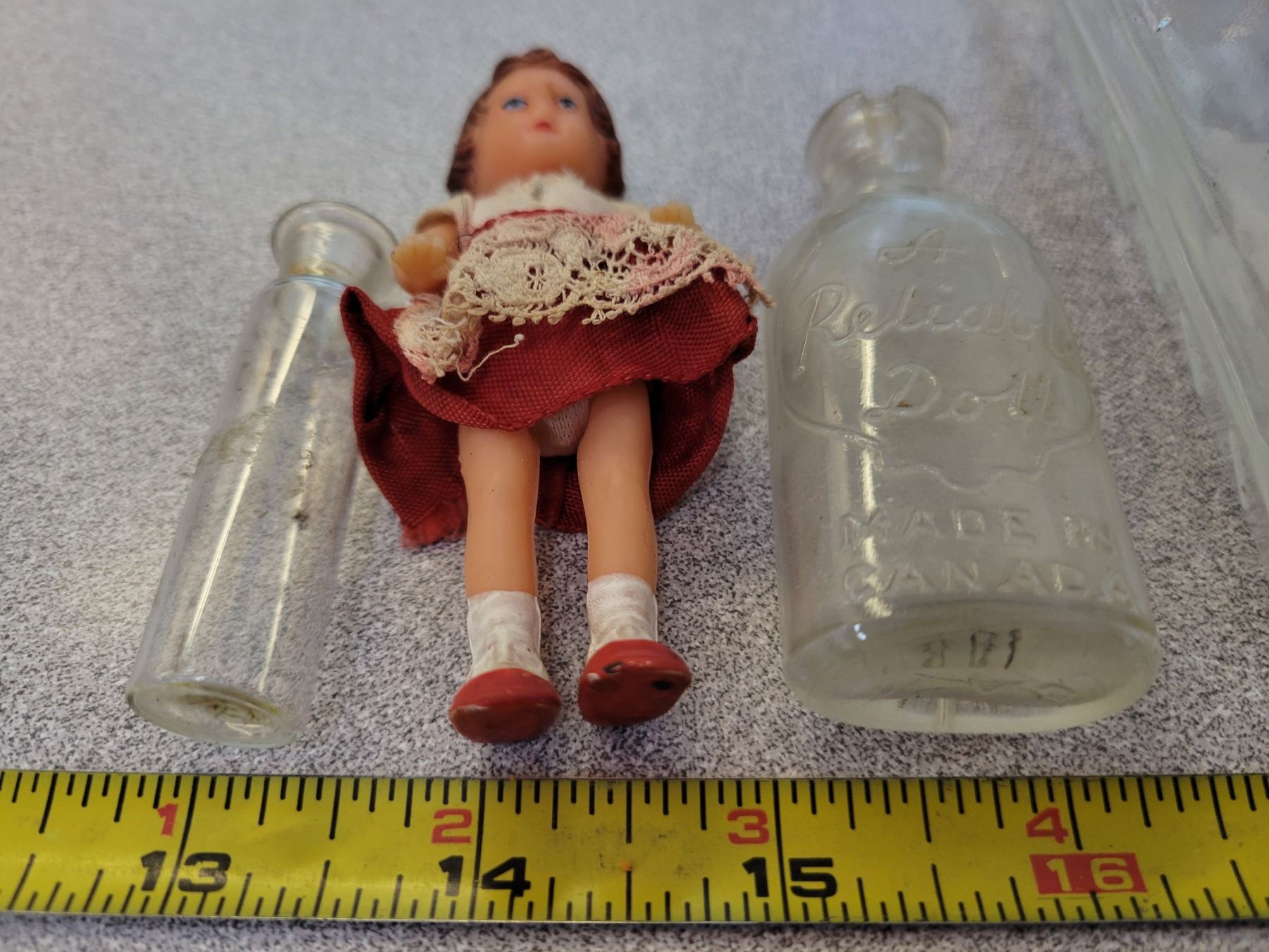 Old rubber doll, Pyrex bottle, reliable doll bottle, Carter's little liver pills bottle