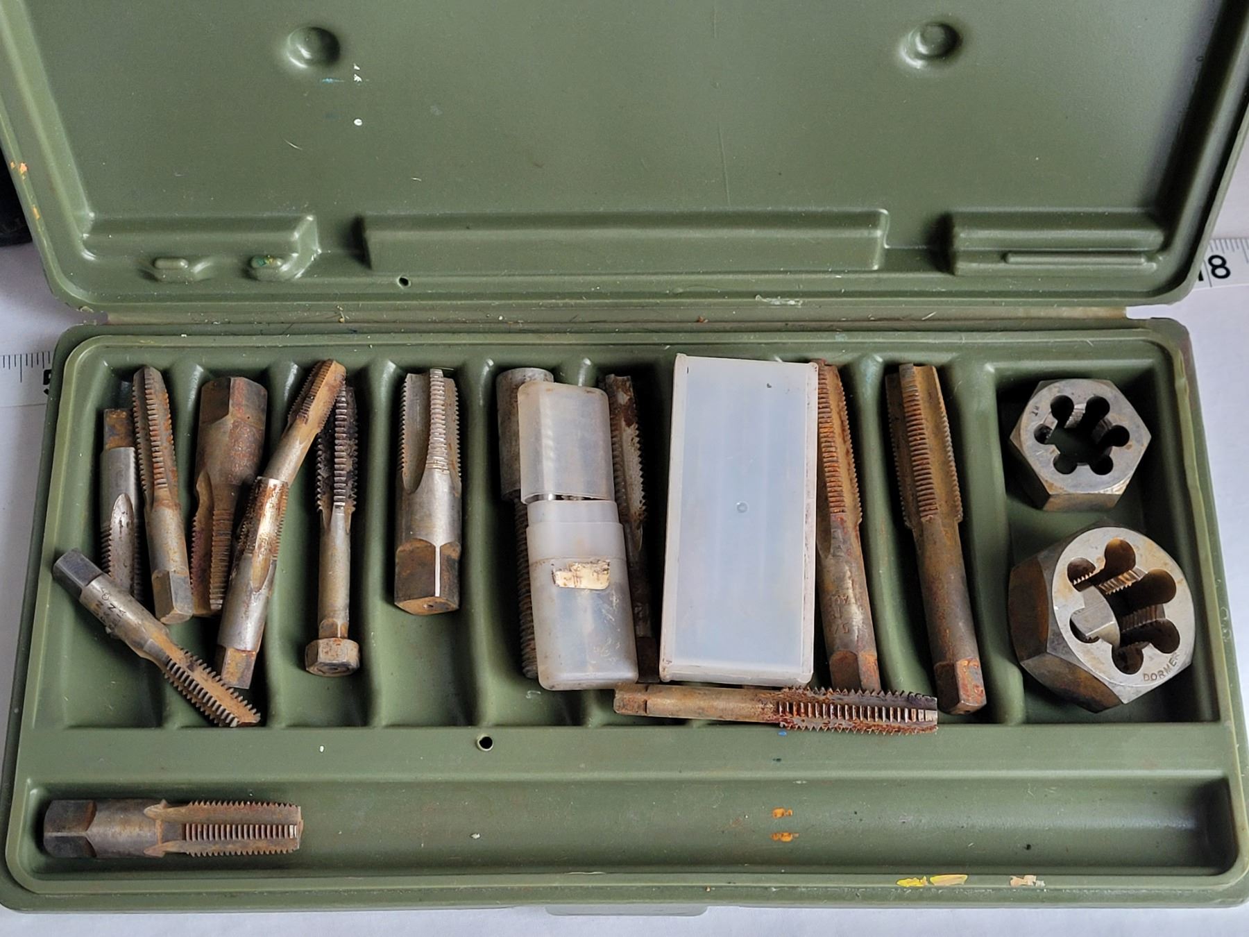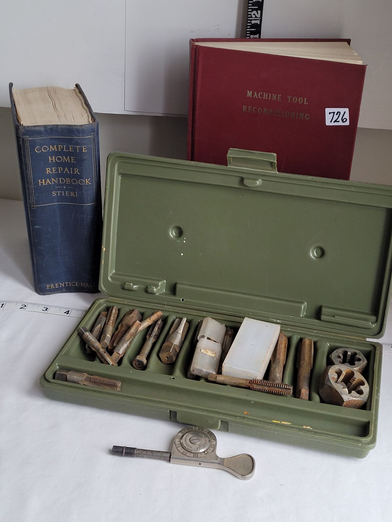 Old tap & Dye. Machine & Home repair books plus RPM gage.