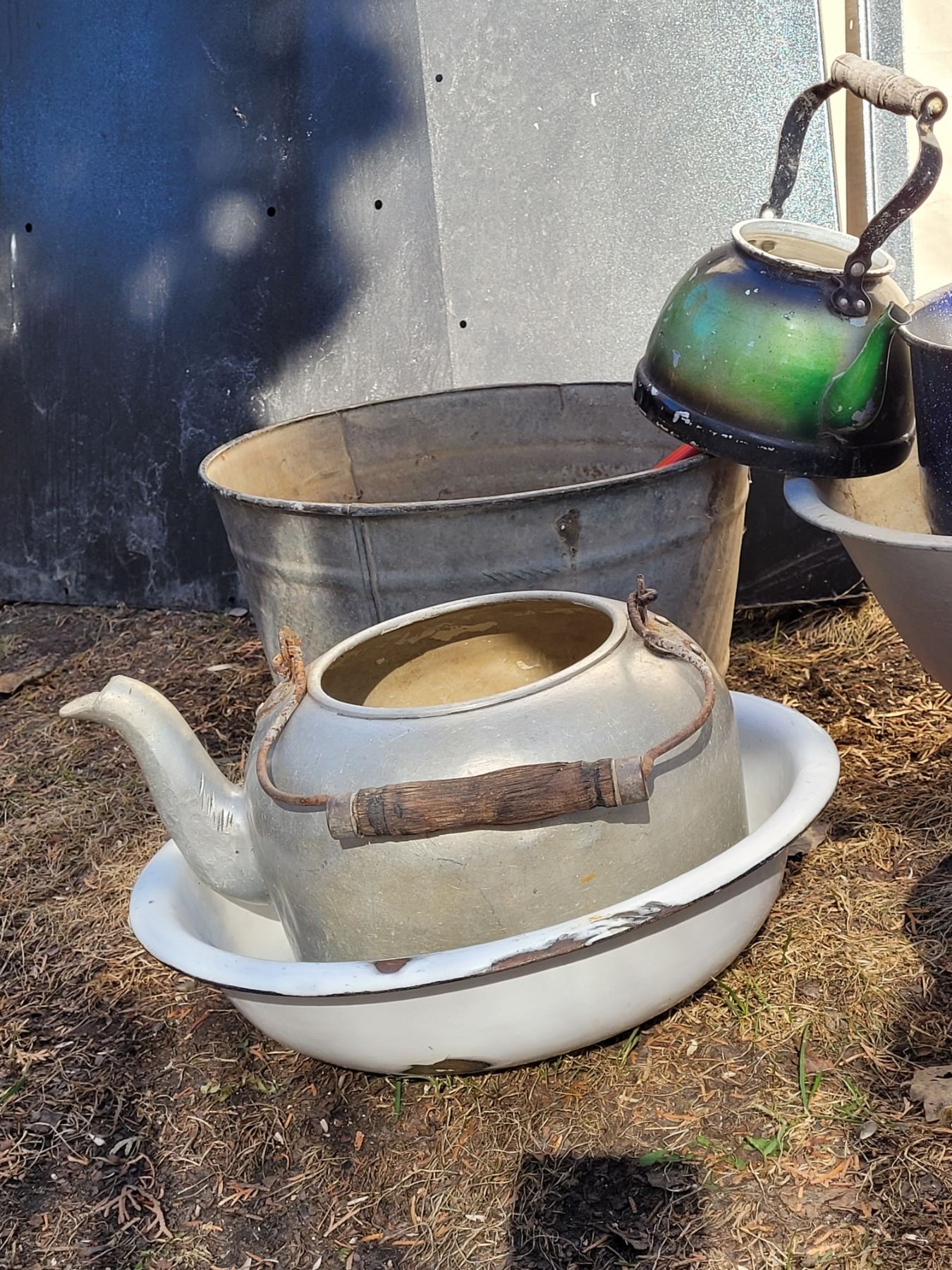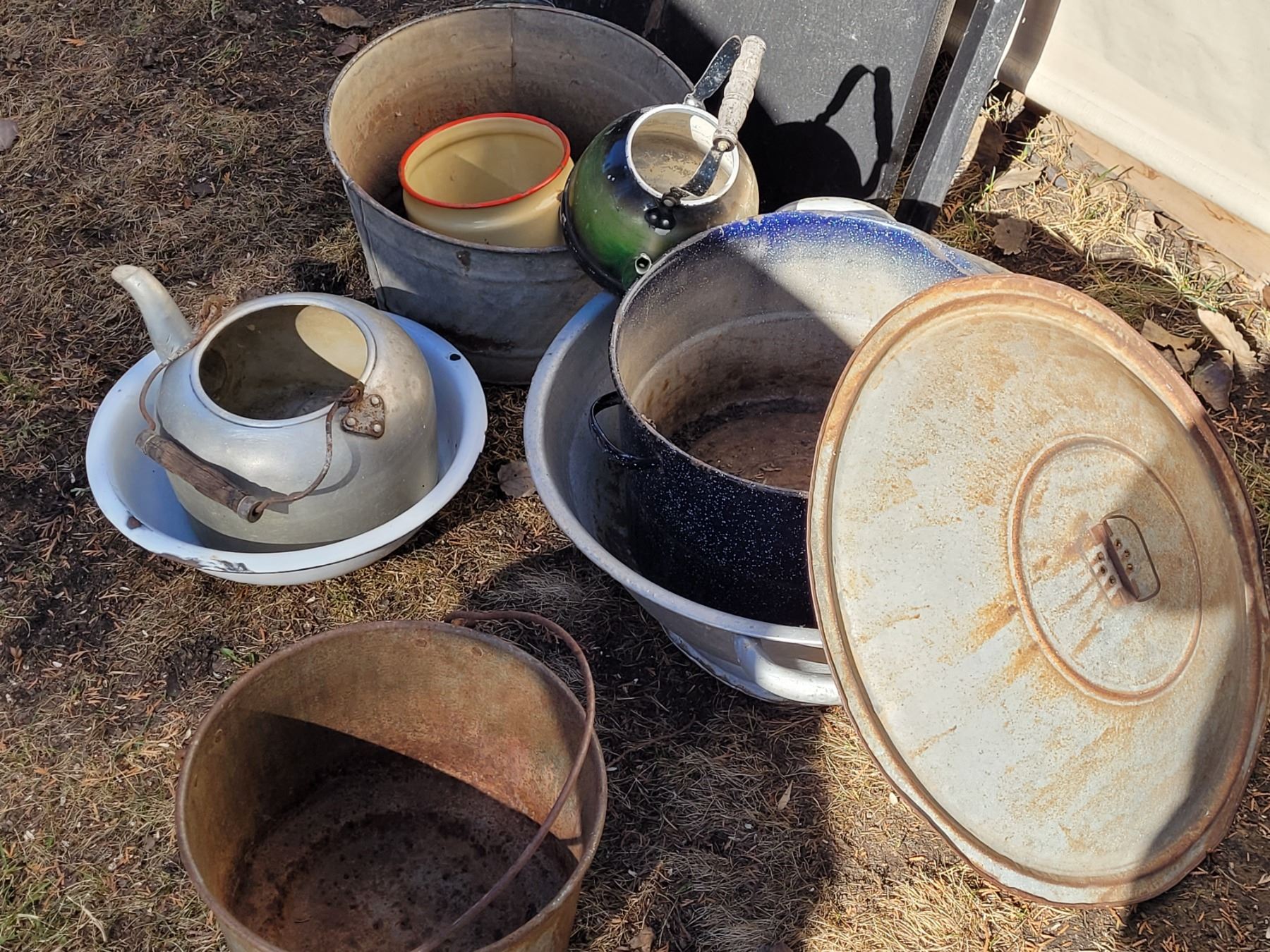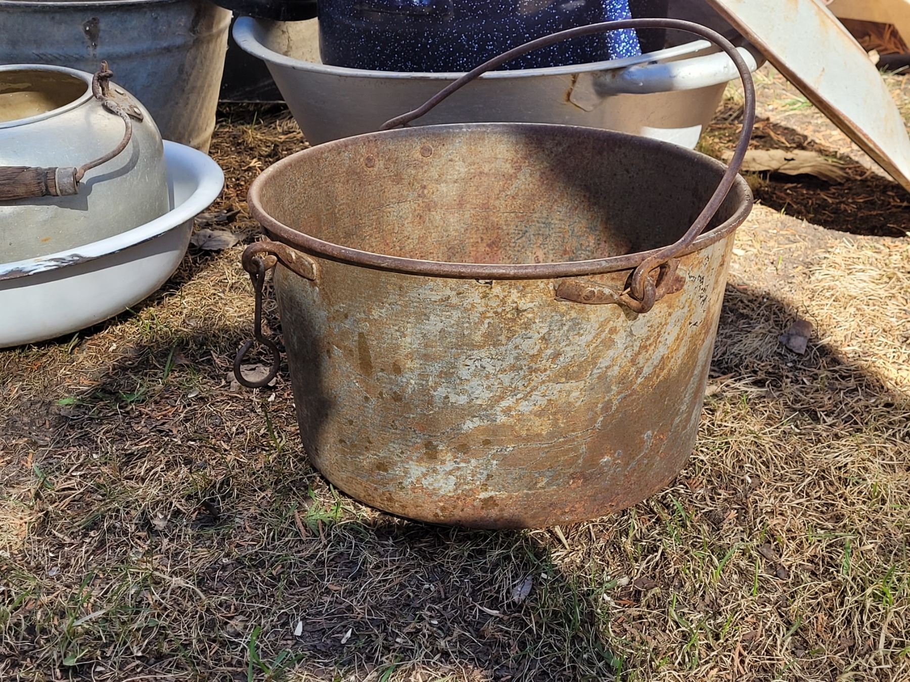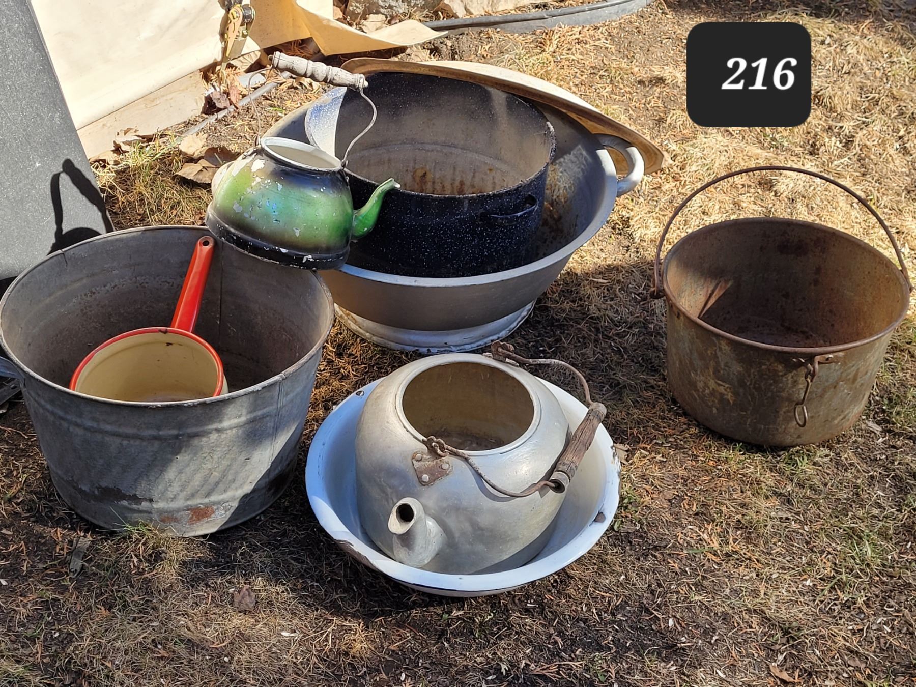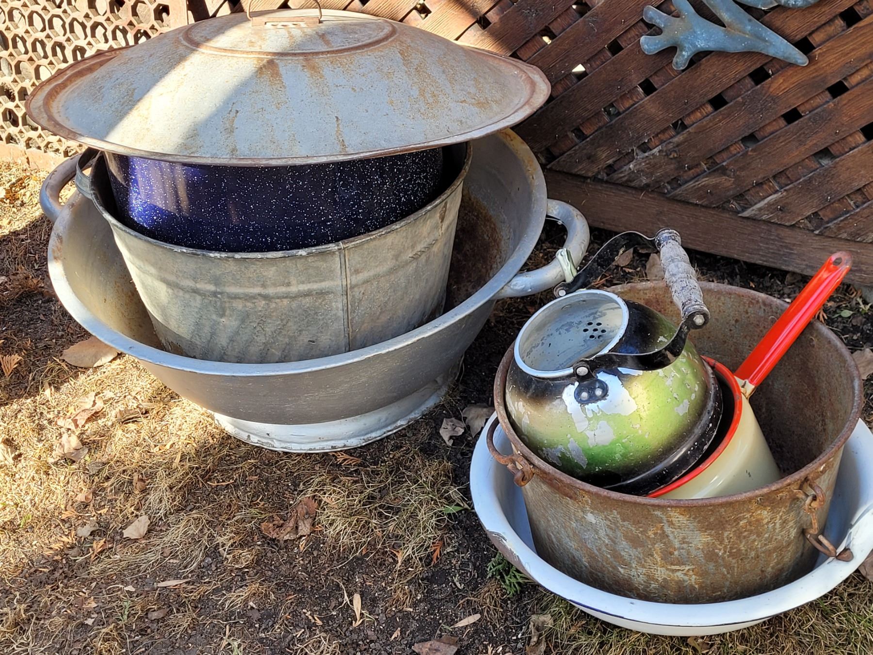 Old time fire place pot. Assorted enamel, galvanized & aluminum usable gardening planters.