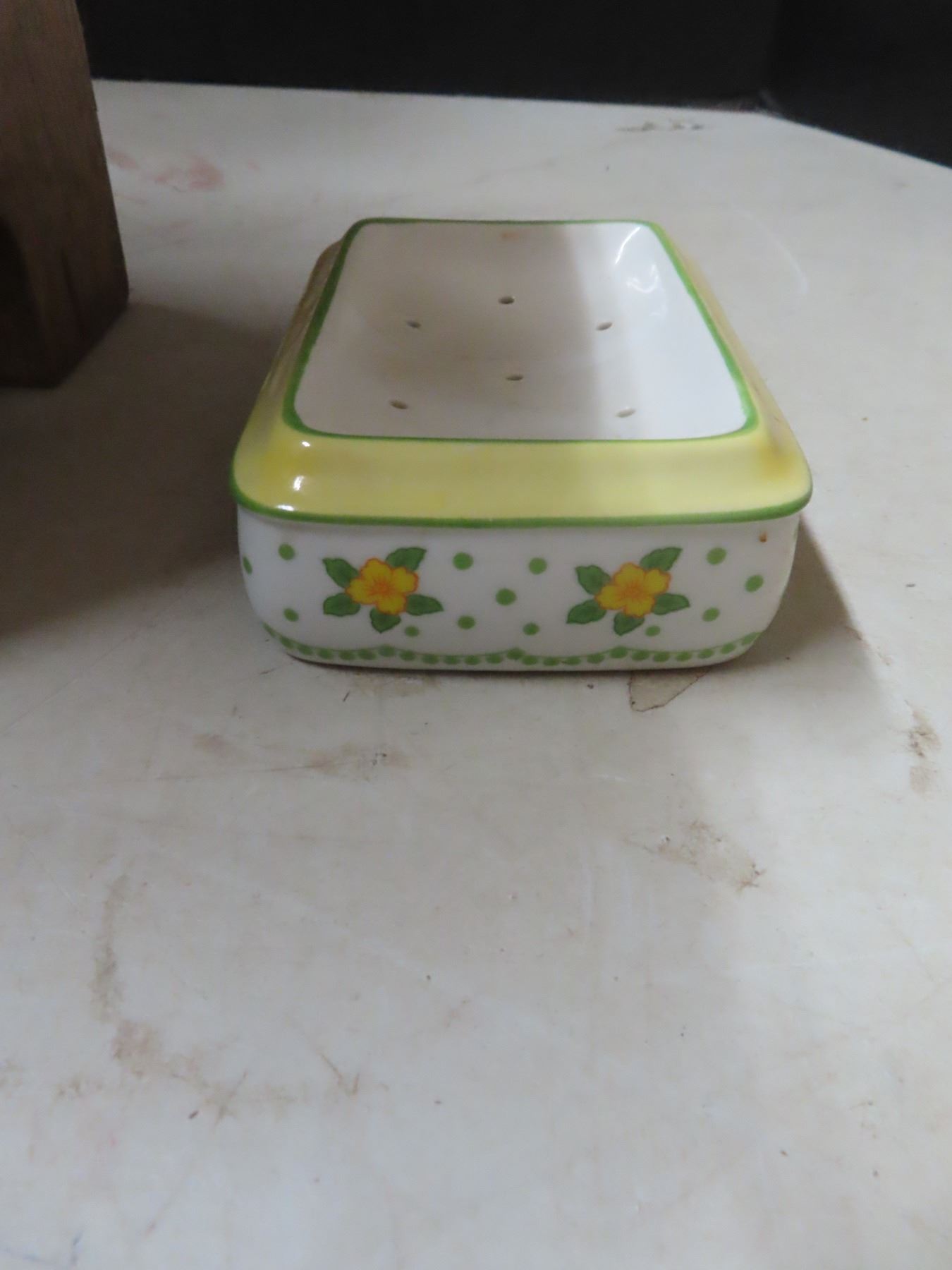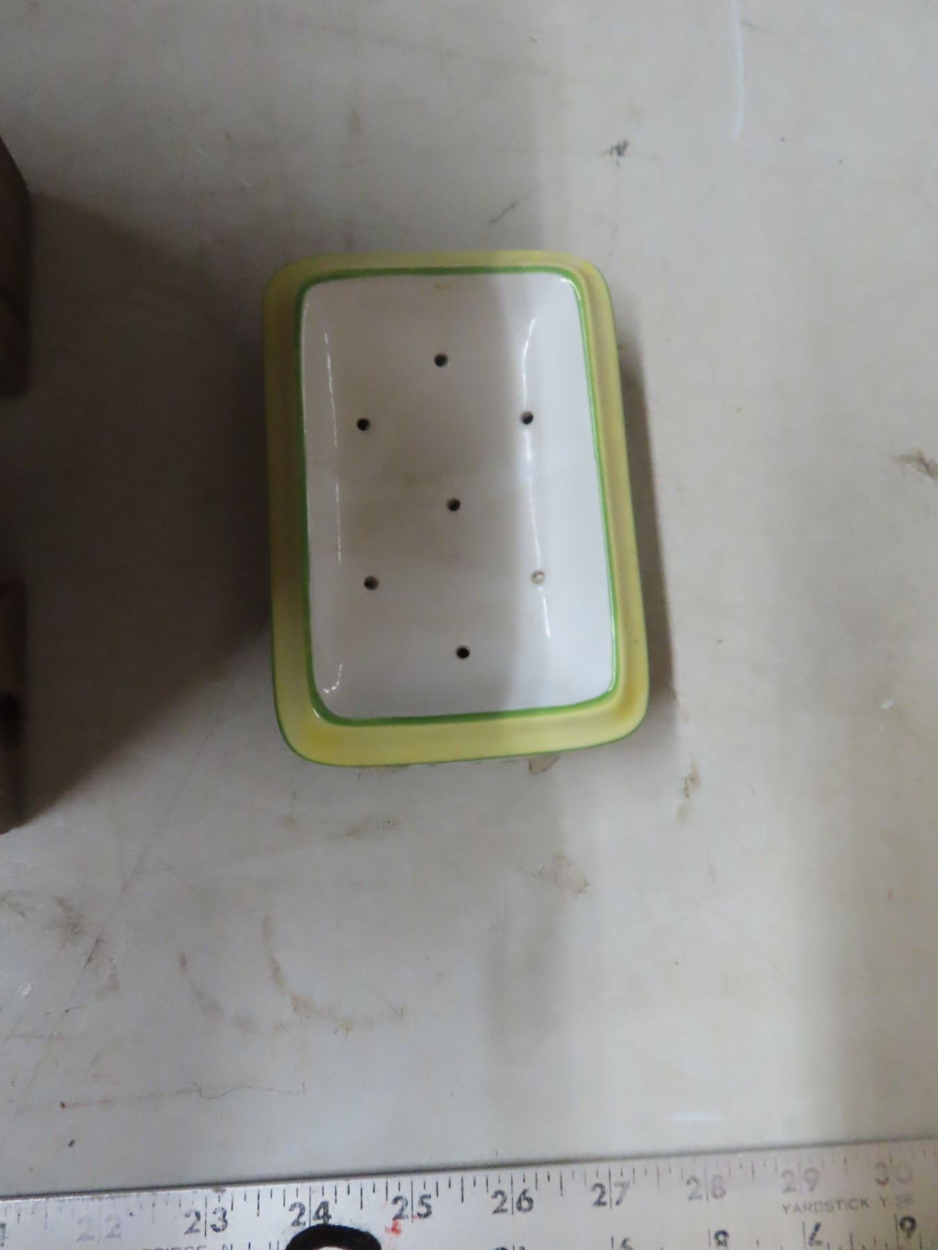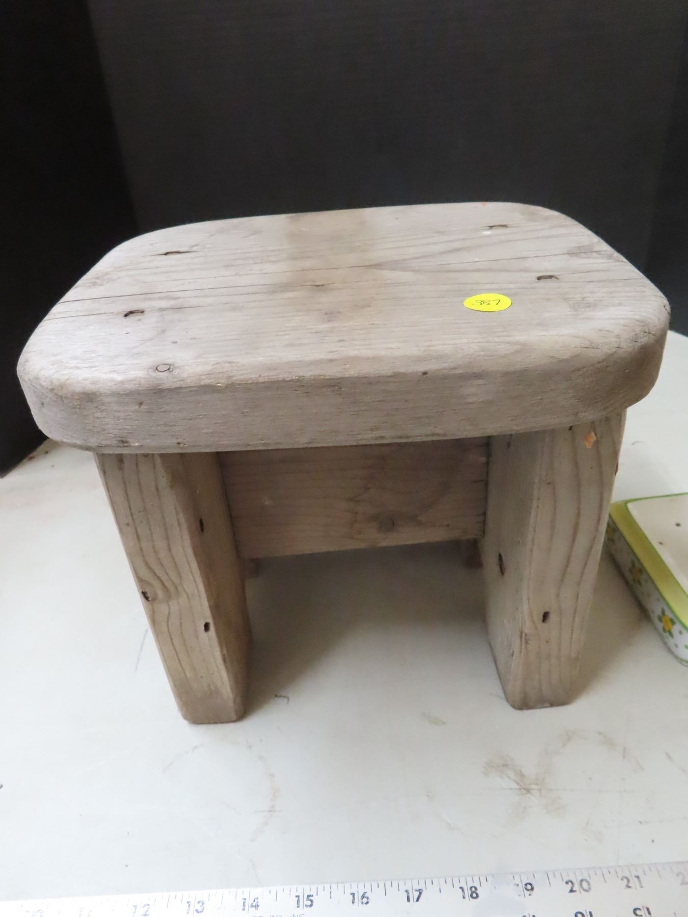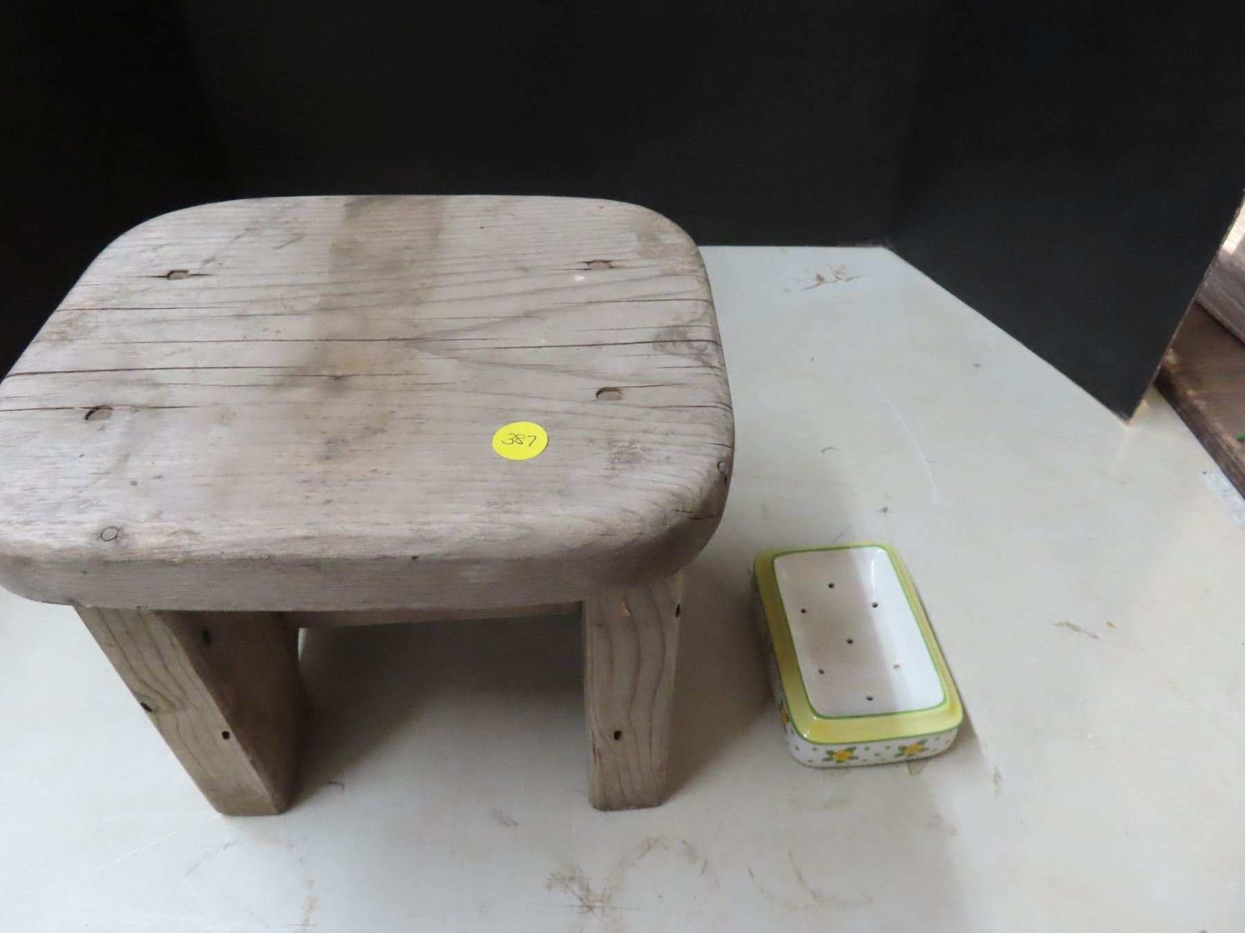 Old wooden bathroom stool (11"x9"x9") and vintage style metal soad dish