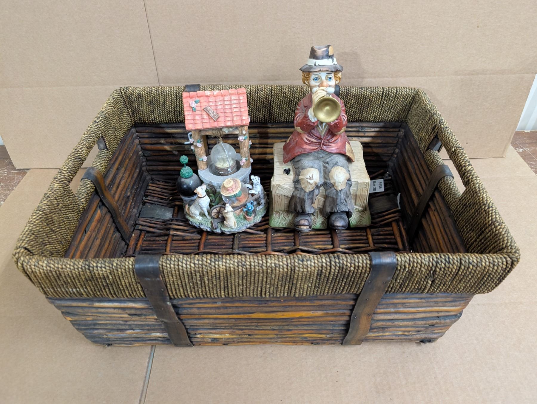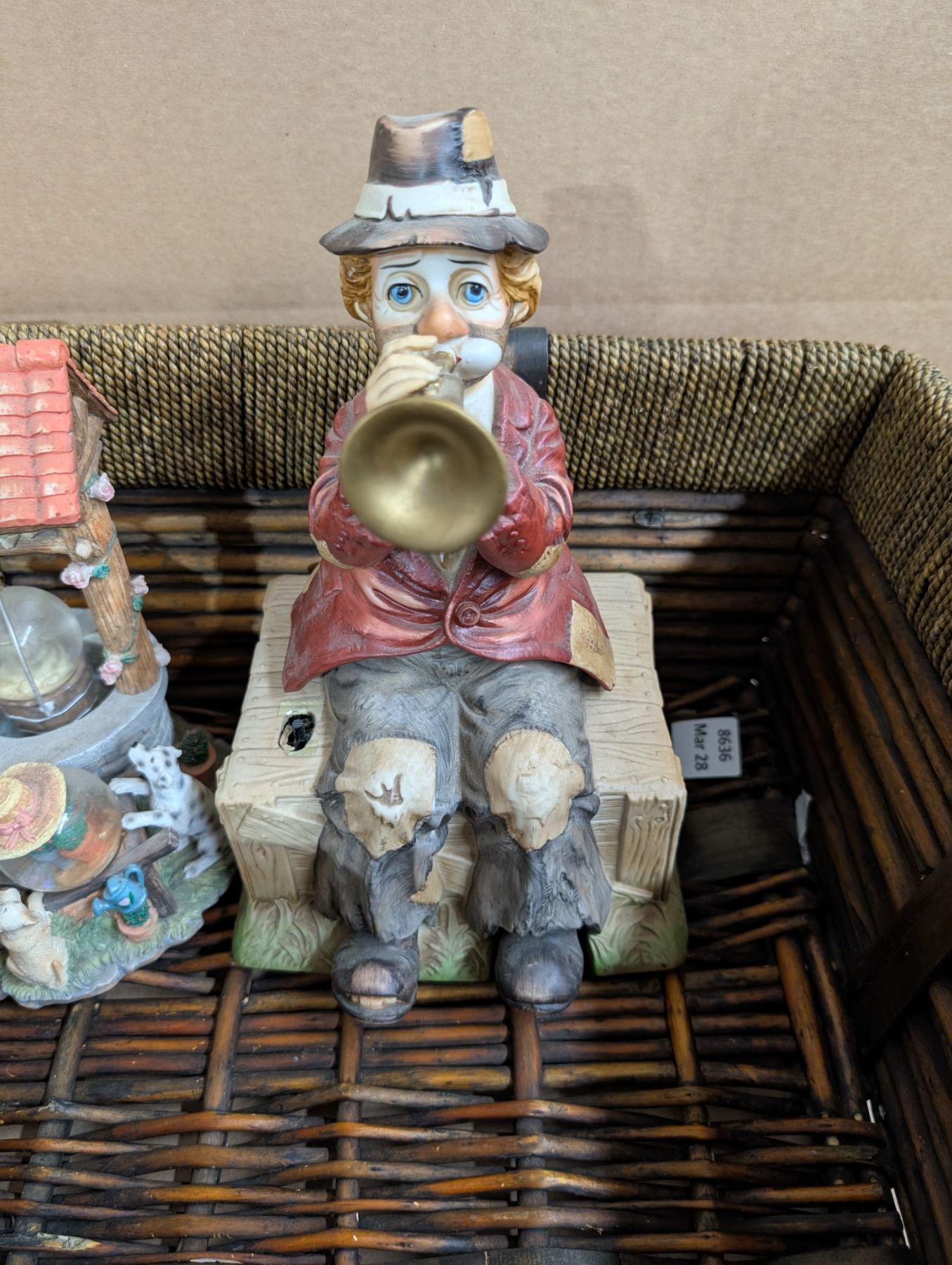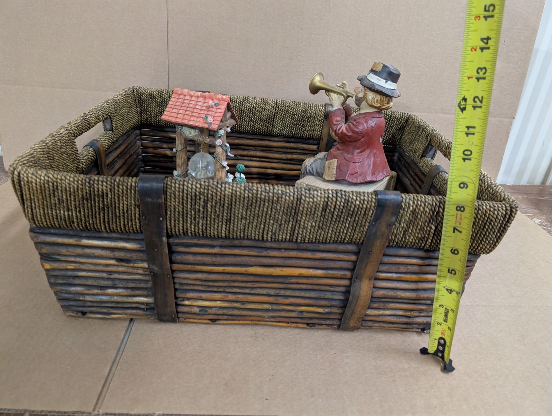 Older Wood Basket w/ Well Design Decor and Musical trumpet Clown (Needs Batteries)