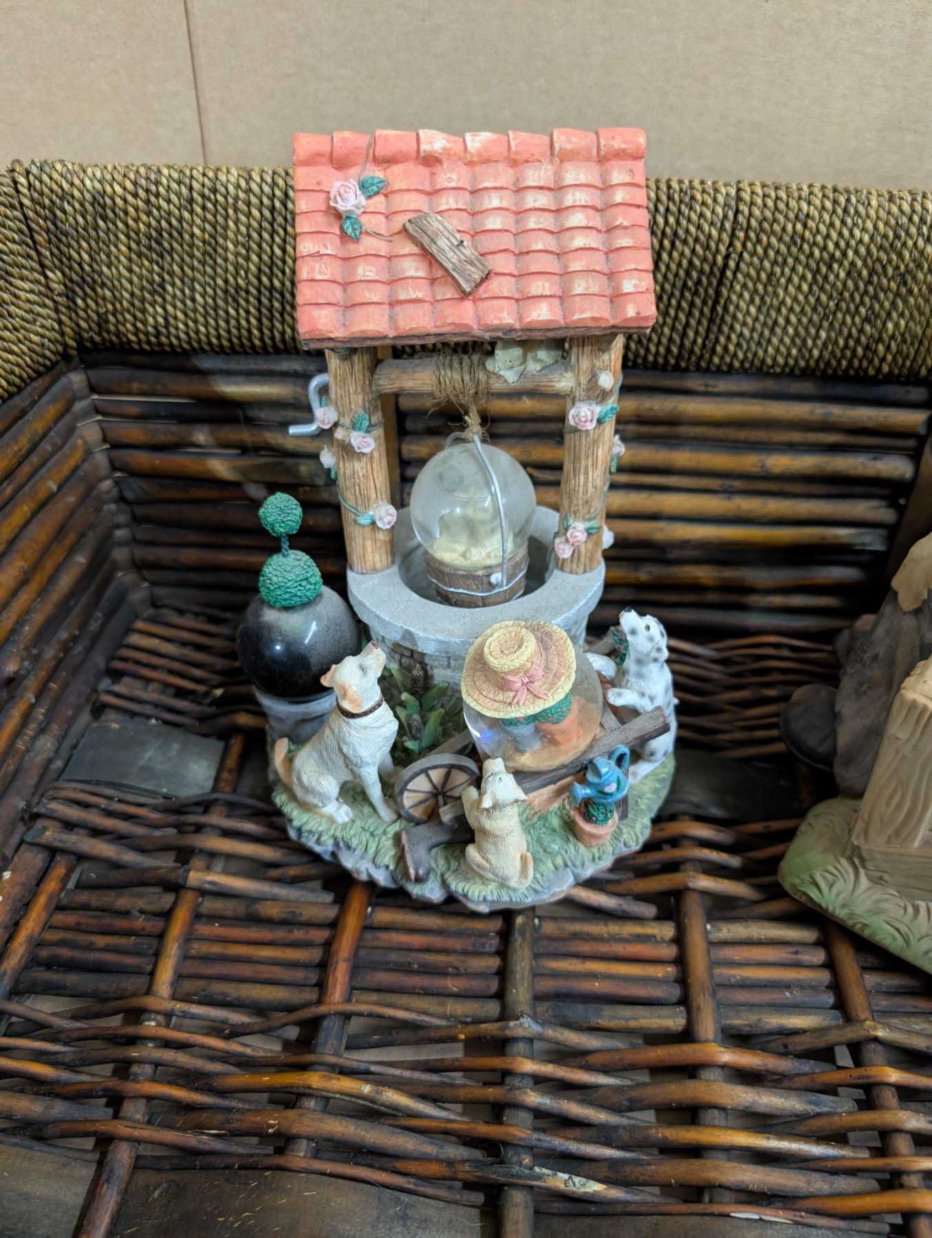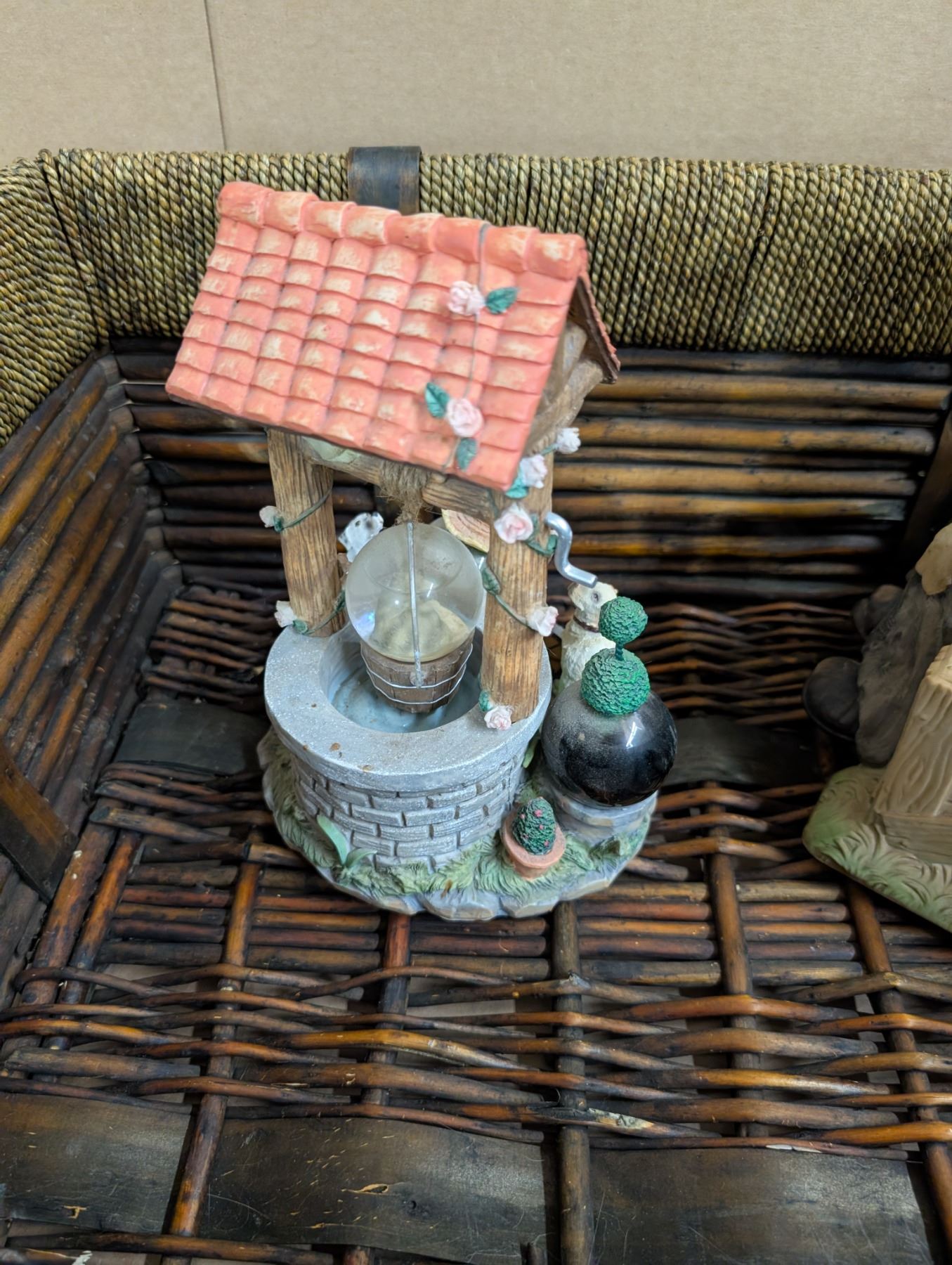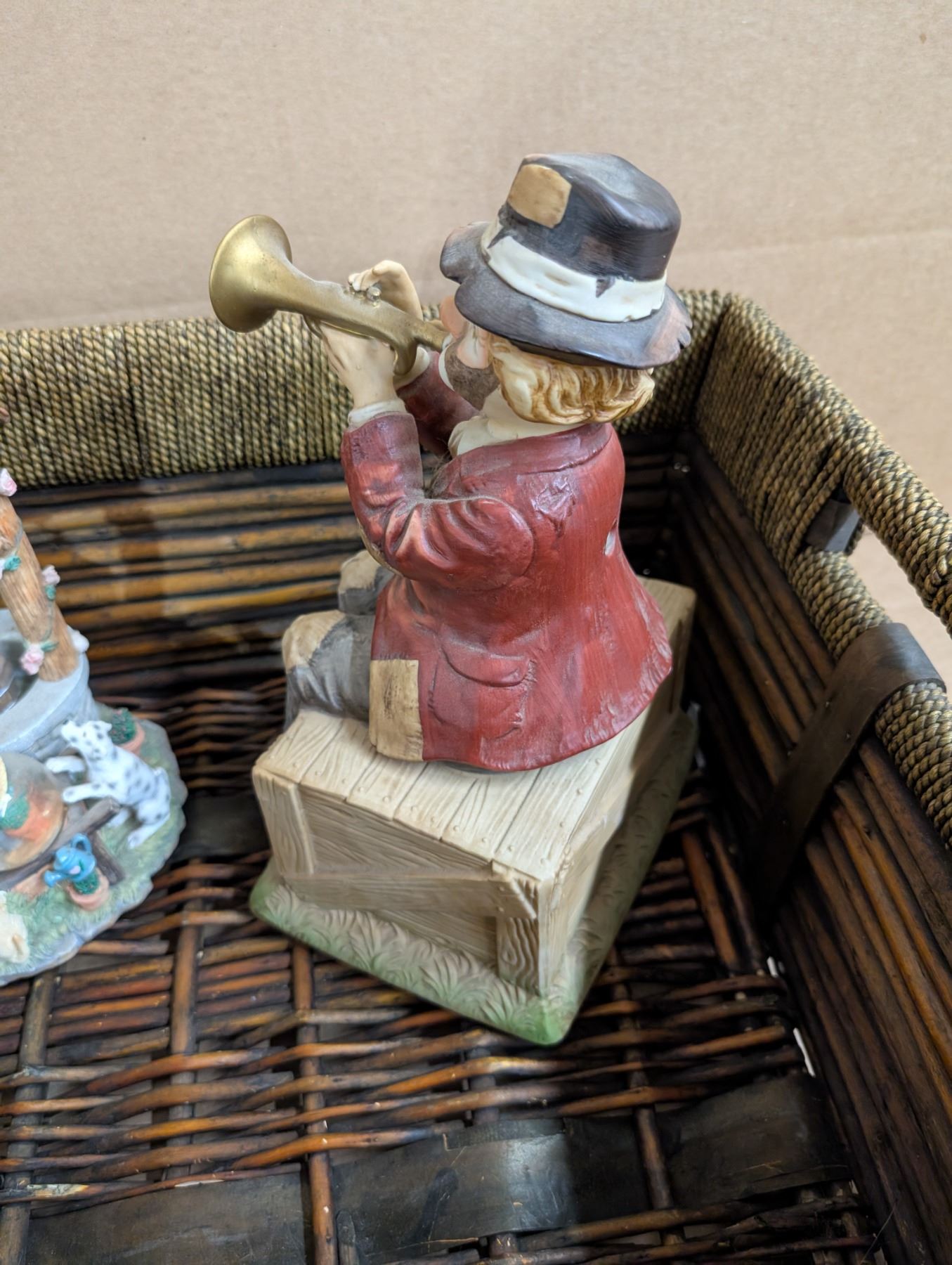 Older Wood Basket w/ Well Design Decor and Musical trumpet Clown (Needs Batteries)