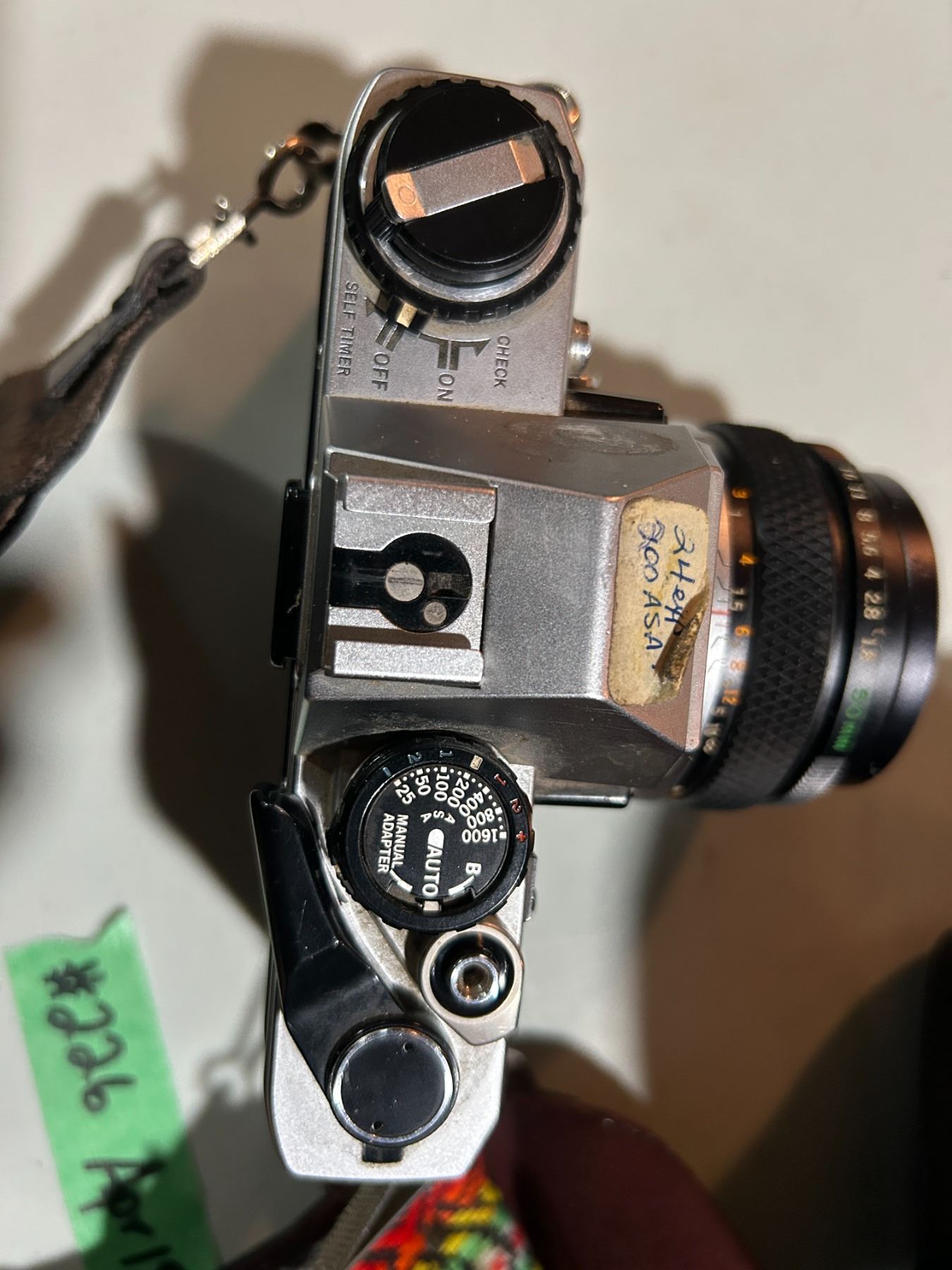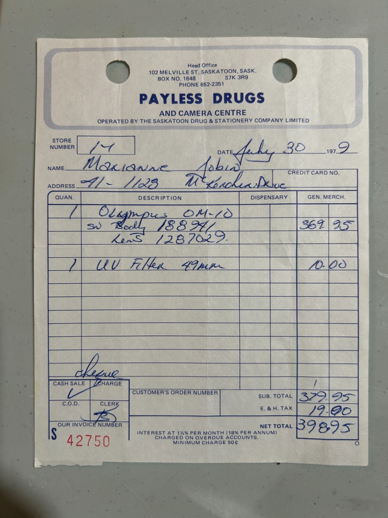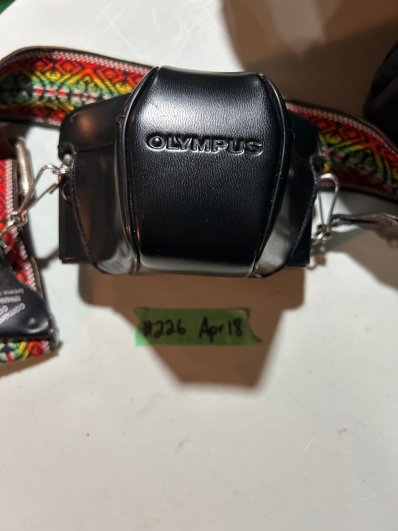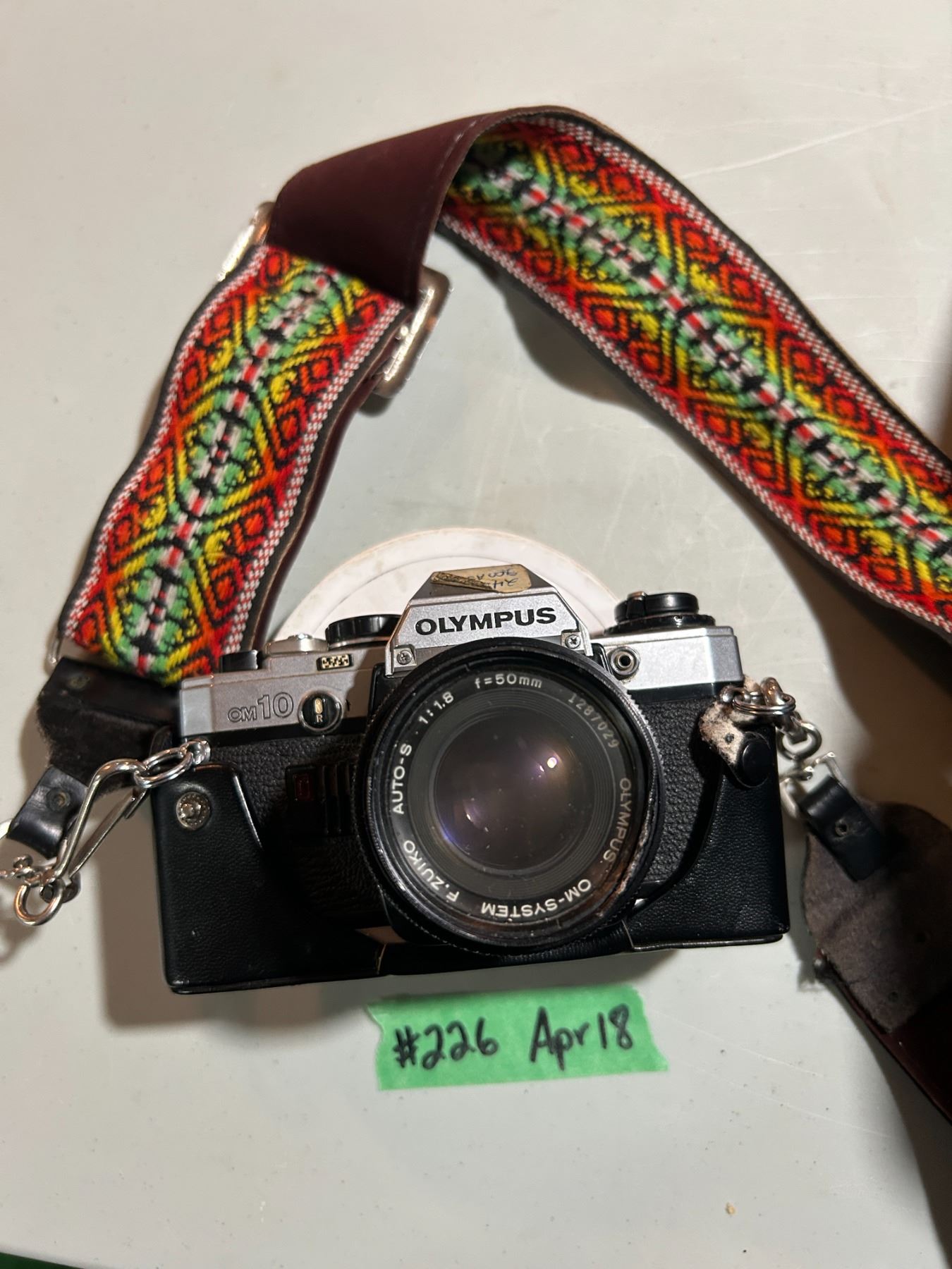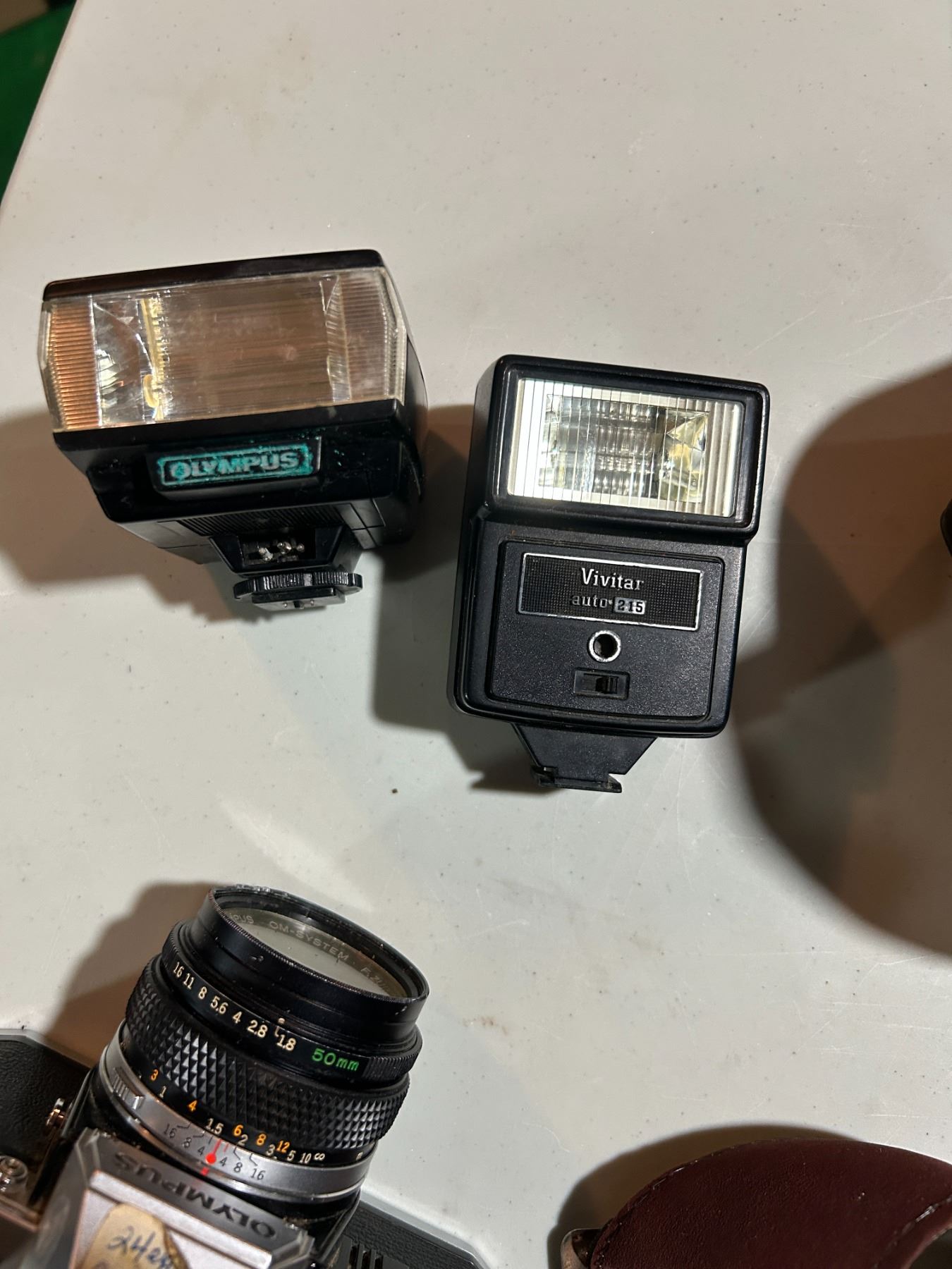 Olympus OM10 35mm camera with Wolf brand case, flash attachment, original invoice