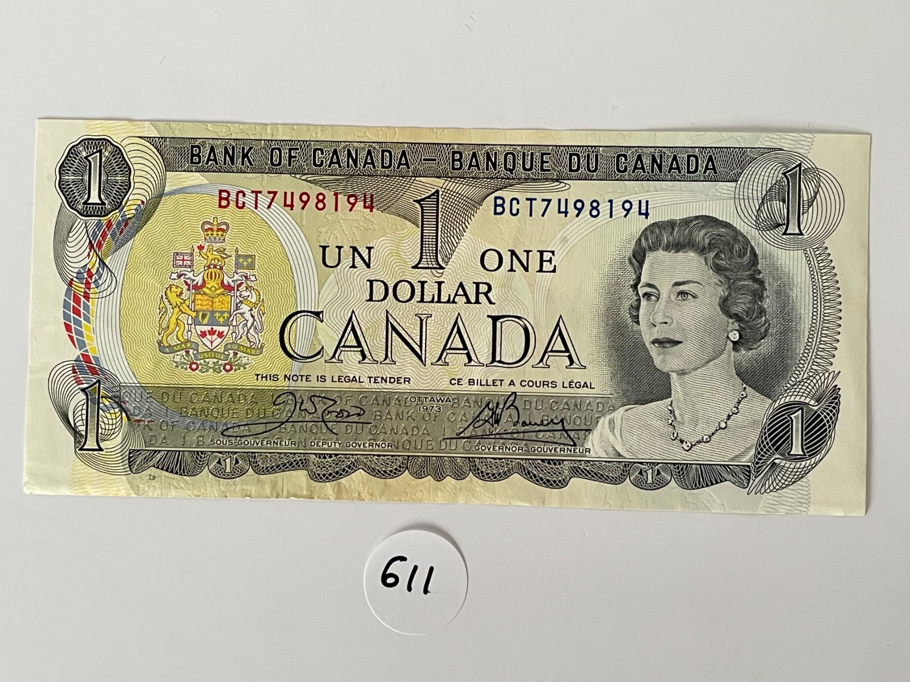 One Paper Dollar Canadian Serial # BCT7498194 (from 1973)