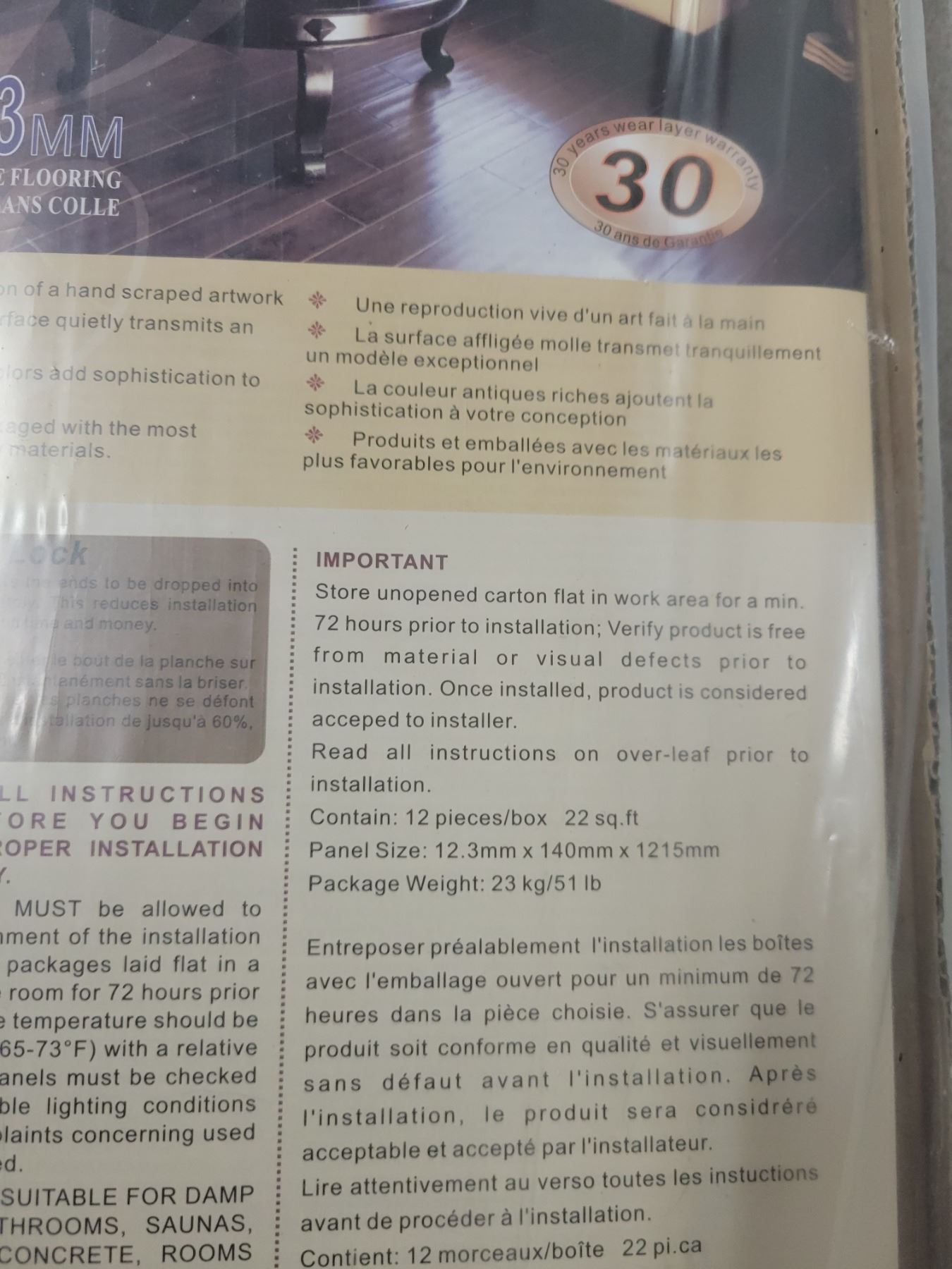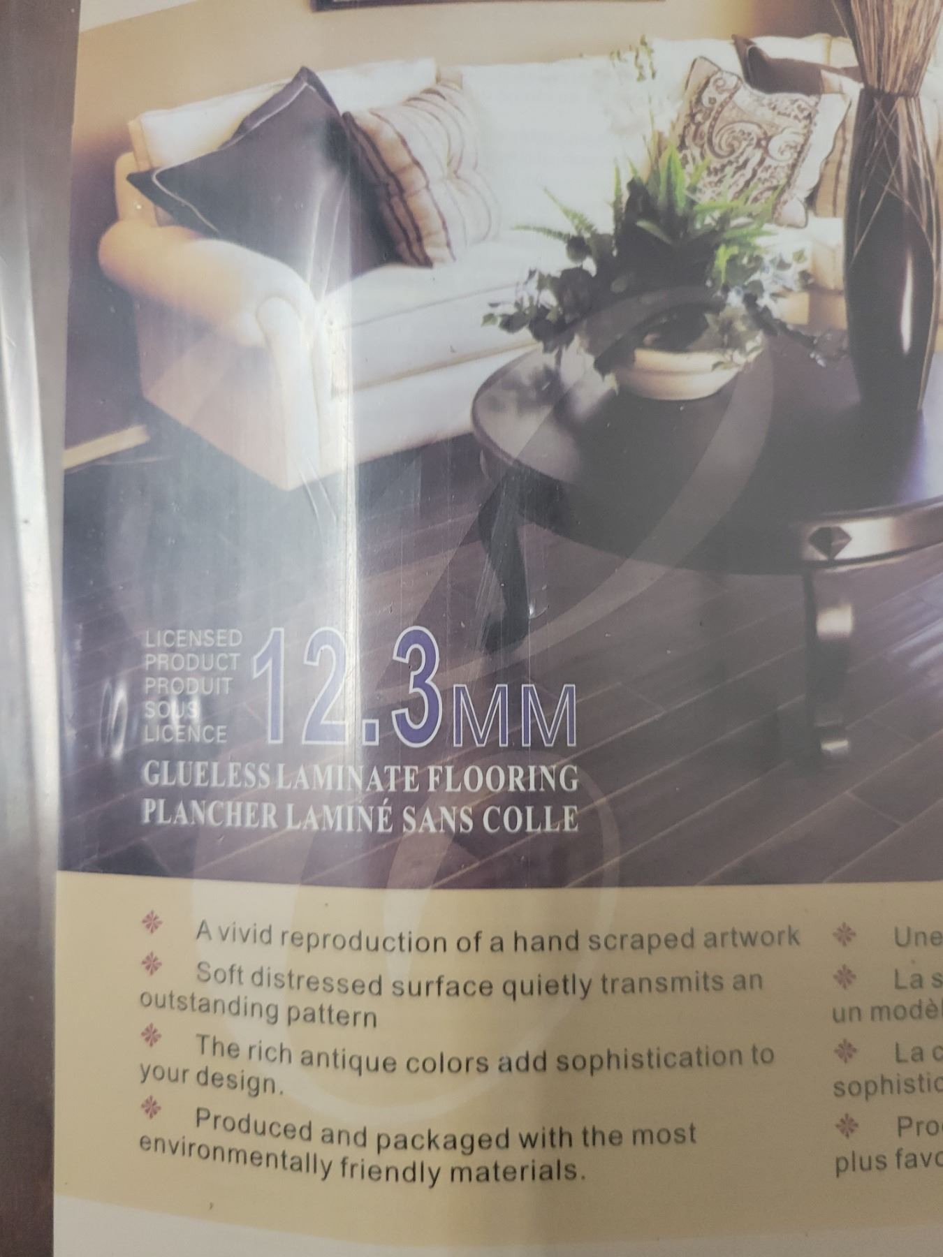 One box of 12.3 mm glueless laminate flooring 12 pieces, 22 square feet