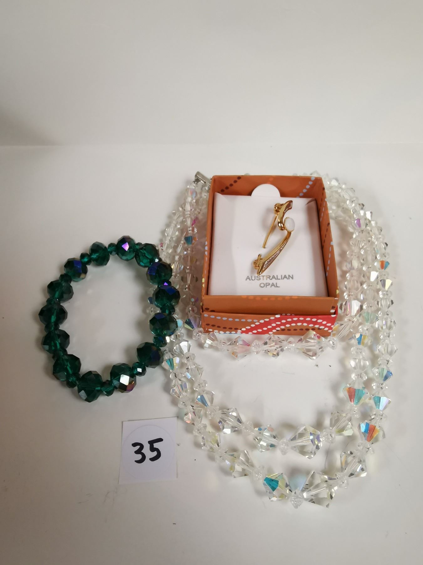 Opal brooch and crystal necklace and bracelet